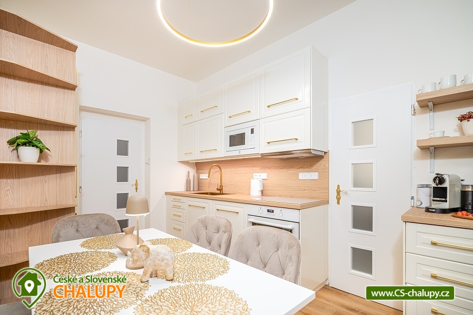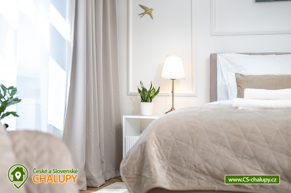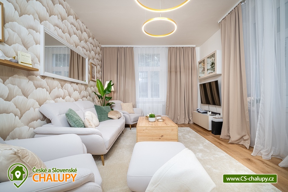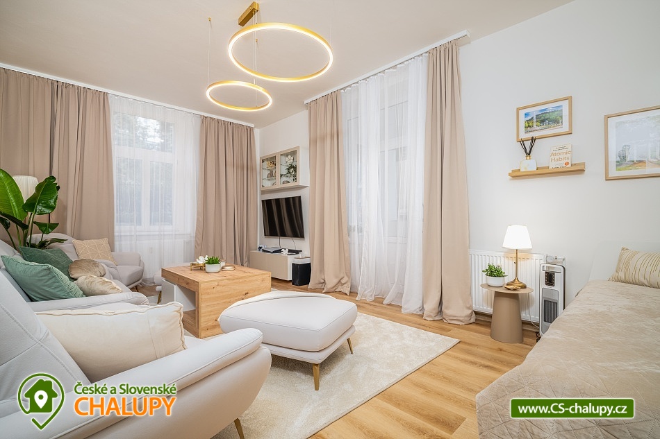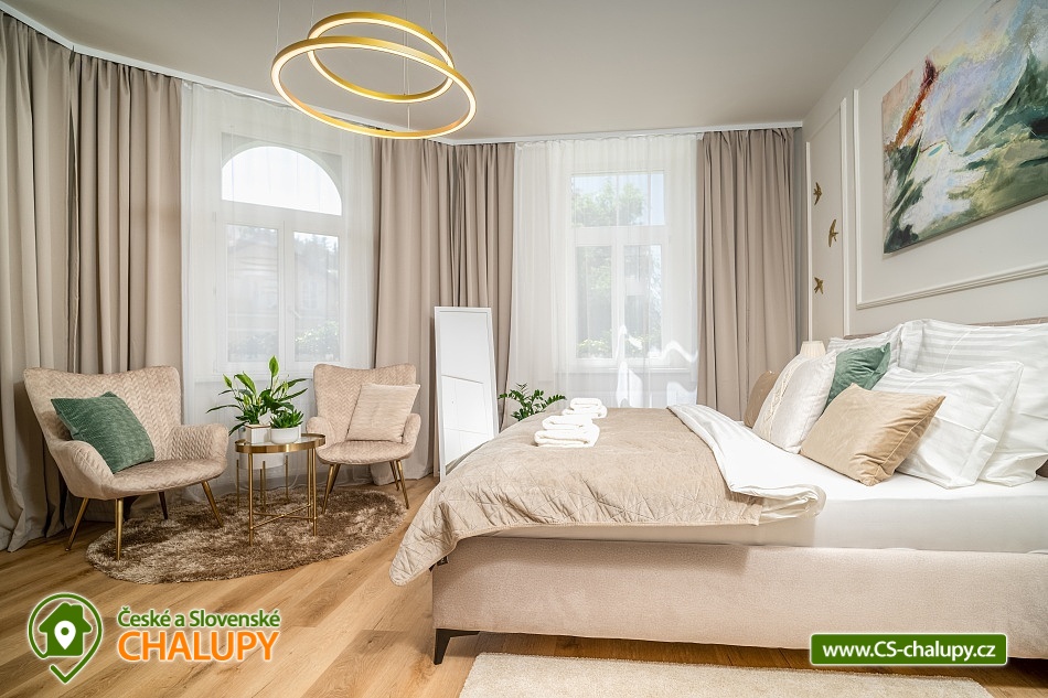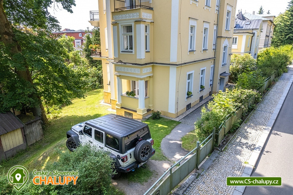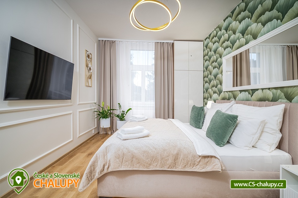 Luxury apartment by the colonnade with private parking - Mariánské Lázně. The apartment can accommodate up to 6 people in 2 bedrooms. The spacious and fully equipped apartment offers peace, comfort and style - ideal for families, couples and individuals who want to fully enjoy Mariánské Lázně. Everything is prepared so that you feel at home. DESCRIPTION: Bedroom - Two bedrooms with large and comfortable double beds offer a peaceful environment for quality sleep. Storage space and a pleasant atmosphere ensure comfort even during a longer stay. Living room with flexible sleeping - The spacious living room is equipped with a comfortable sofa, large TV, PS5, books and toys for children. You will also find another full-size bed here, which can be used as a couch, single bed or double bed. Kitchen - The modern kitchen is fully equipped: stove, oven, fridge with freezer, dishwasher, microwave, coffee maker, kettle, all dishes and even wine glasses - ready for cooking and dining together. Bathroom & separate toilet - Bathroom with bath and shower, hairdryer, towels and basic hygiene. The toilet is located separately for your greater comfort. Balcony with view + garden = From the living room you can enter a cozy balcony with seating, from which there is a beautiful view of the majestic Esplanade Hotel. In front of the house there is a garden, which offers a pleasant space for relaxation, playing or picnicking. Parking right next to the house - The stay includes a free parking space right next to the house, which ensures maximum comfort upon arrival and daily travel. Basement & sports zone – borrow what you need: In the basement there is a wide range of equipment for you to borrow free of charge: Scooters and electric scooters, Trekking poles, Sports equipment (e.g. badminton, frisbee, balls…) and Children's equipment (bathtub, high chair, toys). You can also use the quiet shared garden, which is directly visible from the apartment – ideal for morning coffee, children's games or relaxation. The whole house is very quiet and peaceful – an ideal environment for relaxation, work or regeneration. We look forward to seeing you here.