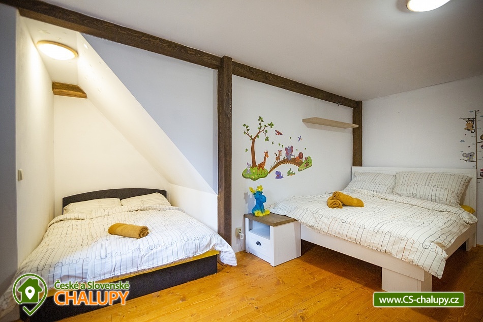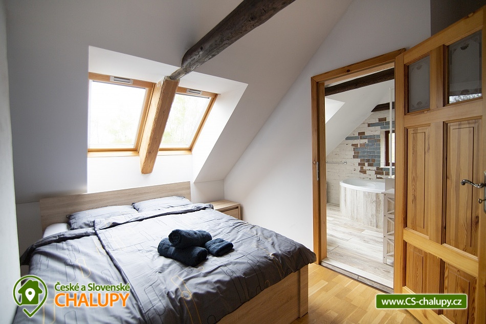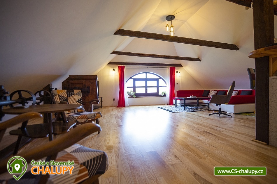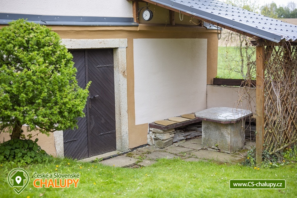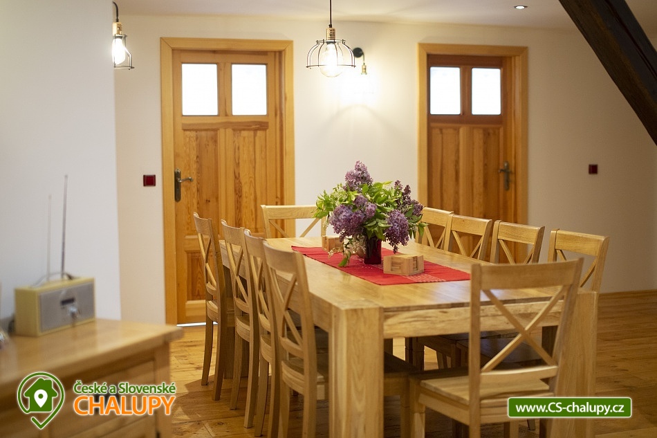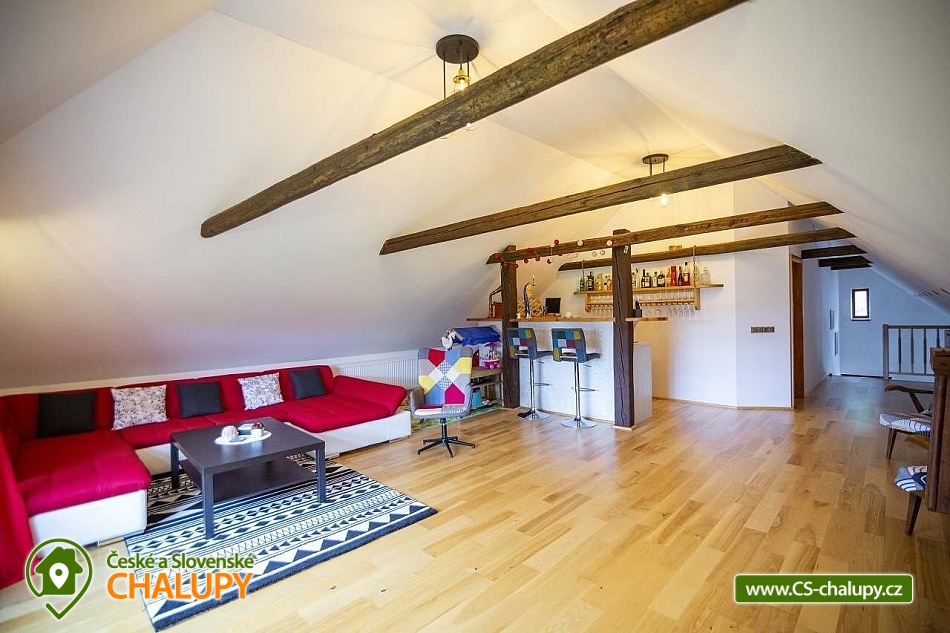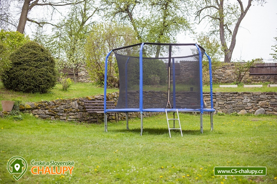 Cottage Bouduv Mlýn - Skuhrov - accommodation Vysočina. The cottage for rent with a capacity of 15 people is located in a secluded area, one kilometer from the village of Skuhrov, Vysočina region. On the first floor of the cottage there are 3 bedrooms (3 x 4 beds), two bathrooms equipped with a shower, toilet and sink. One of the rooms also has a sink directly in the room. A washing machine is also available here. Furthermore, on the first floor there is a fully equipped kitchen, induction hob, oven, fridge, freezer, dishwasher, microwave oven and Dolce Gusto coffee machine. There is also a hall with a dining table and an indoor pellet boiler, where you can relax on sheepskins by the stove. On the second attic floor, there is one room for 3 guests, equipped with its own bathroom, where there is a bathtub, toilet and sink. There are 2 cots available in the building. On this floor there is also a hall with a sitting area, a sofa, an armchair and a small children's corner. There is a fully equipped bar (fridge, freezer, induction two-burner hob, sink and tap equipment. There is also a smart TV in the living room. All rooms are equipped with their own TV. There is Wi-Fi connection in the building. On the ground floor it is possible use the table tennis table. The large yard has a fire pit, an outdoor brick smokehouse and several places to sit. There is a trampoline, a children's swing, a children's playhouse and a small pool (for the summer season). In the deep woods here, you can not only mushroom picking, but you can also discover a well with healing water here. You can visit, for example: Lipnice nad Sázavou (16 km) with its castle, the grave of Jaroslav Hašek, or take a walk in the local forests. Havlíčkův Brod (9 km), with its historic walls and the museum of Karel Havlíček Borovský. Humpolec (27 km), here you can visit the local brewery Bernard, with an observation tower or the nearby ruins of the Orlík castle. Žďár nad Sázavou (37 km), here you can find Zelená hora, a UNESCO monument, Pilák recreation area or, for example, Žďár castle above Sázava. We look forward to seeing you here.