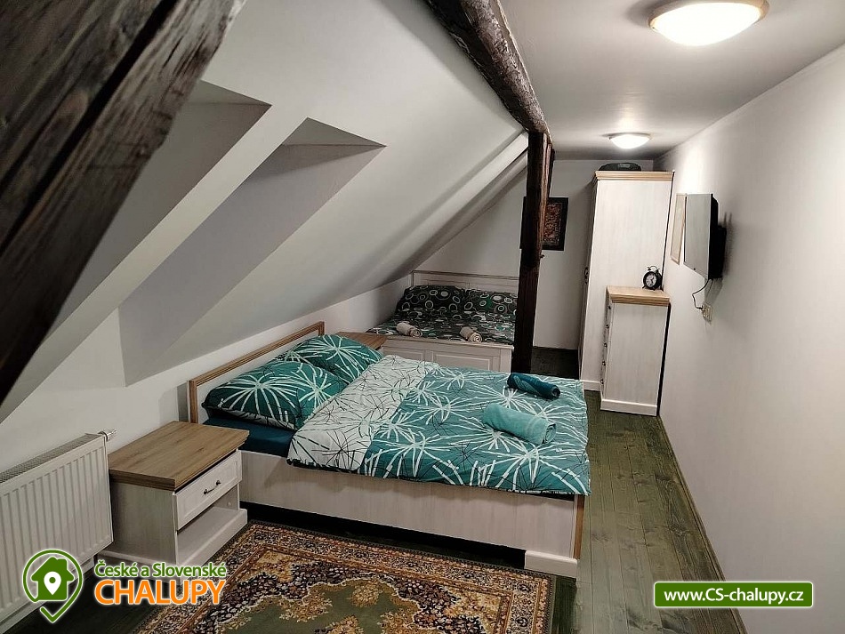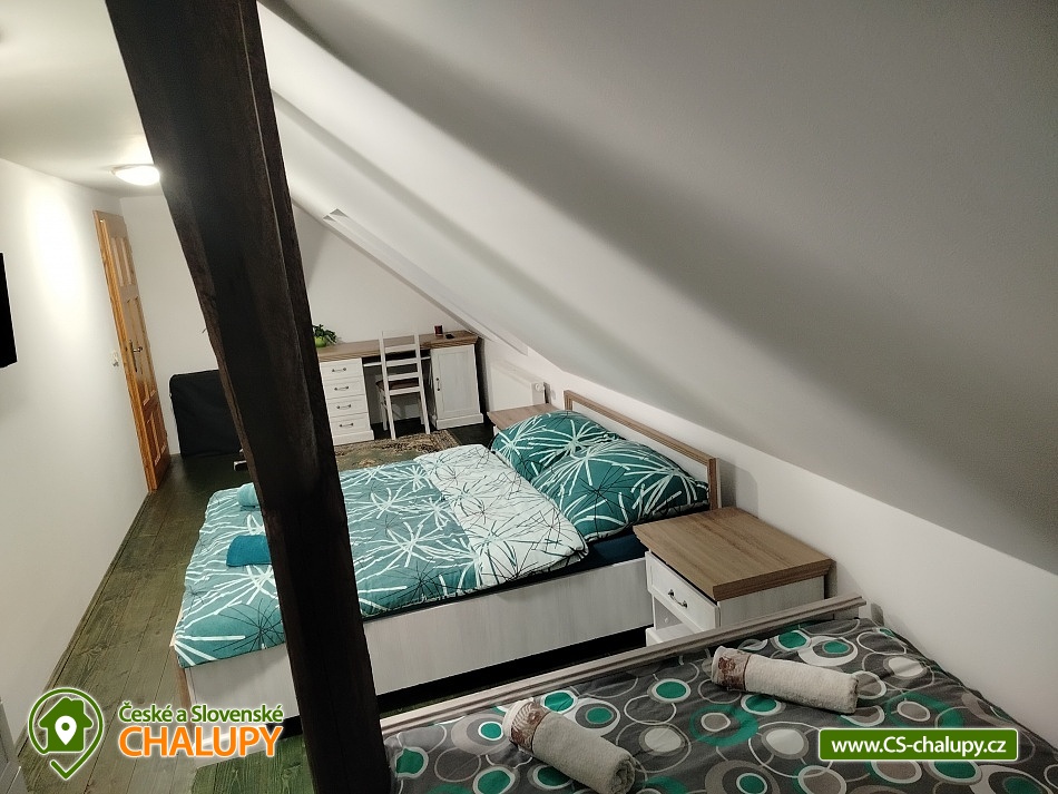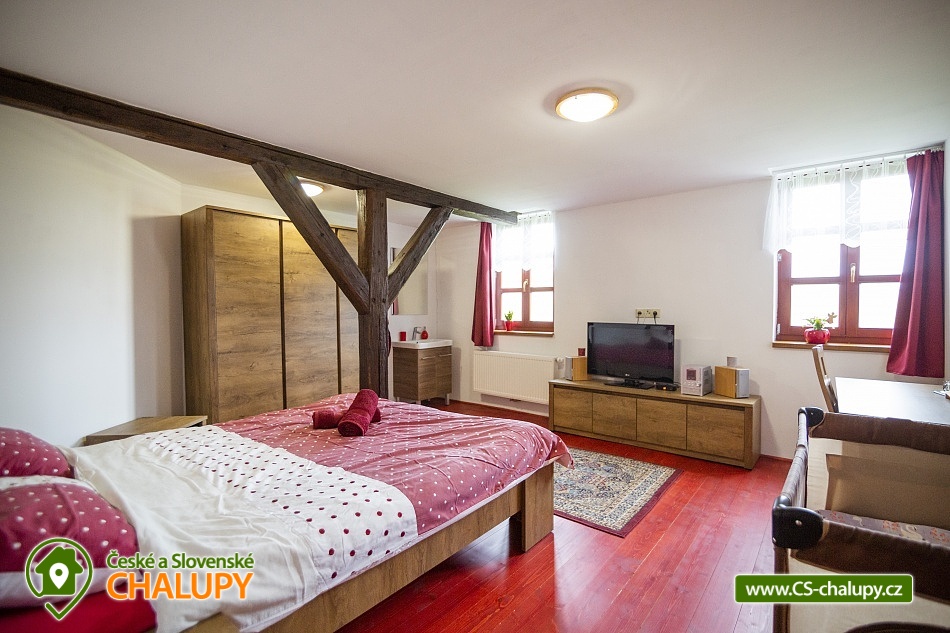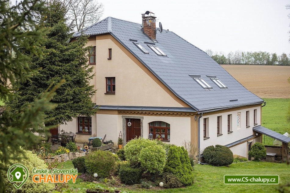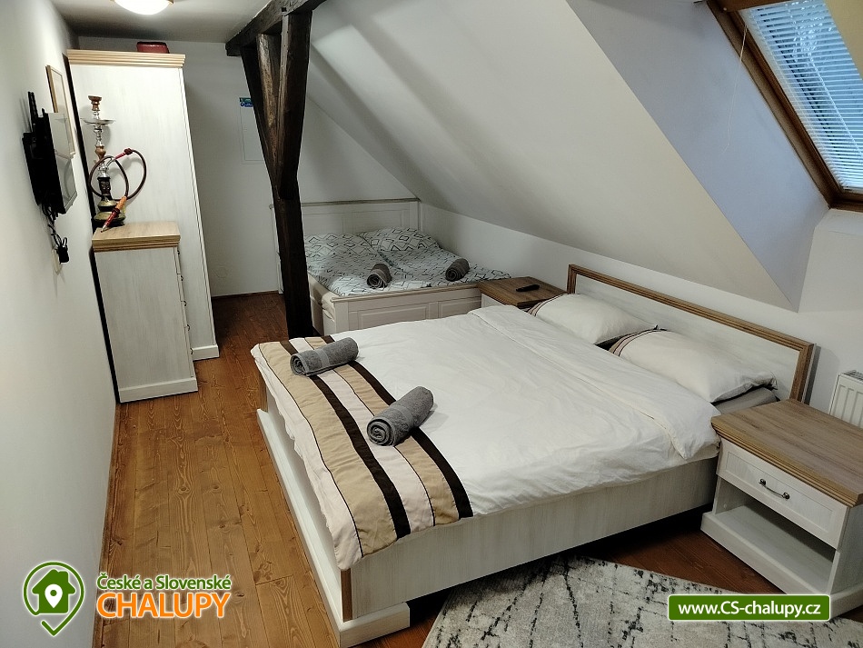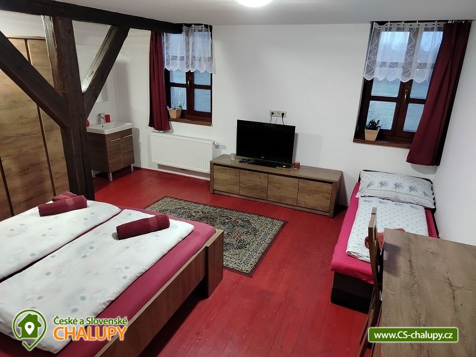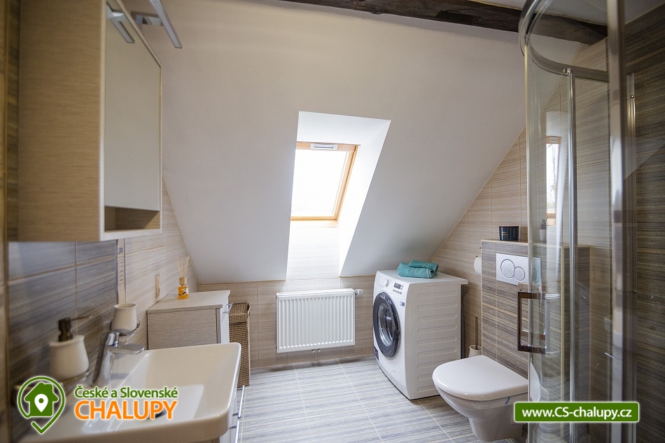 Cottage Bouduv Mlýn - Skuhrov - accommodation Vysočina. The cottage for rent with a capacity of 15 people is located in a secluded area, one kilometer from the village of Skuhrov, Vysočina region. On the first floor of the cottage there are 3 bedrooms (3 x 4 beds), two bathrooms equipped with a shower, toilet and sink. One of the rooms also has a sink directly in the room. A washing machine is also available here. Furthermore, on the first floor there is a fully equipped kitchen, induction hob, oven, fridge, freezer, dishwasher, microwave oven and Dolce Gusto coffee machine. There is also a hall with a dining table and an indoor pellet boiler, where you can relax on sheepskins by the stove. On the second attic floor, there is one room for 3 guests, equipped with its own bathroom, where there is a bathtub, toilet and sink. There are 2 cots available in the building. On this floor there is also a hall with a sitting area, a sofa, an armchair and a small children's corner. There is a fully equipped bar (fridge, freezer, induction two-burner hob, sink and tap equipment. There is also a smart TV in the living room. All rooms are equipped with their own TV. There is Wi-Fi connection in the building. On the ground floor it is possible use the table tennis table. The large yard has a fire pit, an outdoor brick smokehouse and several places to sit. There is a trampoline, a children's swing, a children's playhouse and a small pool (for the summer season). In the deep woods here, you can not only mushroom picking, but you can also discover a well with healing water here. You can visit, for example: Lipnice nad Sázavou (16 km) with its castle, the grave of Jaroslav Hašek, or take a walk in the local forests. Havlíčkův Brod (9 km), with its historic walls and the museum of Karel Havlíček Borovský. Humpolec (27 km), here you can visit the local brewery Bernard, with an observation tower or the nearby ruins of the Orlík castle. Žďár nad Sázavou (37 km), here you can find Zelená hora, a UNESCO monument, Pilák recreation area or, for example, Žďár castle above Sázava. We look forward to seeing you here.