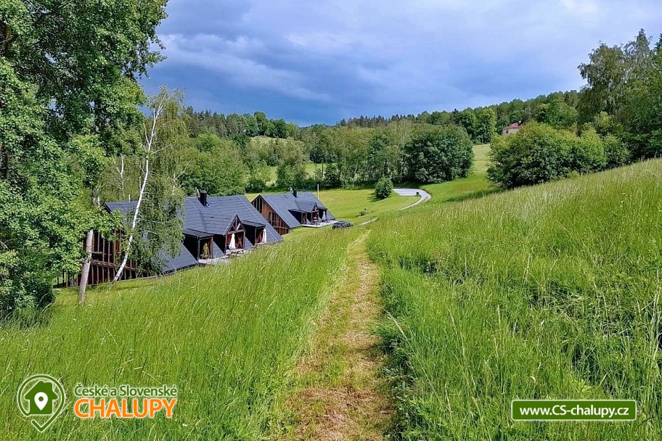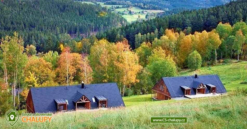 Dvě luxusní chalupy Šumava s koupacím jezírkem se nachází na samotě u lesa u obce Dlouhá Ves, poloha nad řekou Otavou. Jedná se o dvě samostatné chalupy umístěné na pozemku o velikosti 1,5ha a vzdálené 80 m od sebe. Každá chalupa se skládá ze dvou zcela oddělených stejných mezonetových apartmá o rozloze 125 m2 s terasami (40 m2). Každé apartmá má vlastní vchod, nesdílí s druhým apartmá žádnou společnou zeď a je zcela samostatné. Soukromí všech hostů je zajištěno. Luxusní Chalupy nabízí ubytování pro až 20 osob ve 4 samostatně pronajímaných apartmánech. Každé apartmá má k dispozici kapacitu pro 5 osob ve dvou ložnicích umístěných ve spodním patře. Všechny ložnice jsou vybavené úložnými prostory, velmi komfortními postelemi a lůžkovinami. Na každé posteli jsou speciální 5 cm masážní podložky, díky kterým se opravdu dobře vyspíte. První ložnice je dvoulůžková (1 x manželská postel) a druhá ložnice třílůžková (1x manželská postel + 1x jednolůžko). Obě ložnice mají kvalitní postele. Po domluvě možné dvě přistýlky řešené rozkládací pohovkou v spacím koutě, který není oddělený dveřmi. Dětskou postýlku lze zajistit. Součástí všech apartmánů je v patře umístěná velká, světlá obývací místnost, ve které je k dispozici pohovka, křesla, stolek, LED TV a jídelní stůl pro 6 osob. Po domluvě lze zajistit jídelní židličku. Skrz velká okna s proskleným štítem si lze užívat krásný ničím nerušený výhled do panenské přírody. Obývací místnost je spojená s plně vybavenou kuchyní (varná indukční deska, myčka nádobí, moderní trouba, kávovar a digestoř). Z této místnosti lze také vstoupit na jižní dřevěnou terasu umístěnou na úrovni terénu s posezením a slunečníkem. K zapůjčení jsou lehátka. Každý apartmán má také zastřešený balkon s krásným výhledem. Sociální zařízení v jednom apartmánu zahrnuje jednu koupelnu se dvěma umyvadly, přebalovacím pultem a vchodem do oddělené sprchy. Dále je k dispozici jedno WC u obývacího prostoru a jedno WC ve spodním patře s ložnicemi. K zapůjčení jsou ručníky, osušky, povlečení, utěrky a náhradní peřiny. Vytápění je řešeno nejmodernějším kotlem na peletky. Dále je k dispozici bojler 500 litrů pro jednu chalupu na teplou vodu. Objekt má také vlastní studnu s kvalitní vodou a vlastní čističku. V celém objektu je k dispozici WIFI připojení na internet. Kolem chalupy se rozléhá travnatá zahrada, kde je možné relaxovat nebo si lze také užívat společné koupací jezírko. Obě chalupy mají také vnitřní společný zastřešený prostor, kde je možné sedět např. za deště, s výhledem do krajiny přes prosklenou střechu. V každé chalupě je pro dvě apartmá k dispozici jeden gril. Posedět lze u ohniště. Pro všechny ubytované děti je k dispozici pískoviště a trampolína. Parkovat lze 30 metrů od chalup. Pro výklad zavazadel lze přijet až k chalupě. V okolí chalup možnost turistiky, cykloturistiky, koupání, houbaření, rybaření, lyžování a běžkování. V blízkosti je také jízdárna. Mezi možnosti koupání patří např.: aquapark Sušice, koupaliště Hartmanice, koupaliště Sušice, koupaliště Petrovice u Sušice, lom Čimické jezírko, rybník Bušek, Úbislavický rybník, koupaliště Rohanov, rybník Zdíkovec, rybník Valcha, koupaliště Kvilda, Přírodní koupaliště Žabáky, atd. V zimním období jsou k dispozici blízká lyžařská střediska: Hartmanice, Kašperské Hory, Nezdice a další. K výletům v okolí láká okolí řeky Otavy, Vyhlášený skleněný oltář Dobrá Voda, Kašperské Hory, hrady Kašperk, Velhartice a Rabí či Krásná ZOO Lohberg. Těšíme se na Vás u nás.