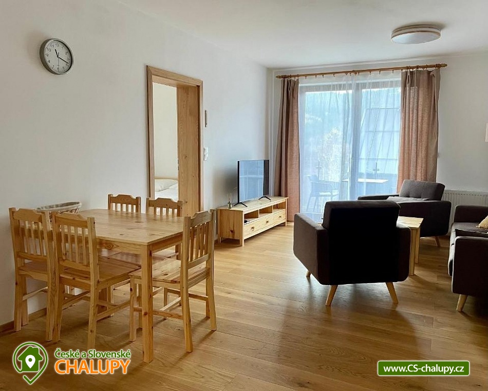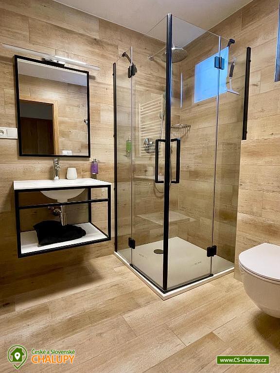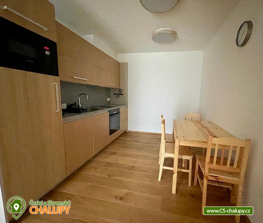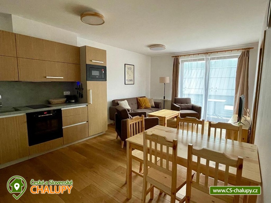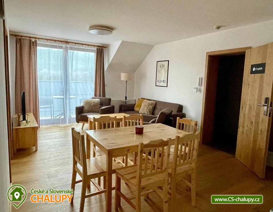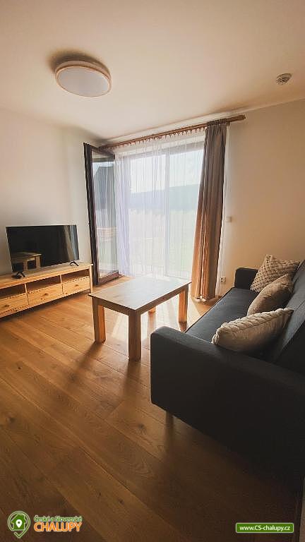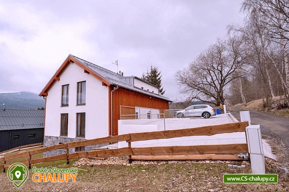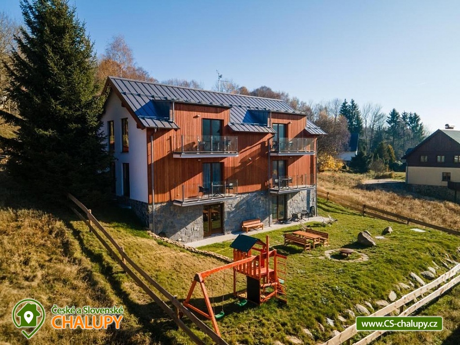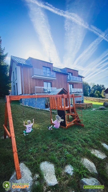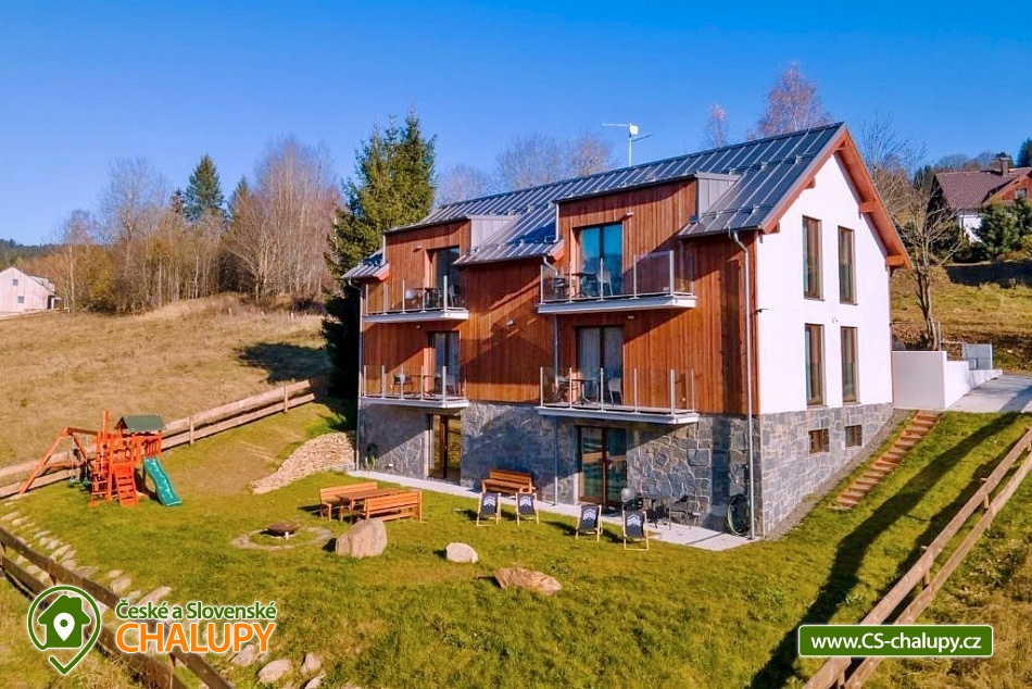 Alpalouka cottage near the Black Lake and the Natural Monument of the Royal Forest near the town of Železná Ruda in the Šumava Mountains. The capacity of the cottage is up to 20 people in 4 apartments. Description - All apartments have a living room with a kitchen and 2 bedrooms (1 room with a double bed and the second room with 2 separate beds), bathroom (shower and toilet), balcony/terrace. Fully equipped kitchens in each apartment - microwave, kettle, coffee maker, blender, hob and oven. Sanitary facilities - All apartments have a bathroom (shower and toilet), the toilet is also located in the common room. Heating - Each apartment has radiators with thermostats. TV is in all apartments and in the common room. There is also a ski room and there is a fireplace, outdoor seating and a children's playground in the garden of the cottage. Parking - 6 parking spaces at the cottage. The cottage is located on a quiet hill, surrounded by spruce trees, which create a magical atmosphere of peace and harmony with nature. The surroundings offer activities both in summer and winter. Both for lazy people and sports enthusiasts. Everyone will find something for themselves here. Cycling - cycle paths in the area, do not hesitate to go across the border to Bavaria. Lohber Zoo, Ludwigstahl Zoo, Aquapark - Osserbad. Fairytale trail - the beginning of the trail is 2.4 km from the cottage or you can take the train to "Hojsova Stráž - Brčálník" and start the trail there and end at the cottage. Also hiking trips: to Čertovo Lake and Černé Lake. In winter - Skiing from the cottage. Špičák Ski Resort, Pancíř Ski Resort, Nad nádražím Ski Resort. The Alpalouka ski resort is right next to the cottage. We look forward to seeing you there.
