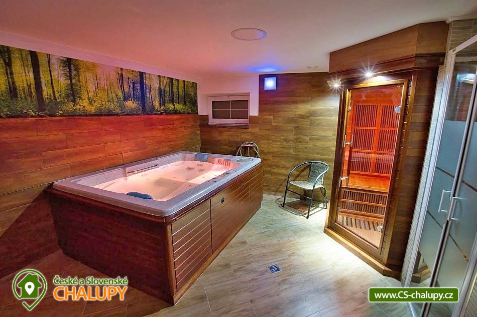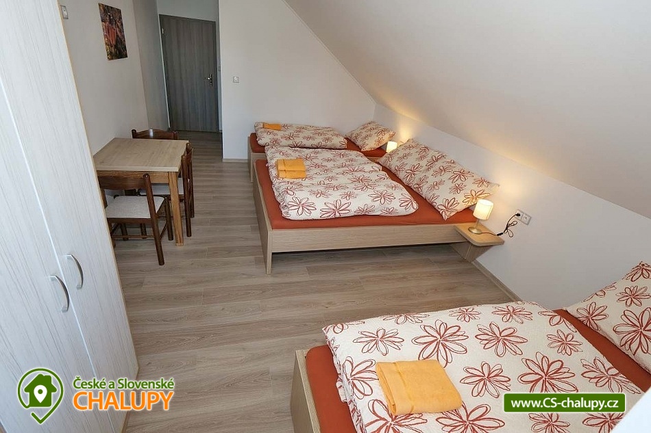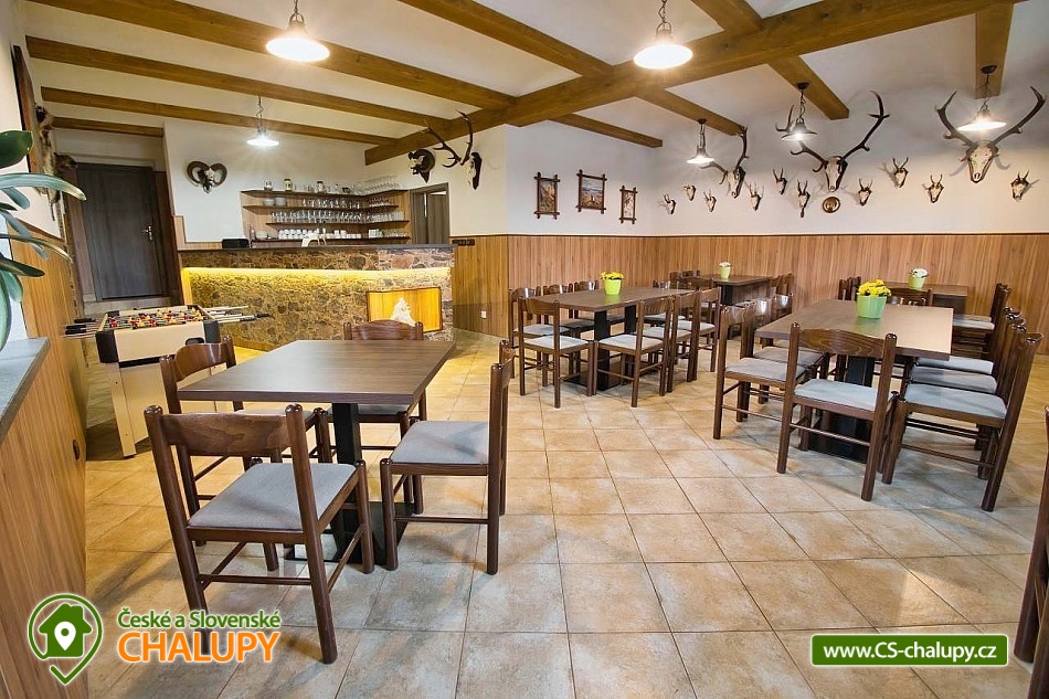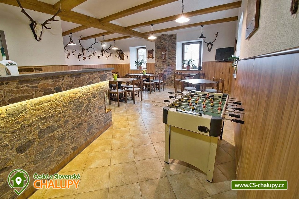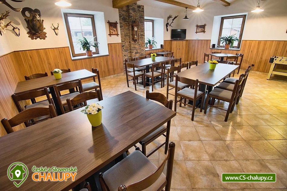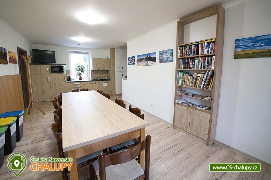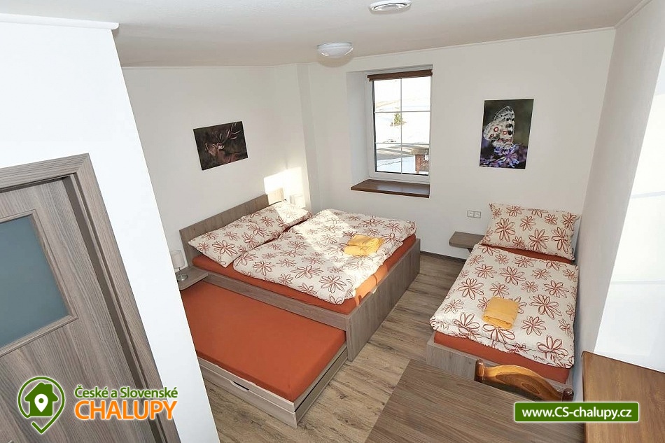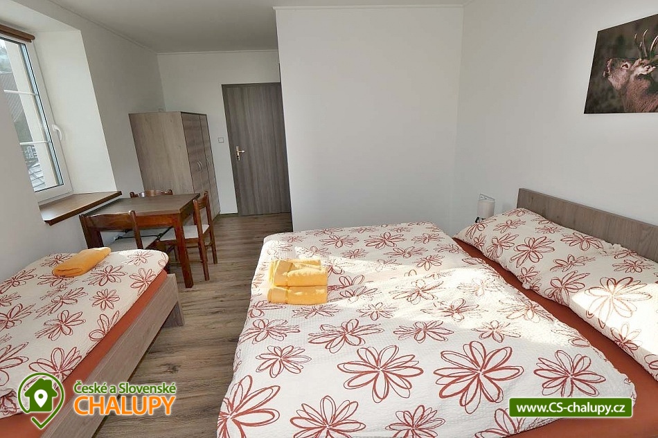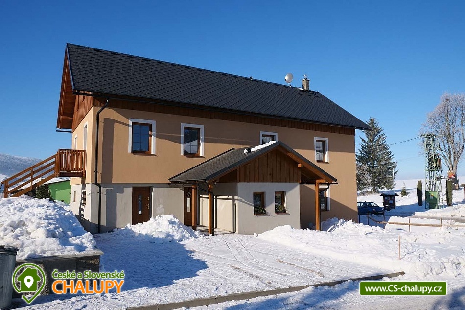 The U Jelena house with wellness and outdoor pool is located in a quiet and pleasant environment in the small village of Šanov near Červené Vody in the Orlické Mountains, near the town of Králíky. Due to its location, it offers a lot of options for spending time actively or just relaxing. In winter, the close proximity of the ski areas SKI areál Šanov, Skipark Červená Voda and Resort Dolní Morava and several tens of kilometers of cross-country trails is an advantage. The benefit of the village of Šenov is its impassability and thus little car traffic. The three-storey House U Jelena provides accommodation for 18 people in 4 bedrooms with private bathroom facilities. There are a total of 14 fixed beds and 4 extra beds with a full-size pull-out bed. On the first floor there are two triple bedrooms with an extra bed (1x double bed with pull-out bed and 1x single bed). On the second floor, there are two four-bed bedrooms with an extra bed (1x double bed, 1x single bed with pull-out bed and 1x single bed). The rooms also include a wardrobe and a table with chairs. A cot is available for rent. There is a large common room on the ground floor with a bar and taproom, 32 seats, TV, Xbox Kinect and table football. The ground floor also includes a large, fully equipped kitchen (microwave oven, convection oven, ceramic hob, extractor fan, dishwasher, 2x kettle, 2x fridge, large sink and dining service for approx. 35 people). The ground floor is entered through an entrance hall with a shoe rack and a room for sports equipment. Upstairs, you can spend time in the second smaller common room with 10 seats, TV, radio and a fully equipped kitchen (fridge, microwave oven, ceramic hob and sink). You can relax in the relaxation zone with sauna and whirlpool. WIFI internet connection is available throughout the building. The sanitary facilities include one bathroom in each room with a shower corner with a thermostatic battery, a toilet, a sink, a mirror, a heating ladder and a fan. The large common room has separate men's and women's toilets. Heating is provided by a heat pump with underfloor heating. A central recuperation unit takes care of the air supply and cleanliness here. In the grassy garden there is a spacious covered terrace with seating and a barbecue. In warm weather, the outdoor pool will delight. Children will appreciate the climbing frames with a slide. There is a storage room for bikes and skis. You can park directly at the building. In the vicinity of the building, hiking, cycling, swimming, fishing, mushroom picking, cross-country skiing and skiing are possible. Tennis courts and riding stables are nearby. Swimming options include, for example: Králíky, Štíty - Acrobat Park, Jablonné nad Orlicí swimming pool, Ruda nad Moravou swimming pool, Mezilesí swimming pool, Pastviny dam, Hynčice pod Sušinou - Úžas pond, Šumperk - Bratrušák swimming pool, Letohrad swimming pool, Šumperk pool - Aquacentrum , etc. In winter, nearby ski resorts are available: Šanov, Červená Voda - Buková hora, Ovaz Výprachtice, Turek, Dolní Morava - Větrný vrch and others. The Králíky Museum of Military Technology, the Hora Matky Boží Hedeč Monastery, the Křížová Hora Lookout, the Suchý vrch Lookout with wellness and restaurant, Dolní Morava - Trail in the Clouds, the Rope Bridge, the Mammoth Roller Coaster, the Mammoth Experience Park and the bobsled track, etc. Hůrka Fortress, Bouda Fortress, Letohrad Biathlon Complex or Lanškroun Castle. We look forward to seeing you here.