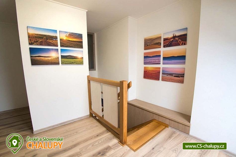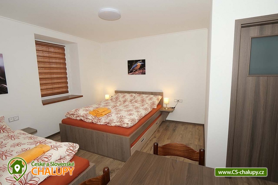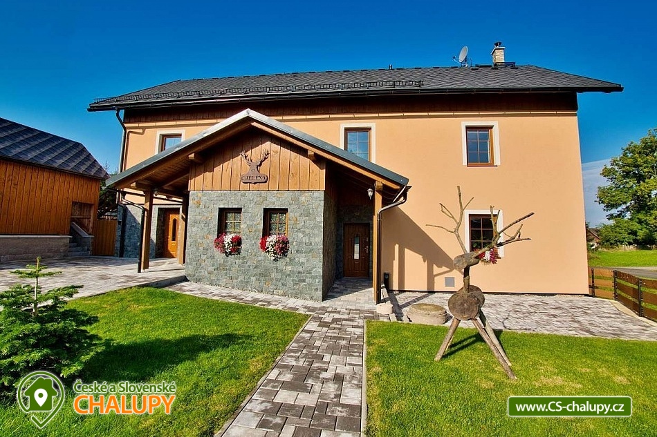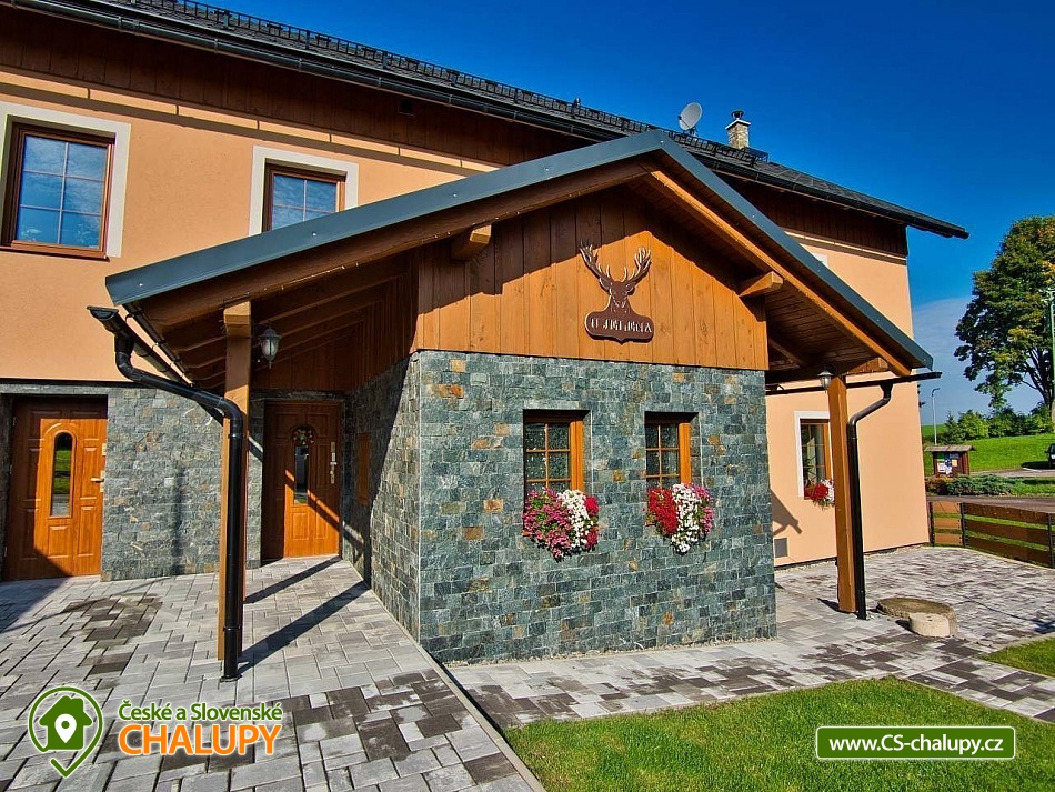 The U Jelena house with wellness and outdoor pool is located in a quiet and pleasant environment in the small village of Šanov near Červené Vody in the Orlické Mountains, near the town of Králíky. Due to its location, it offers a lot of options for spending time actively or just relaxing. In winter, the close proximity of the ski areas SKI areál Šanov, Skipark Červená Voda and Resort Dolní Morava and several tens of kilometers of cross-country trails is an advantage. The benefit of the village of Šenov is its impassability and thus little car traffic. The three-storey House U Jelena provides accommodation for 18 people in 4 bedrooms with private bathroom facilities. There are a total of 14 fixed beds and 4 extra beds with a full-size pull-out bed. On the first floor there are two triple bedrooms with an extra bed (1x double bed with pull-out bed and 1x single bed). On the second floor, there are two four-bed bedrooms with an extra bed (1x double bed, 1x single bed with pull-out bed and 1x single bed). The rooms also include a wardrobe and a table with chairs. A cot is available for rent. There is a large common room on the ground floor with a bar and taproom, 32 seats, TV, Xbox Kinect and table football. The ground floor also includes a large, fully equipped kitchen (microwave oven, convection oven, ceramic hob, extractor fan, dishwasher, 2x kettle, 2x fridge, large sink and dining service for approx. 35 people). The ground floor is entered through an entrance hall with a shoe rack and a room for sports equipment. Upstairs, you can spend time in the second smaller common room with 10 seats, TV, radio and a fully equipped kitchen (fridge, microwave oven, ceramic hob and sink). You can relax in the relaxation zone with sauna and whirlpool. WIFI internet connection is available throughout the building. The sanitary facilities include one bathroom in each room with a shower corner with a thermostatic battery, a toilet, a sink, a mirror, a heating ladder and a fan. The large common room has separate men's and women's toilets. Heating is provided by a heat pump with underfloor heating. A central recuperation unit takes care of the air supply and cleanliness here. In the grassy garden there is a spacious covered terrace with seating and a barbecue. In warm weather, the outdoor pool will delight. Children will appreciate the climbing frames with a slide. There is a storage room for bikes and skis. You can park directly at the building. In the vicinity of the building, hiking, cycling, swimming, fishing, mushroom picking, cross-country skiing and skiing are possible. Tennis courts and riding stables are nearby. Swimming options include, for example: Králíky, Štíty - Acrobat Park, Jablonné nad Orlicí swimming pool, Ruda nad Moravou swimming pool, Mezilesí swimming pool, Pastviny dam, Hynčice pod Sušinou - Úžas pond, Šumperk - Bratrušák swimming pool, Letohrad swimming pool, Šumperk pool - Aquacentrum , etc. In winter, nearby ski resorts are available: Šanov, Červená Voda - Buková hora, Ovaz Výprachtice, Turek, Dolní Morava - Větrný vrch and others. The Králíky Museum of Military Technology, the Hora Matky Boží Hedeč Monastery, the Křížová Hora Lookout, the Suchý vrch Lookout with wellness and restaurant, Dolní Morava - Trail in the Clouds, the Rope Bridge, the Mammoth Roller Coaster, the Mammoth Experience Park and the bobsled track, etc. Hůrka Fortress, Bouda Fortress, Letohrad Biathlon Complex or Lanškroun Castle. We look forward to seeing you here.