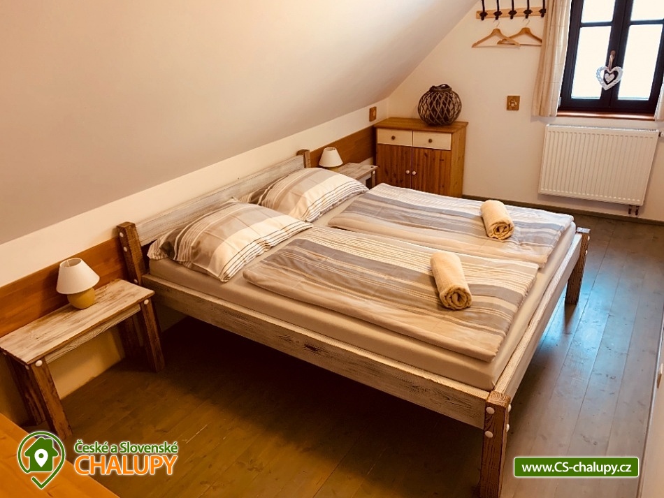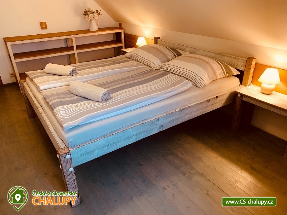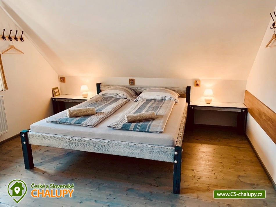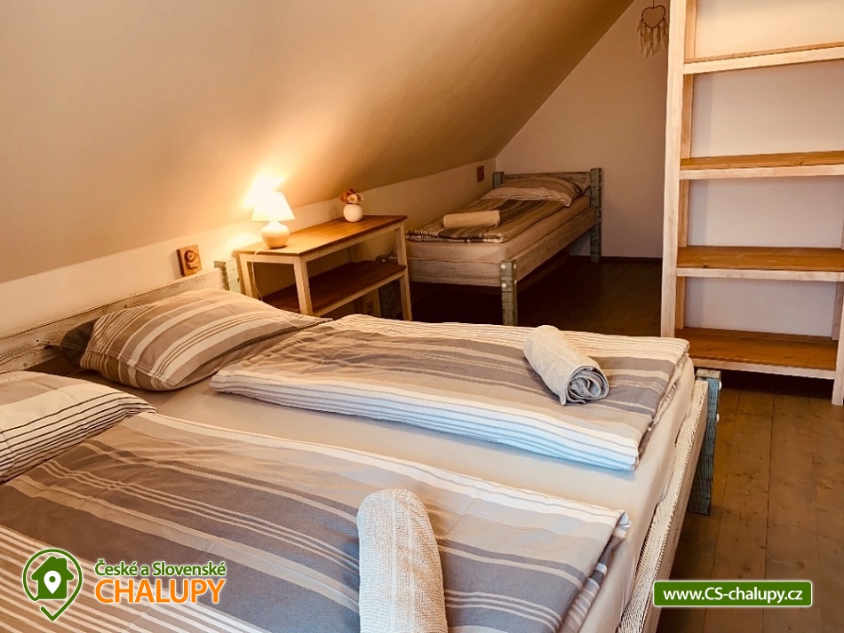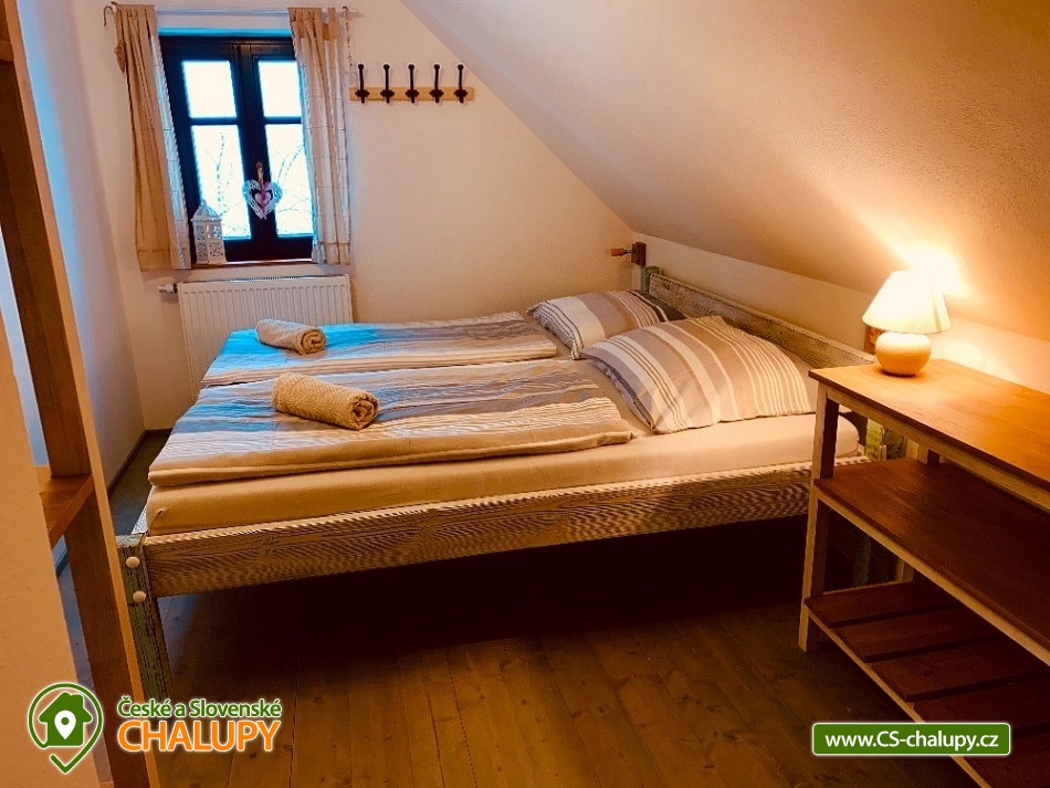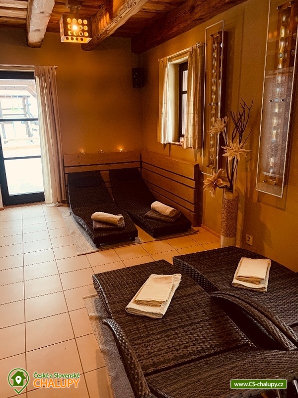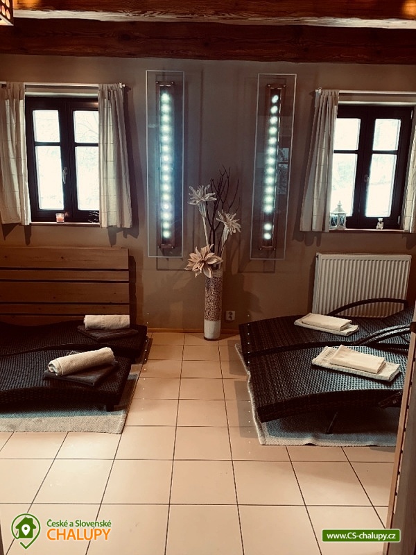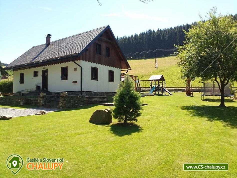 Chalupa s bazénem a saunou Zlaté Hory - Horní Údolí - Rejvíz. Chalupa na prosluněném pozemku v malebné vesničce Horní Údolí v Jeseníkách. Sedm kilometrů od pověstmi opředeného Rejvízu a stejnou vzdálenost od prvního obchodu v městečku Zlaté Hory. Chalupa poskytuje ubytování pro až 9 osob ve 3 ložnicích: pro 2, 3 a 4 osoby. V největší z nich lze před spaním sledovat i televizi. V ložnicích jsou úložné prostory pro vaše oblečení. Po dohodě vám klasické polštáře vyměníme za anatomicky tvarované a pro vaše nejmenší doplníme cestovní postýlku. Srdce chalupy - tak přesně tady, v srdci naší chalupy, se můžete všichni setkávat. Těšit se vůní připravovaného jídla a pití a společně vše ochutnávat u jídelního stolu, sledovat film v televizi, či uklidňující plamen v krbu, lenošit s knížkou v ruce, hrát hry, no prostě vše, co vám udělá radost. Koupelna v horním patře nabízí klasický standard pro hygienu. Příjemná vyhřívaná podlaha, prostorný sprchový kout a jako bonus nádherný výhled z okna na blízký les a třeba i pasoucí se ovečky. Vytápění v naší chalupě je výkonnou krbovou vložkou s výměníkem. Celé spodní patro je navíc vytápěné do podlahy. V podkroví jsou radiátory, které jsou také napojeny na krb. Pokud by jste si nechtěli topit sami v krbu, lze zapnout elektrokotel. U chalupy je venkovní posezení s krbem a dětské hřiště - trampolína, domeček s klouzačkou, houpačky, šipky, badminton, míče, líný tenis, dětské pískoviště se spoustou hraček, ale i houpací síť pro dva. Lenošárna: v příjemné a útulné místnosti můžete relaxovat nejenom po sauně. Relaxační lehátka nabídnou pohodlí i při poslechu hudby či čtení. Ale jsou samozřejmě nedělitelnou součástí saunování ve finské sauně pro 4 osoby. K dispozici je ochlazovací vědro ve velikém sprchovém koutě a východ přímo na terasu, na čerstvý vzduch. Stejně jako celé spodní patro chalupy, má i lenošárna vyhřívanou podlahu. Procházky lesem, výlety za zajímavostmi okolí, za kterými stojí za to se vracet i několikrát, cyklistické a běžecké tratě, ve kterých se najde každý, rodinné lyžařské vleky v blízkém okolí; veřejné wellness, dvě bowlingové dráhy, hřiště na tenis i fotbálek ve vedlejší vesničce Dolní Údolí. V blízkém i vzdálenějším okolí najdete řadu turisticky zajímavých míst. Například Zlatorudné mlýny s naučnou stezkou „Údolí ztracených štol“ (7 km), rozhlednu na Biskupské kupě (15 km), poutní místo Panny Marie Pomocné (12 km) či Rejvíz s naučnou stezkou k Mechovému jezírku (8 km).
