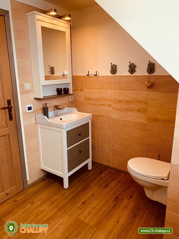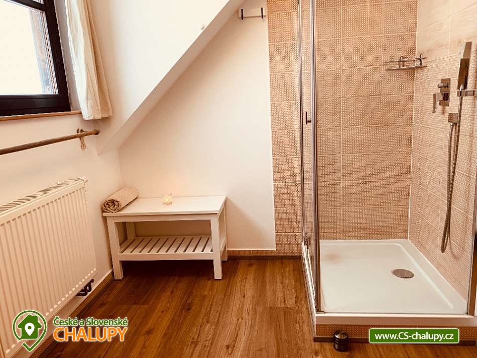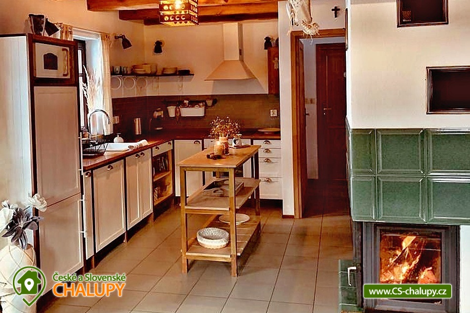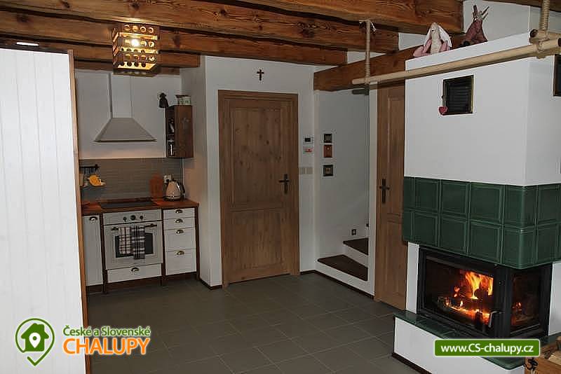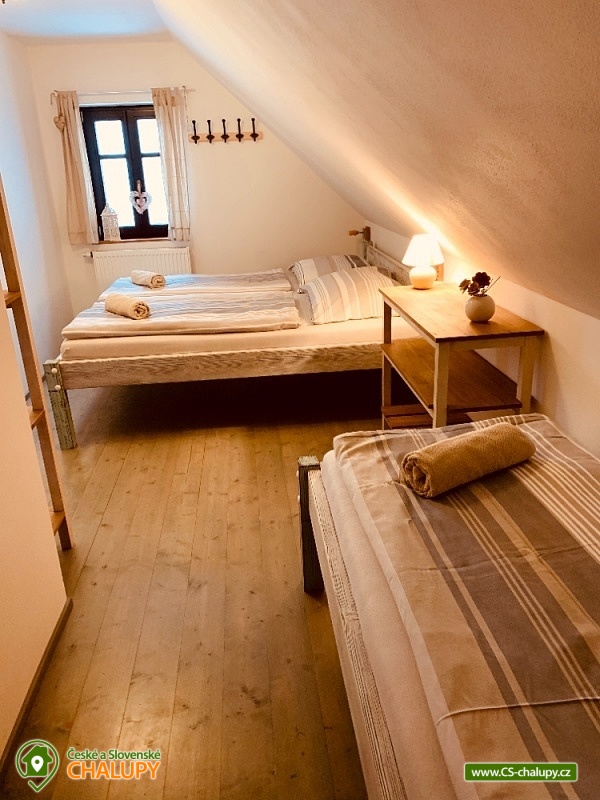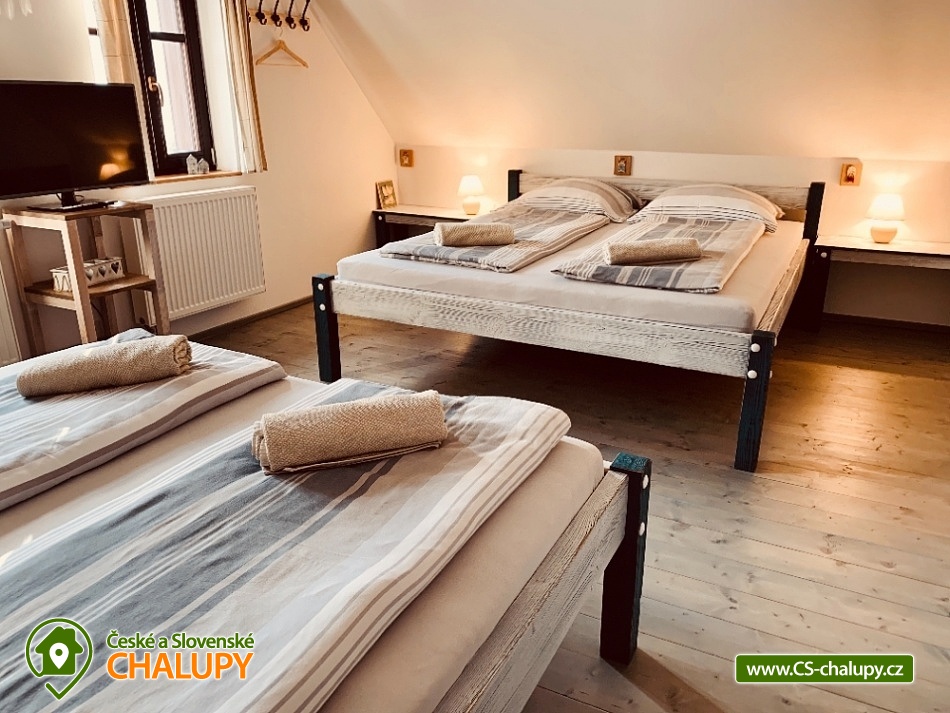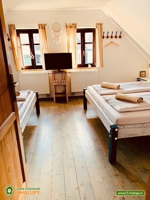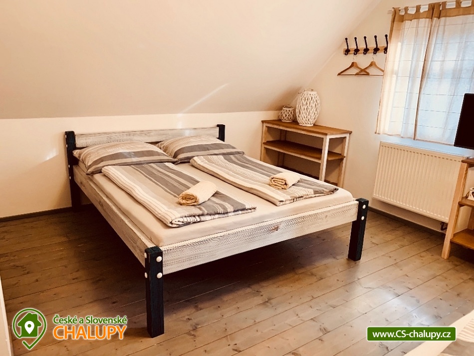 Chalupa s bazénem a saunou Zlaté Hory - Horní Údolí - Rejvíz. Chalupa na prosluněném pozemku v malebné vesničce Horní Údolí v Jeseníkách. Sedm kilometrů od pověstmi opředeného Rejvízu a stejnou vzdálenost od prvního obchodu v městečku Zlaté Hory. Chalupa poskytuje ubytování pro až 9 osob ve 3 ložnicích: pro 2, 3 a 4 osoby. V největší z nich lze před spaním sledovat i televizi. V ložnicích jsou úložné prostory pro vaše oblečení. Po dohodě vám klasické polštáře vyměníme za anatomicky tvarované a pro vaše nejmenší doplníme cestovní postýlku. Srdce chalupy - tak přesně tady, v srdci naší chalupy, se můžete všichni setkávat. Těšit se vůní připravovaného jídla a pití a společně vše ochutnávat u jídelního stolu, sledovat film v televizi, či uklidňující plamen v krbu, lenošit s knížkou v ruce, hrát hry, no prostě vše, co vám udělá radost. Koupelna v horním patře nabízí klasický standard pro hygienu. Příjemná vyhřívaná podlaha, prostorný sprchový kout a jako bonus nádherný výhled z okna na blízký les a třeba i pasoucí se ovečky. Vytápění v naší chalupě je výkonnou krbovou vložkou s výměníkem. Celé spodní patro je navíc vytápěné do podlahy. V podkroví jsou radiátory, které jsou také napojeny na krb. Pokud by jste si nechtěli topit sami v krbu, lze zapnout elektrokotel. U chalupy je venkovní posezení s krbem a dětské hřiště - trampolína, domeček s klouzačkou, houpačky, šipky, badminton, míče, líný tenis, dětské pískoviště se spoustou hraček, ale i houpací síť pro dva. Lenošárna: v příjemné a útulné místnosti můžete relaxovat nejenom po sauně. Relaxační lehátka nabídnou pohodlí i při poslechu hudby či čtení. Ale jsou samozřejmě nedělitelnou součástí saunování ve finské sauně pro 4 osoby. K dispozici je ochlazovací vědro ve velikém sprchovém koutě a východ přímo na terasu, na čerstvý vzduch. Stejně jako celé spodní patro chalupy, má i lenošárna vyhřívanou podlahu. Procházky lesem, výlety za zajímavostmi okolí, za kterými stojí za to se vracet i několikrát, cyklistické a běžecké tratě, ve kterých se najde každý, rodinné lyžařské vleky v blízkém okolí; veřejné wellness, dvě bowlingové dráhy, hřiště na tenis i fotbálek ve vedlejší vesničce Dolní Údolí. V blízkém i vzdálenějším okolí najdete řadu turisticky zajímavých míst. Například Zlatorudné mlýny s naučnou stezkou „Údolí ztracených štol“ (7 km), rozhlednu na Biskupské kupě (15 km), poutní místo Panny Marie Pomocné (12 km) či Rejvíz s naučnou stezkou k Mechovému jezírku (8 km).
