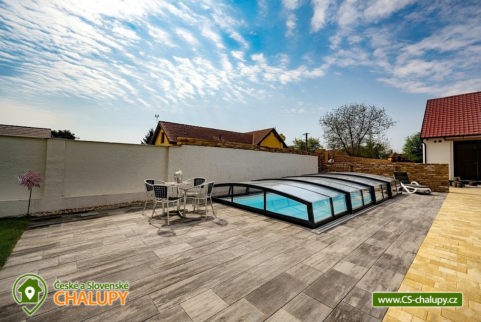 Cottage with a swimming pool, sauna and wine cellar in a wine-growing area near the Pavlovské vrchy, Dyje and Mušovské jezery (Upper Nové Mlýny Reservoir) is located in the picturesque wine-growing village of Jevišovka. The cottage offers a quiet environment for relaxing moments at the cottage and active exploration of South Moravia on foot or by bike. The capacity of the cottage is up to 16 people in 2 buildings - The accommodation is divided into two separate buildings within one closed area, which ensures plenty of space and privacy. The main cottage (up to 8 people) offers two rooms for four people. The little house (up to 8 people) in the yard has two rooms for three people, with the possibility of renting another double room for an additional fee. All rooms are equipped with a private bathroom with toilet and flat-screen TV, Wi-Fi connection is available throughout the building. Guests have access to a fully equipped kitchen with a dishwasher, oven, microwave, refrigerator, kettle and coffee maker. The cottage also includes a picturesque wine cellar, which creates a pleasant setting for evening gatherings with a glass of wine. In the summer months, guests will appreciate the outdoor pool, an enclosed courtyard with seating, a grill or fireplace, and a children's playground with swings and a slide. At the back of the property is a newly renovated EXPERIENCE BARN in a rustic style. It includes seating for 16 people, a fully equipped kitchen (running water, sink, refrigerator, dishwasher, dishes). For the colder months, there is the option of soaking in a fireplace turbo stove and there is also a Finnish sauna. For active guests, there is a lockable bike storage room. The surroundings of the Cottage offer ideal conditions for actively spending time in nature and relaxing trips around South Moravia. Thanks to its location in a quiet wine-growing area, cyclists, hiking enthusiasts, and water activities will find their way here. Whether you prefer rides through the vineyards, hiking in nature or a day spent by the water, you will find a number of options in the area that you can easily combine with returning to the comfort and peace of the cottage. Popular excursion destinations: Mikulov Castle, Lednice Castle, Lednice - Valtice Area, Láá An der Thaya Thermal Baths, Aqualand Moravia, water sports - Dyje River, Mušovská Lakes, U křížku Lookout Tower - Drnholec, Pavlov Archeopark, Pálava - Sirotčí hrádek and Děvičky. We look forward to seeing you at our place.