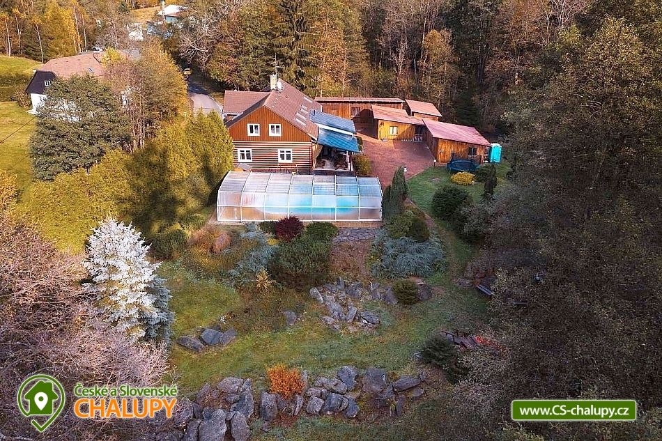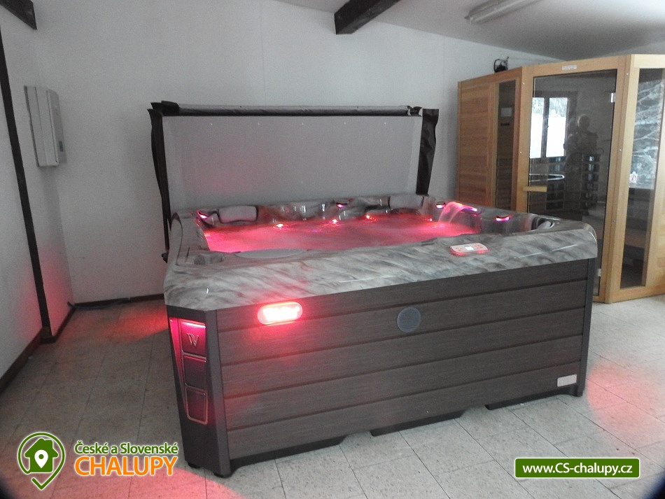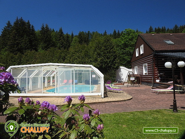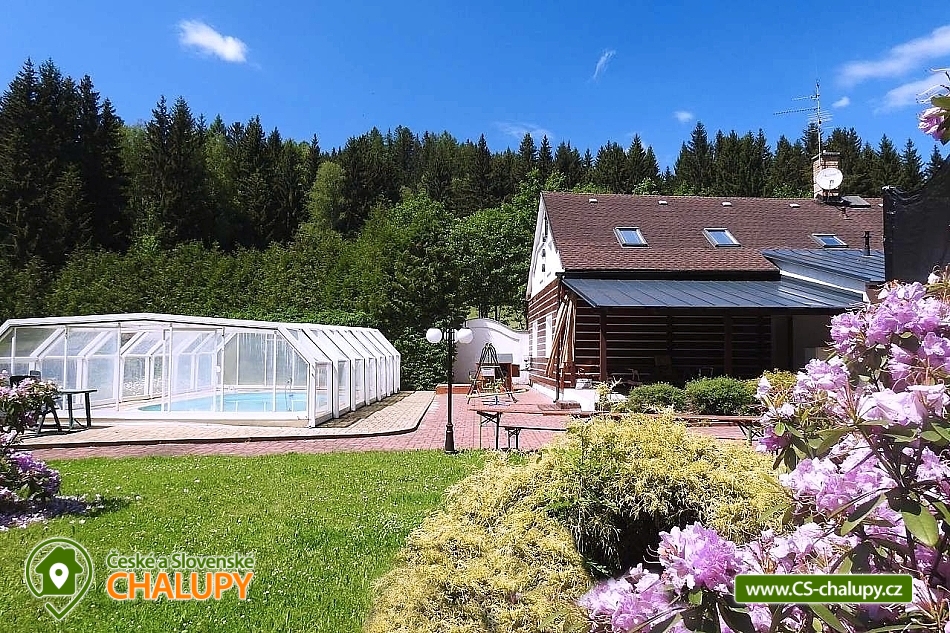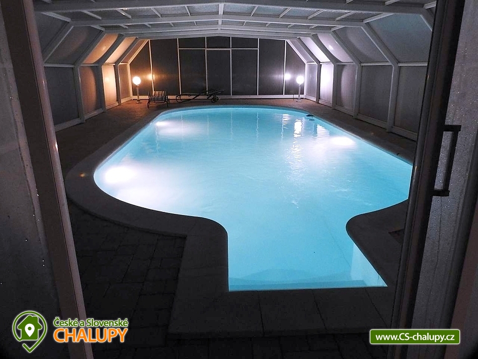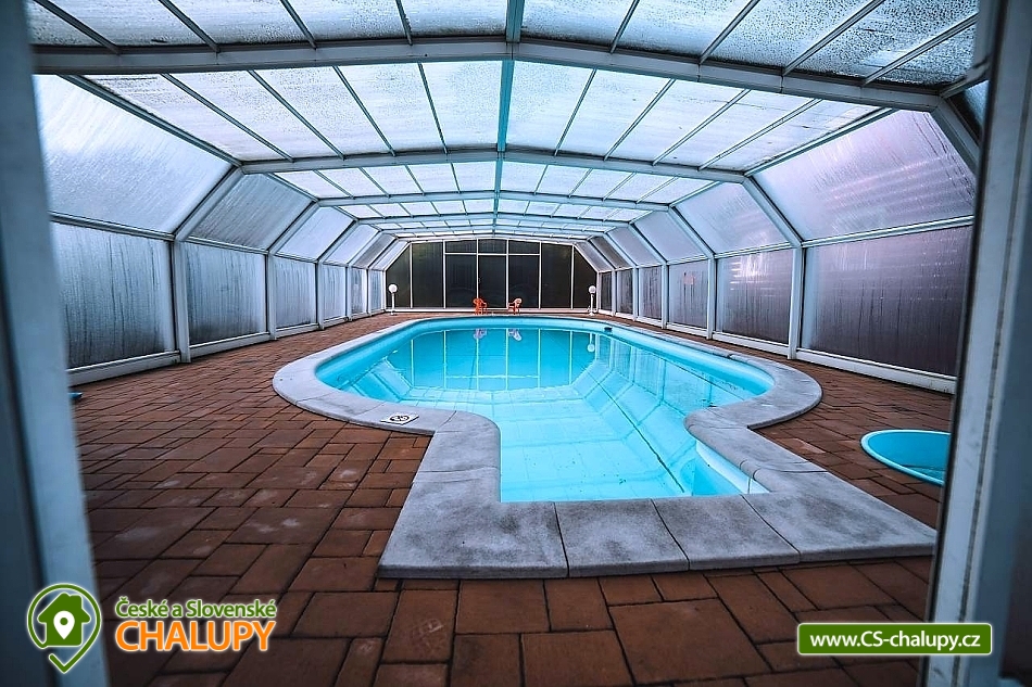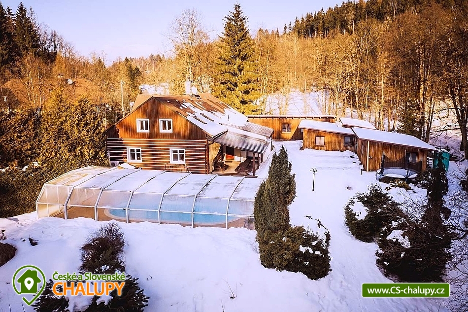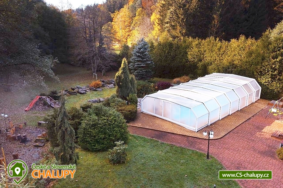 Chalupa s vyhřívaným bazénem a wellness (whirlpool a sauna) se nachází u říčky Olešanka, poloha nedaleko obce Sněžné v krásné přírodě Orlických hor. Skvělé místo pro srazy rodin a přátel, pro rodiny s dětmi i různé oslavy. Kapacita chalupy je až 30 osob v 6 ložnicích. Krytý osvětlený venkovní bazén se slanou vodou 5x10 m s protiproudem a posezením uvnitř (zastřešení 8x14 m). Bazén je vyhříván tepelným čerpadlem - koupání květen až září. POPIS: 1. ložnice 1x dvojlůžko + 2x jednolůžko (max 4 osoby). 2. ložnice 1x dvoulůžko + 1x patrová postel + 1x jednolůžko (max 5 osob). 3. ložnice 1x dvoulůžko, 1x jednolůžko, 1 x rozkládací sedačka (max. 4 - 5 osob). 4. ložnice 1x dvoulůžko, 1x jednolůžko, rozkládací pohovka (max 4 osoby). 5. ložnice 1x dvojlůžko, 2x jednolůžko, 1x patrová postel (max 6 osob). 6. ložnice 1x dvojlůžko, 2x jednolůžko, 1x patrová postel (max 6 osob). Ložnice 1 a 2 a 3 a 4 jsou vybaveny klimatizačními jednotkami neboť jsou v 2 NP, mají samostatný vchod. Ložnice 5 a 6 jsou v 1 NP (druhá 1/2 chalupy), mají také samostatný vchod. 1. NP: zádveří, kuchyň se sporákem, profesionální myčkou, lednicí, mrazákem, párkovačem, kávovarem, mikrovlnkou a vybavením, velká společenská místnost s krbovými kamny. 2 NP: Zádveří, společenská místnost, jídelna, kuchyň, dětský koutek, pračka. Kuchyň: lednice, sporák, mikrovlnka, konvice, topinkovač, stůl, židle. Další 2 lednice a mrazák jsou v přízemí objektu a jedna lednice v párty boudě a jedna ve fitku. Celkem 6 lednic a mrazák. Možnost využití venkovního posezení s ohništěm, grilovačka, venkovní terasa a FIT bouda s ping pongem, posilovacími stroji, saunou, fotbálkem a šipkami. Je zde také knihovna. V párty boudě je možnost uložení kol, jsou zde pivní lavice a stoly, lednice, kuchyňská linka a výčepní zařízení. Pro Vaše děti máme krásné dětské hřiště s houpačkami, pískovištěm, chatičkou, skluzavkou, trampolínou, lanovkou a venkovním fotbálkem. V zahradě je možnost si zahrát nohejbal nebo volejbal. Krytá venkovní terasa s výhledem na bazén a zahradu s přilehlým ostrovem, který je součástí areálu a kde je rybníček. Ostrov je přes říčku propojen lávkou. Parkování přímo v oploceném areálu chalupy pro 8 osobních automobilů. Okolí ideální na turistiku i cykloturistiku - jezdí zde skibus/cyklobus, který vás vyveze až na hřebeny Orlických hor. Výlety na zámky: Opočno 20 km, Náchod 20 km, Nové Město nad Metují 15km, Ratibořice 35 km, Rychnov nad Kněžnou 30 km a Častalovice 30 km. Hrad Frimburg z 13.století na Novém Hrádku 2,5 km. Výlet na rozhlednu v Novém Hrádku nebo v Olešnici v Orlických horách. V zimě potom máte kousek do SKI areálu v Olešnici v Orlických horách nebo do Deštné (10 km), kde je spousta vleků a lanovky. Těšíme se na Vás u nás.