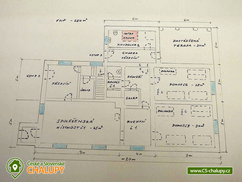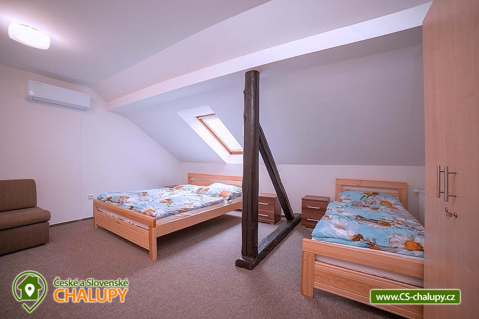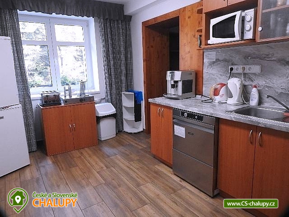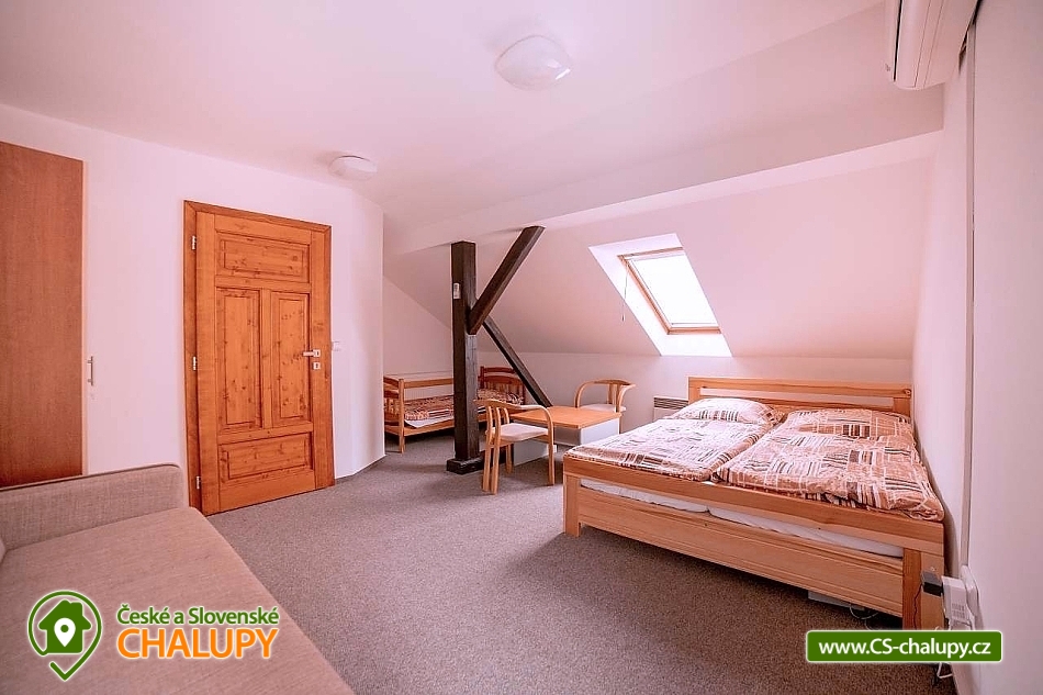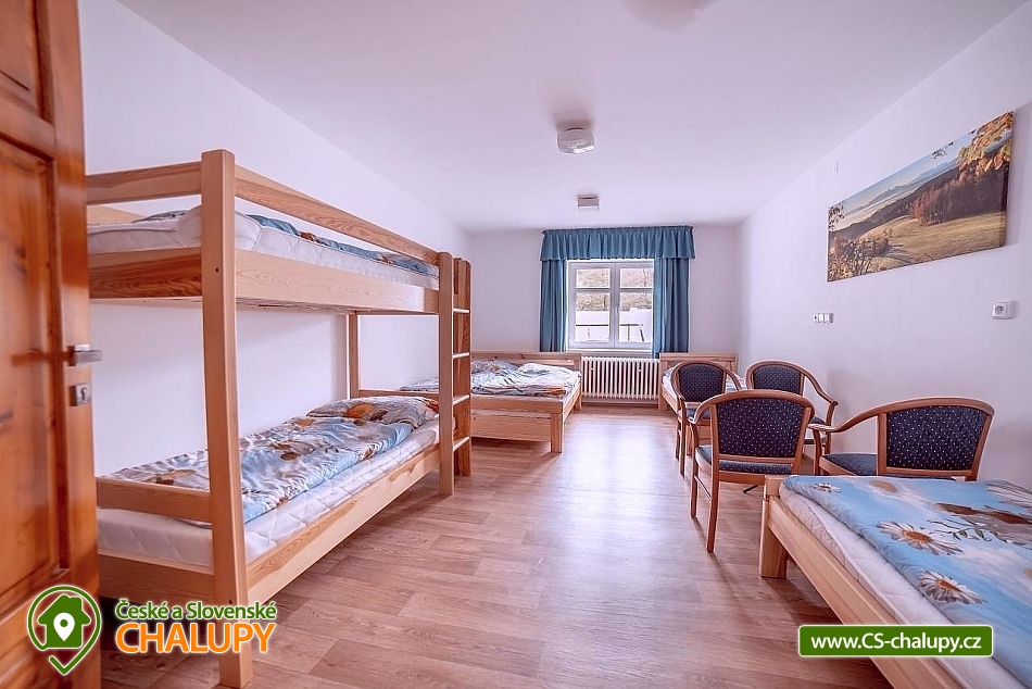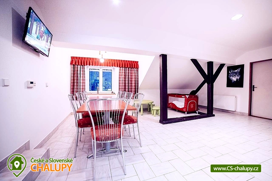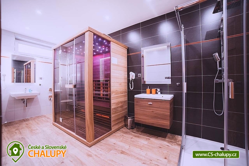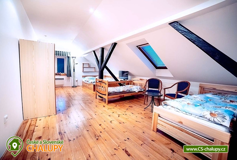 Chalupa s vyhřívaným bazénem a wellness (whirlpool a sauna) se nachází u říčky Olešanka, poloha nedaleko obce Sněžné v krásné přírodě Orlických hor. Skvělé místo pro srazy rodin a přátel, pro rodiny s dětmi i různé oslavy. Kapacita chalupy je až 30 osob v 6 ložnicích. Krytý osvětlený venkovní bazén se slanou vodou 5x10 m s protiproudem a posezením uvnitř (zastřešení 8x14 m). Bazén je vyhříván tepelným čerpadlem - koupání květen až září. POPIS: 1. ložnice 1x dvojlůžko + 2x jednolůžko (max 4 osoby). 2. ložnice 1x dvoulůžko + 1x patrová postel + 1x jednolůžko (max 5 osob). 3. ložnice 1x dvoulůžko, 1x jednolůžko, 1 x rozkládací sedačka (max. 4 - 5 osob). 4. ložnice 1x dvoulůžko, 1x jednolůžko, rozkládací pohovka (max 4 osoby). 5. ložnice 1x dvojlůžko, 2x jednolůžko, 1x patrová postel (max 6 osob). 6. ložnice 1x dvojlůžko, 2x jednolůžko, 1x patrová postel (max 6 osob). Ložnice 1 a 2 a 3 a 4 jsou vybaveny klimatizačními jednotkami neboť jsou v 2 NP, mají samostatný vchod. Ložnice 5 a 6 jsou v 1 NP (druhá 1/2 chalupy), mají také samostatný vchod. 1. NP: zádveří, kuchyň se sporákem, profesionální myčkou, lednicí, mrazákem, párkovačem, kávovarem, mikrovlnkou a vybavením, velká společenská místnost s krbovými kamny. 2 NP: Zádveří, společenská místnost, jídelna, kuchyň, dětský koutek, pračka. Kuchyň: lednice, sporák, mikrovlnka, konvice, topinkovač, stůl, židle. Další 2 lednice a mrazák jsou v přízemí objektu a jedna lednice v párty boudě a jedna ve fitku. Celkem 6 lednic a mrazák. Možnost využití venkovního posezení s ohništěm, grilovačka, venkovní terasa a FIT bouda s ping pongem, posilovacími stroji, saunou, fotbálkem a šipkami. Je zde také knihovna. V párty boudě je možnost uložení kol, jsou zde pivní lavice a stoly, lednice, kuchyňská linka a výčepní zařízení. Pro Vaše děti máme krásné dětské hřiště s houpačkami, pískovištěm, chatičkou, skluzavkou, trampolínou, lanovkou a venkovním fotbálkem. V zahradě je možnost si zahrát nohejbal nebo volejbal. Krytá venkovní terasa s výhledem na bazén a zahradu s přilehlým ostrovem, který je součástí areálu a kde je rybníček. Ostrov je přes říčku propojen lávkou. Parkování přímo v oploceném areálu chalupy pro 8 osobních automobilů. Okolí ideální na turistiku i cykloturistiku - jezdí zde skibus/cyklobus, který vás vyveze až na hřebeny Orlických hor. Výlety na zámky: Opočno 20 km, Náchod 20 km, Nové Město nad Metují 15km, Ratibořice 35 km, Rychnov nad Kněžnou 30 km a Častalovice 30 km. Hrad Frimburg z 13.století na Novém Hrádku 2,5 km. Výlet na rozhlednu v Novém Hrádku nebo v Olešnici v Orlických horách. V zimě potom máte kousek do SKI areálu v Olešnici v Orlických horách nebo do Deštné (10 km), kde je spousta vleků a lanovky. Těšíme se na Vás u nás.