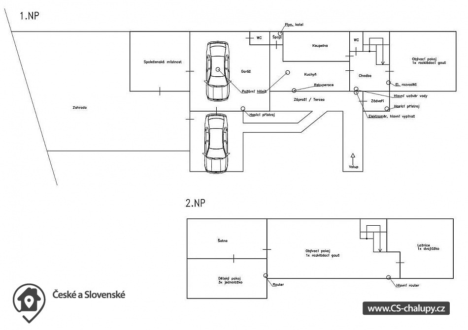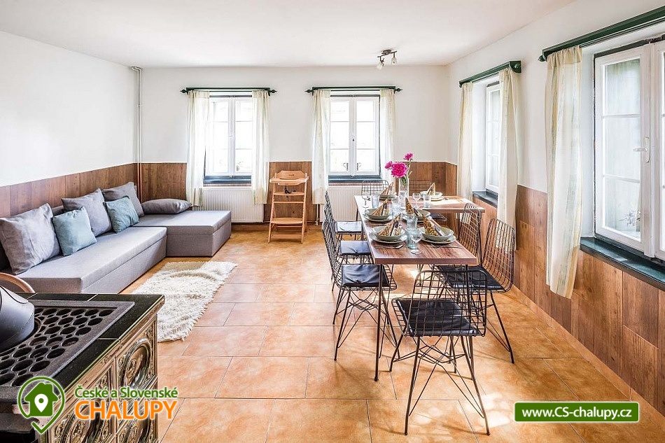 Cottage Český Ráj - Sychrov Chateau - Malá Skála is located in the beautiful surroundings of the Bohemian Paradise. It is located in the village of Odolenovice, part of the municipality of Jenišovice and near the towns of Turnov and Rychnov u Jablonce nad Nisou. The cottage offers accommodation for 9 people in two bedrooms (1 double, 1 triple) and on two sofa beds for 4 people in the living areas. The cottage has two living areas with sofas and a TV. One of them has a tiled stove. There is also a fully equipped kitchen (dishes, refrigerator, freezer, electric oven, gas stove, dishwasher, kettle, microwave, coffee maker, toaster, sandwich maker, immersion blender) and a dining table. There is Wi-Fi access, a cot, a high chair, a washing machine, a hairdryer, a clothes dryer, and towels. The sanitary facilities include a bathroom with a spacious bathtub and a separate toilet. There is another toilet and sink in the garage. The building is heated by a gas boiler and you can heat it with a tiled stove in the living area and a fireplace stove in the wine bar and garage. Parking for 2 cars, one in the garage (where bicycles and a motorbike can also fit) and one on the plot in front of the garage. There is a garden with seating, a fireplace, a grill, a roofed terrace with seating and also a wine bar in the garage, where you can also play ping-pong. The cottage is an ideal place for hiking, cycling, skating, mushroom picking, swimming, skiing down the Jizera River and in winter skiing. Swimming options: Turnov swimming pool, Voděrady swimming pool, Žlutá plovárna - Malá Skála, Výšinka Turnov swimming pool, Obří sud swimming pool - Javorník, Svijanský Újezd swimming pool. Trip tips: Frýdštejn Castle, Sychrov Castle, Malá Skála Pantheon, Suché Skály, Bohemian Paradise, Ještěd, Prachovské Skály, Jizera Mountains. A great advantage of this location is the accessibility of the highway (approx. 1km) towards Prague. Ski resorts in the vicinity: Turnov - Struhy, Obří sud - Javorník, Koberovy - Hamštejn, Kozákov ski resort, Ski Ještěd, Ski Plavy. We look forward to seeing you here.