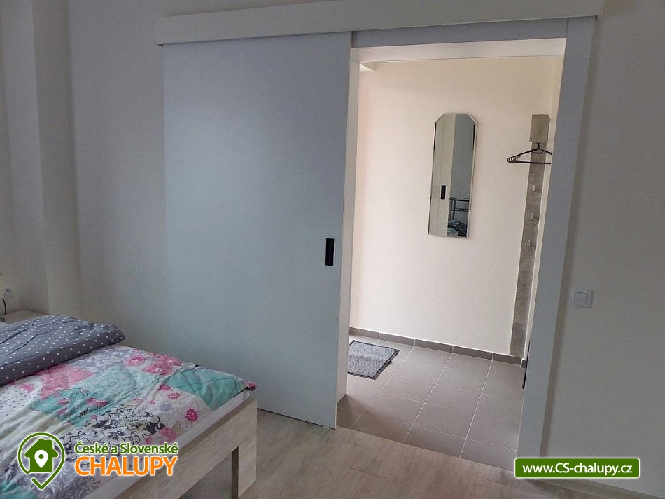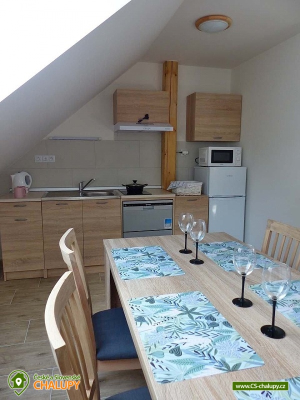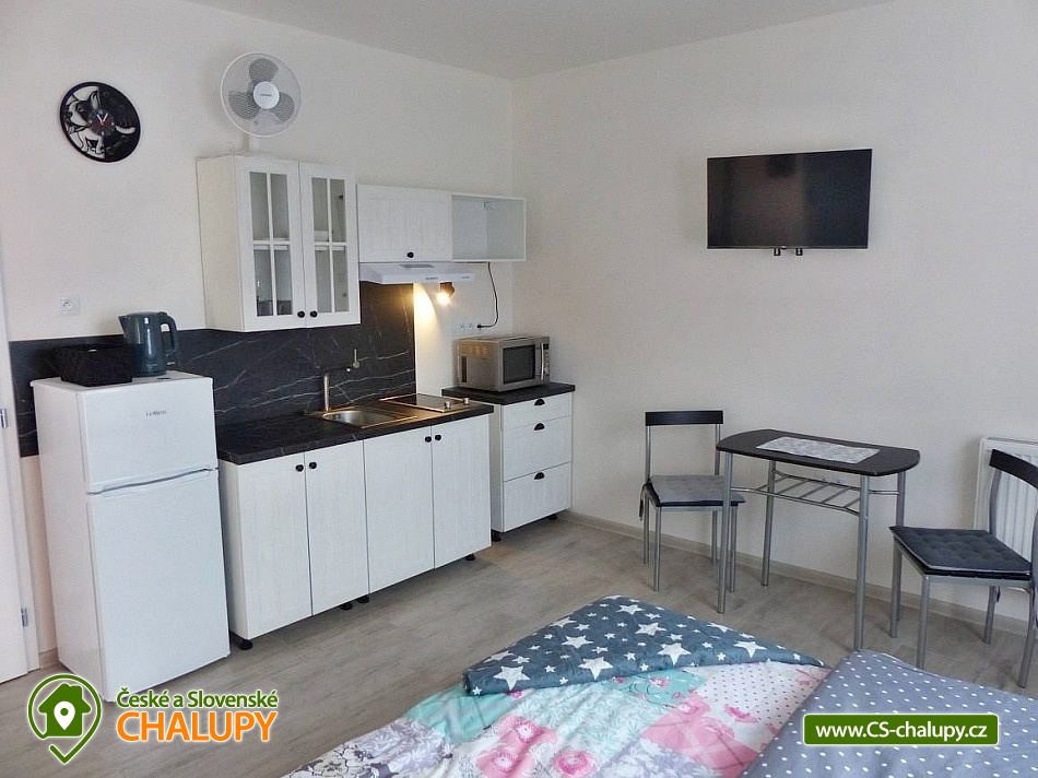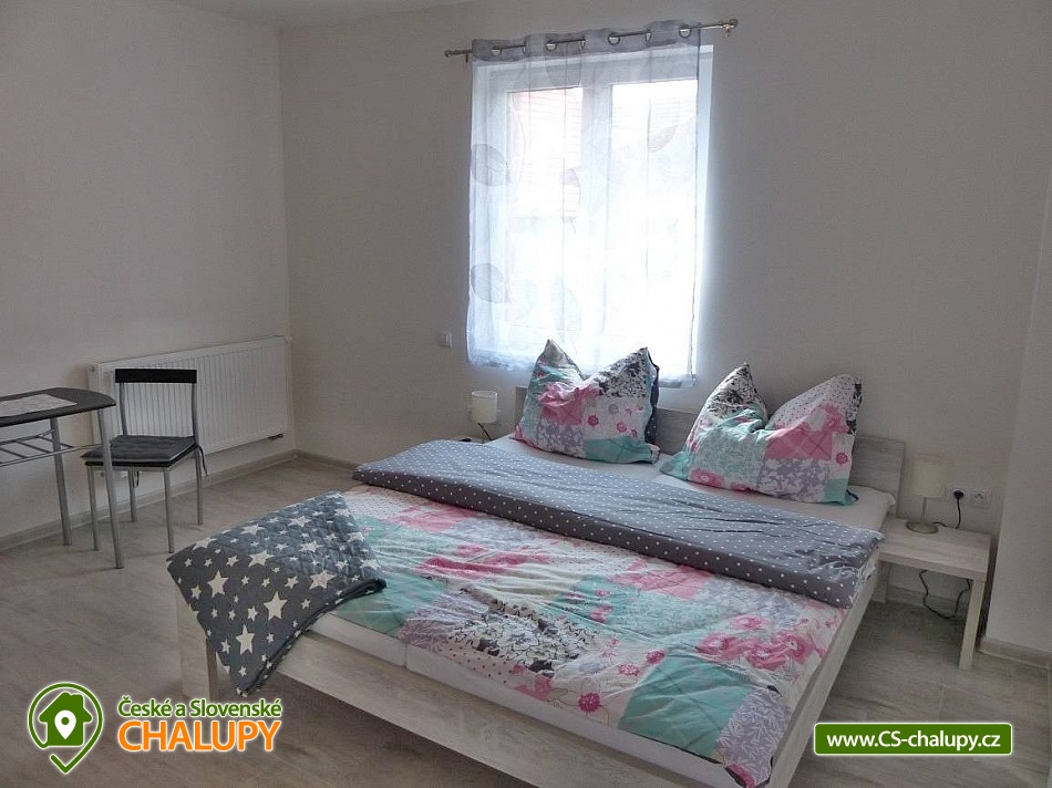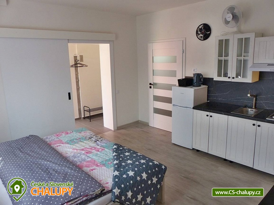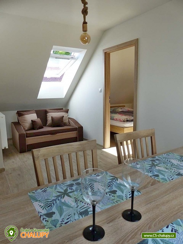 Apartments u Chmelů are located in a quiet part of the village of Domanín near the spa town of Třeboň, which offers plenty of entertainment, culture, cafes, pastry shops, restaurants and activities for everyone. The surroundings are interwoven with a number of hiking and cycling trails leading, for example, to the famous Svět and Rožmberk ponds. Apartments u Chmelů offer accommodation for 13 people in three separately rented apartments with their own kitchen and bathroom. Apartment no. 1 and 2 are equipped and have the same layout and have a capacity for 5 people. Both apartments have one four-bed bedroom (2× single bed and 1× double bed) and one living room with a sofa bed (1x extra bed), dining table, TV and fully equipped kitchen (ceramic hob, electric and microwave oven, fridge with freezer, electric kettle, dishes for basic food preparation, toaster and dishwasher). Both apartments have a bathroom with a shower and toilet. Apartment No. 3 with a capacity for 3 people is located on the ground floor and has barrier-free access. The apartment consists of one main room, which has a double bed, a sofa bed (1 extra bed suitable for a child) and a kitchenette equipped similarly to the previous two apartments. The apartment has a spacious bathroom with a shower and toilet. A cot can be provided for all apartments upon request. The windows of the apartments are equipped with blinds and mosquito nets. A hairdryer, fan for hot summer days, clothes dryer and iron are available for rent. WIFI internet connection is available throughout the building. Heating is centrally solved using radiators. Outside, all accommodation can use a garden seating area with a grill. Children will appreciate the sandbox. There is a bicycle storage room. Parking is available directly at the building. In the vicinity of the building there is the possibility of hiking, cycling, swimming, mushroom picking and fishing. There are tennis courts nearby. There is a pond about 400m from the apartment where you can swim or fish. A permit can be purchased directly in the village. There is also a multi-purpose playground in the village, accessible free of charge. For families with children, there is a new, modern playground and one smaller playground near the apartments. Swimming options include: Svět pond, Opatovický pond, Spolský pond, Dunajovice quarry, Rožmberk pond, Nový Lipnický pond, Podřezanský pond, Cep sandpit, Borovany - Lazna swimming pool, Třeboň Aurora swimming pool, etc. The Blanský forest protected area, Novohradské mountains, Lužnice river with canoe and raft rentals, Český Krumlov or Hluboká nad Vltavou attract tourists for trips in the surrounding area. We look forward to seeing you there.