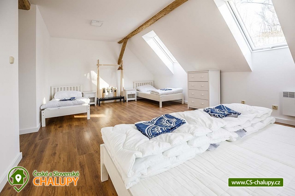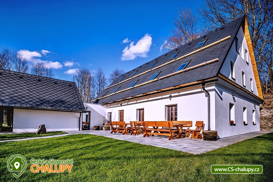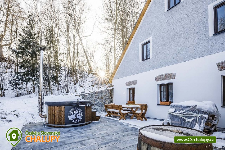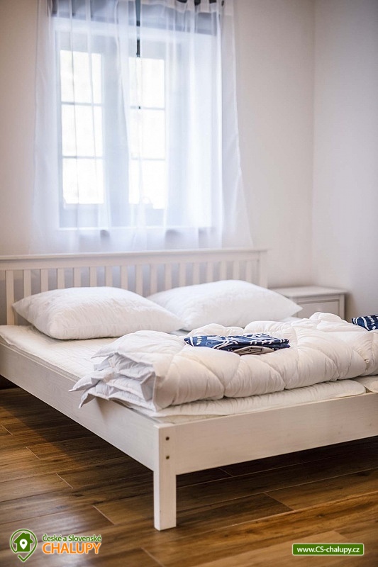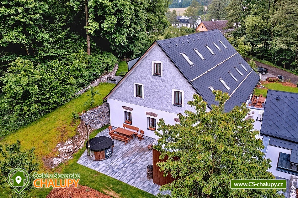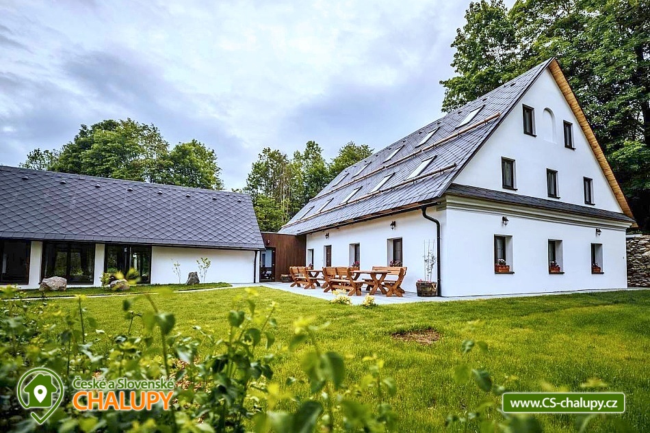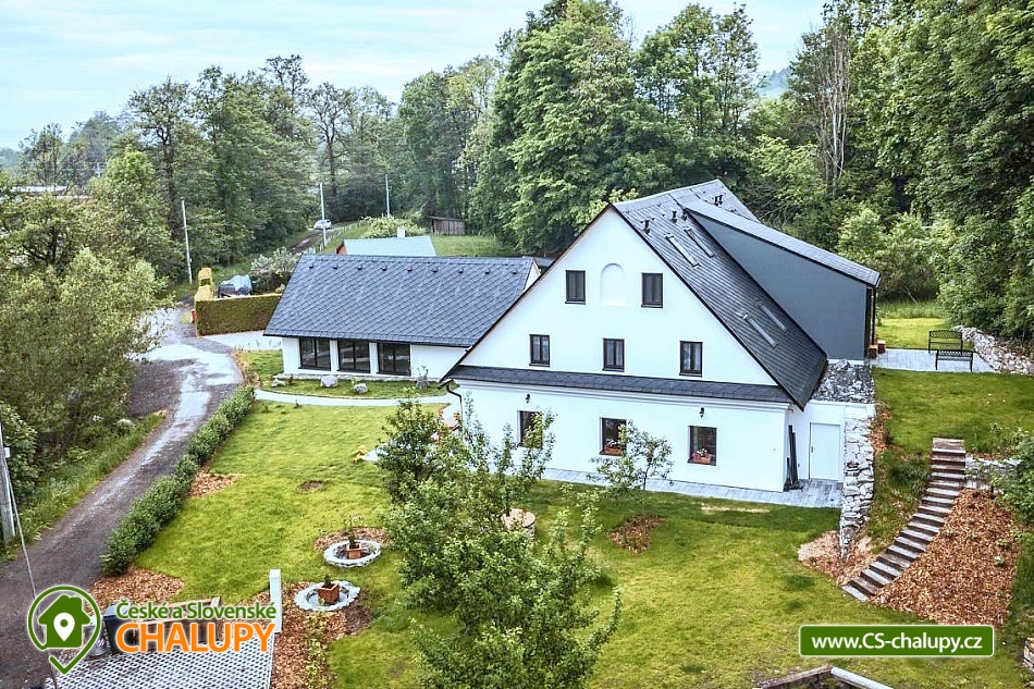 The stylish Cottage near the stream is located in the village of Prostřední Lipka, near the town of Králíky, in the beautiful landscape below Králický Sněžník on the border of the Jeseníky and Orlické mountains. In close proximity you can visit the year-round Dolní Morava, Červená Voda, Říčky v Orlické Horách and Česká Petrovice sites. In this cottage from the 19th century, formerly used as a German bakery, you can now look forward to a very comfortable stay with the possibility of relaxing in the sauna or in the outdoor hot tub. The cottage near the stream offers accommodation for 28 people in 7 four-bed bedrooms. On the ground floor there is one four-bed bedroom with a double bed and two single beds and a private bathroom with a toilet and a shower. The ground floor also includes a common room with a large dining table, a kitchen, a living room with a sofa set and TV, two separate toilets, an entrance hall with shoe racks and a ski boot dryer, a gym (6x12 m) and a Finnish sauna with an adjacent terrace and a hot tub. The kitchen is fully equipped with everything needed for cooking, baking, dining and sitting for a large group of 28 people. There is a kettle, coffee machine, microwave oven, oven, hob, fridge, dishwasher and all dishes. You can also use the installed faucet with three taps and plenty of glass. By agreement and for an additional fee, beer can be provided from a large warehouse. On the second floor there are four more four-bed bedrooms, three with a double bed and two single beds and one with two double beds. Two bedrooms have their own bathroom with shower and toilet and two bedrooms have one shared bathroom, also with shower and toilet. There is one separate toilet in the corridor. On the third floor there are two more four-bed bedrooms, each with four single beds. Both bedrooms have their own bathroom with shower and toilet. WIFI internet connection is available throughout the building. Heating is provided by an electric boiler for floor heating on the ground floor. The second and third floors are heated by electric direct heaters. Air conditioning is available on the third floor and in the gym. A washing machine is available. Outside, a grassy garden extends around the cottage. The cottage has a front and back terrace with outdoor seating. It is also possible to enter the back terrace from the second floor. There is a grill and a fire pit. You can park directly at the building. In the vicinity of the building, hiking, cycling, swimming, mushroom picking, fishing, cross-country skiing and skiing are possible. There is also a riding stable nearby. Swimming options include, for example: Velké Losiny - thermal baths, Králíky swimming pool, Mezilesí pool, Hynčice pod Sušinou - Úžas pond, Jablonné nad Orlicí swimming pool, Pastviny dam, Štíty - Acrobat Park, Ruda nad Moravou swimming pool, Kunvald swimming pool, Letohrad swimming pool, aqua park Žamberk, etc. In winter, there are several top ski resorts available in the vicinity. Among the most famous are the Resort Dolní Morava with 8 groomed slopes of various levels of difficulty, with the children's ski park Amálka, with a fun track with flaps and 2 tunnels, a cross course or a course with obstacles. Nearby attractions include the Dolní Morava Cloud Trail, Hůrka Fortress, Králíky Military Museum, Pilgrimage Area Hora Matky Boží in Dolní Hedeč, Lookout Tower on Křížová hora, Suchý vrch, Nature Park Zemská brána in Klášterec nad Orlicí or Nature Reserve Králický Sněžník with spring the Morava River. We look forward to seeing you here.
