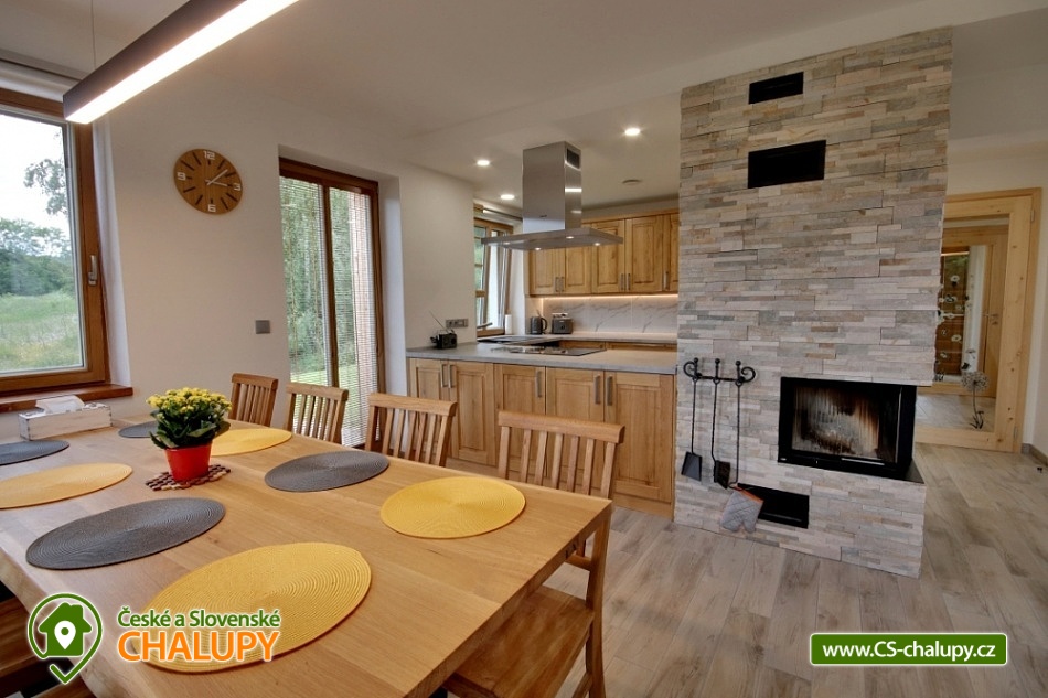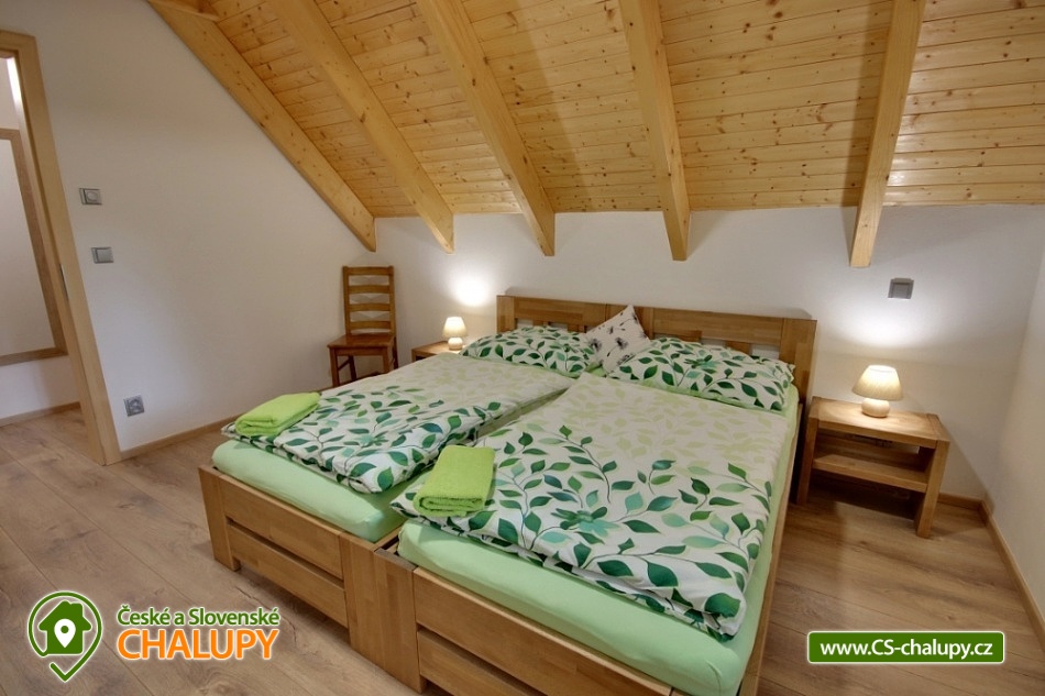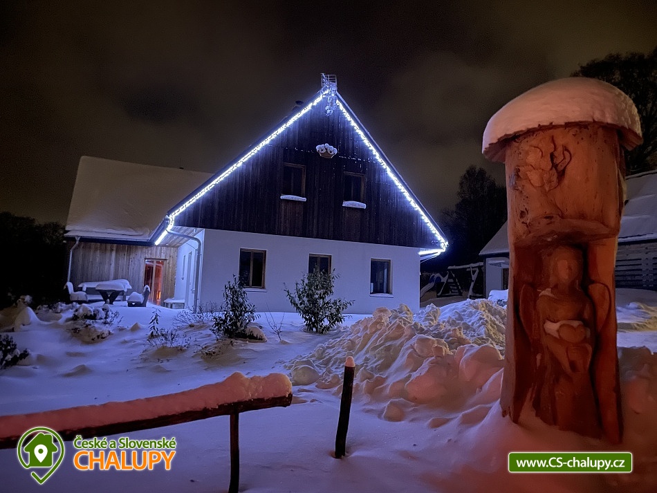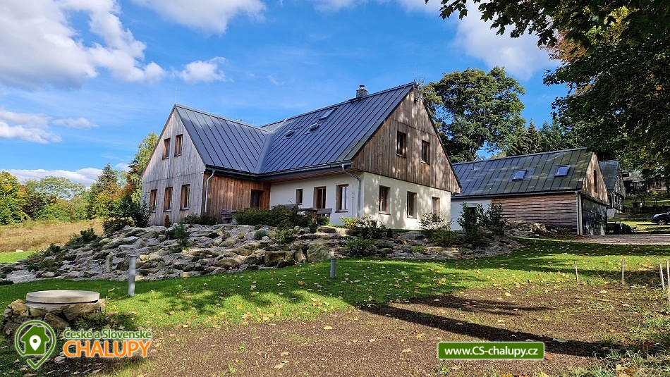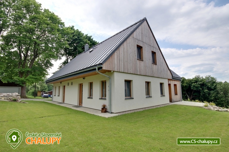 Chalupa v CHKO Jizerské hory - Vyhlídková cesta u obce Kořenov a Příchovice na místě, kde stála původní stará chalupa z filmu Obsluhoval jsem anglického krále. Jedná se o zděnou novostavbu v nadmořské výšce cca 700 m na krásném klidném místě. Uvnitř chalupy jsou dva nadstandardně vybavené apartmány, jeden o kapacitě 4 + 1 osoby a druhý o kapacitě 8+1 osob. V menším apartmánu č.1 je obývák s krbovými kamny, výstupem na terasu a plně vybavenou kuchyní (myčka, elektrická trouba, mikrovlnná trouba, varná deska, rychlovarná konvice, lednice s mrazákem, kávovar, topinkovač...), koupelna se sprchovým koutem a samostatná toaleta. V patře dva prostorné dvoulůžkové pokoje, šatna a toaleta. Ve větším apartmánu č.2 je v přízemí prostorný obývací pokoj s krbem, jídelním koutem a opět plně vybavenou kuchyní , koupelna, samostatná toaleta, šatna a jeden dvoulůžkový pokoj. Z obývacího pokoje jsou přístupné dvě terasy s možností grilování /mimo zimní období/. V patře se nachází čtyřlůžkový pokoj a dvoulůžkový, s možností kvalitní přistýlky a koupelna s toaletou. Každý apartmán má svůj vlastní vchod a jsou plně oddělený. V případě pronájmu celé chalupy lze apartmány propojit jinak uzamčenými dvojitými dveřmi. Je zde příjemné venkovní posezení na terase s možností grilování (mimo zimní období). Ohniště pro milovníky opékání špekáčků se nachází na zahradě. V letních měsících je možnost přespat v Téépéé, které má dřevěnou podlážku. V celém objektu využijete Wifi připojení (omezené) , televize je vždy v obývacích pokojích. Objekt lze vytápět elektrickými přímotopy nebo krbovými kamny. U domu je parkovací stání pro několik aut. Pro bezpečné uložení kol, lyží, kočárků atd. je uzamykatelná místnost. Kolem chalupy je prostorný udržovaný trávník a okrasné jezírko se skalkou. Chalupa se nachází na polosamotě u lesa, kde si odpočinete od ruchu města pod korunami stromů, za zpěvu ptáků, šumění vody u jezírka a lze pozorovat hvězdnou oblohu nezkreslenou světly měst. Okolí Vám dává možnost výběru různých sportovních aktivit, ať už se jedná o turistiku, jízdu na kole (jsou zde i bikeparky), běžecké lyžování (blízký nástup na Jizerskou magistrálu) a sjezdové lyžování za "rohem" (Příchovice U Čápa, Tanvaldský Špičák, Harrachov). Pokud milujete klid, přírodu, pohodu u jezírka, turistiku, kolo, běžecké lyžování a sjezdovky, jste na správném místě!!!! Těšíme se na Vás u nás.