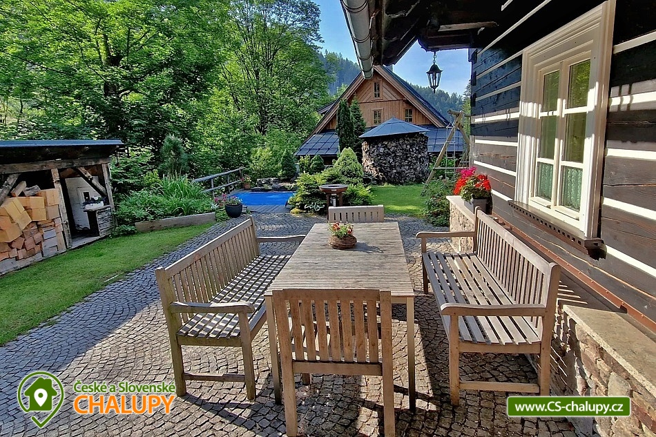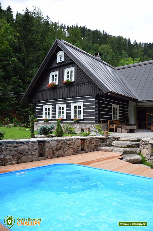 Chalet Roubalka - Černý Důl. Rental cottage Giant Mountains Černý důl. Accommodation Giant Mountains - The luxuriously furnished cottage Roubalka is located in the Giant Mountains near the ski center Černý Důl, district Trutnov. The traditional timber is built by the river in a quiet location overlooking the trees. There is a fully equipped kitchen (stove, refrigerator, dishwasher, microwave, coffee maker) connected to the spacious living room with a bar with a draft, a fireplace and a TV. This space is connected to the open balcony on the palate floor. There are 4 bedrooms in total, two with 2 beds on the ground floor and another 2 beds on the floor, which are taken as extra beds. The other two bedrooms are 2-bedded. In the accommodation facility there is a cot, sauna, 2x bathroom with shower and toilet, 2 separate toilets with washbasin and another one in the bedroom. Heating is provided electrically and fireplace stoves. In the outdoor area there is a heated swimming pool (3 x 3.5 m), a seating area with a garden grill, a children's swing and an entry to a mountain stream. You can park directly at the property. Surrounding nature invites for hiking and cycling, in winter there are ideal conditions for skiing.