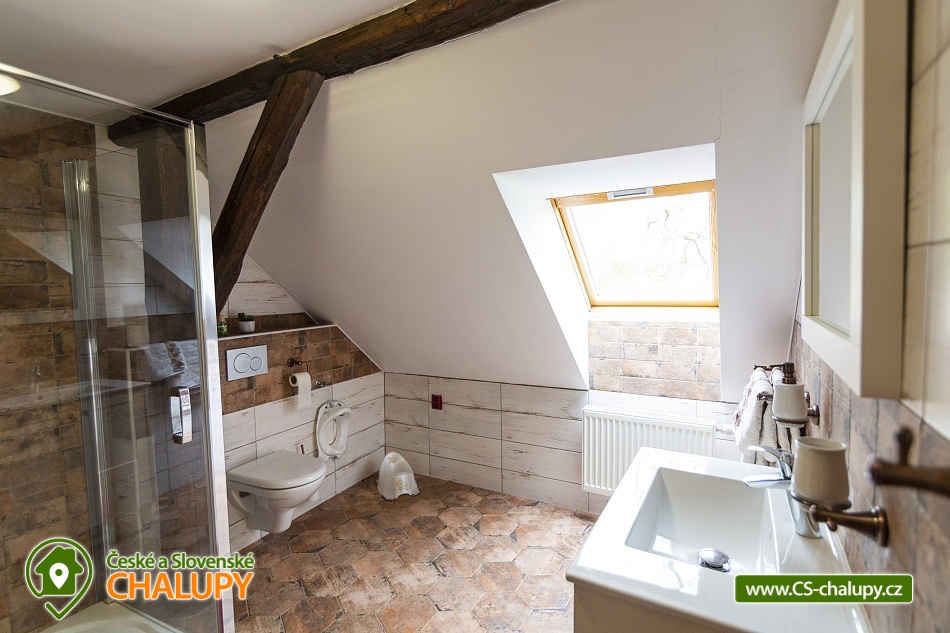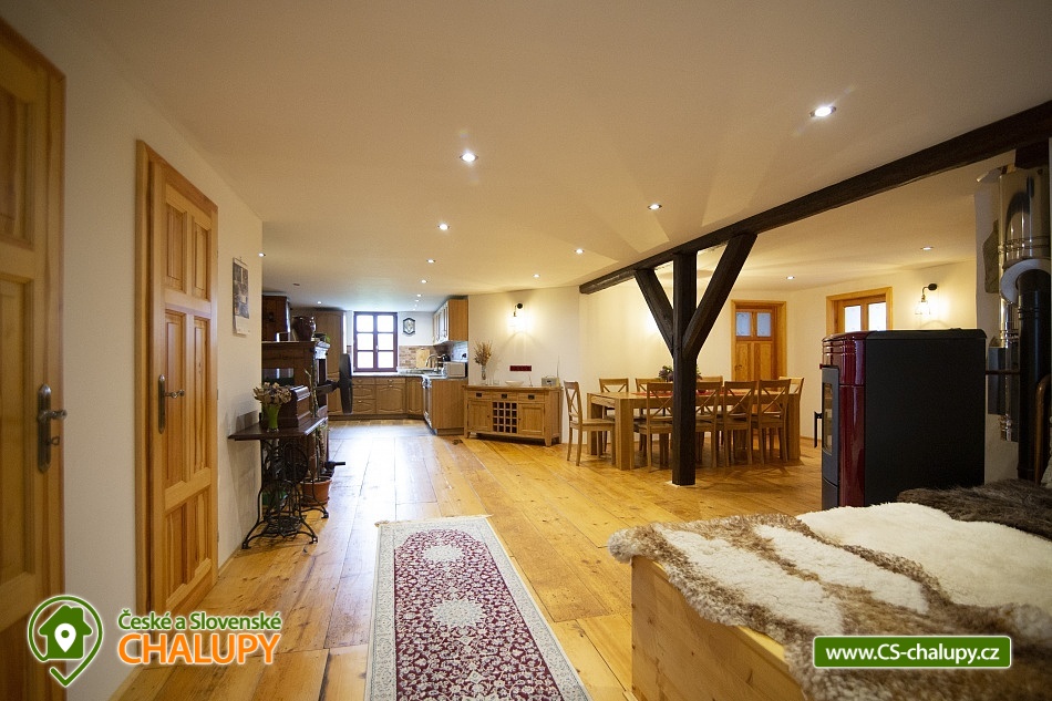 Cottage Bouduv Mlýn - Skuhrov - accommodation Vysočina. The cottage for rent with a capacity of 15 people is located in a secluded area, one kilometer from the village of Skuhrov, Vysočina region. On the first floor of the cottage there are 3 bedrooms (3 x 4 beds), two bathrooms equipped with a shower, toilet and sink. One of the rooms also has a sink directly in the room. A washing machine is also available here. Furthermore, on the first floor there is a fully equipped kitchen, induction hob, oven, fridge, freezer, dishwasher, microwave oven and Dolce Gusto coffee machine. There is also a hall with a dining table and an indoor pellet boiler, where you can relax on sheepskins by the stove. On the second attic floor, there is one room for 3 guests, equipped with its own bathroom, where there is a bathtub, toilet and sink. There are 2 cots available in the building. On this floor there is also a hall with a sitting area, a sofa, an armchair and a small children's corner. There is a fully equipped bar (fridge, freezer, induction two-burner hob, sink and tap equipment. There is also a smart TV in the living room. All rooms are equipped with their own TV. There is Wi-Fi connection in the building. On the ground floor it is possible use the table tennis table. The large yard has a fire pit, an outdoor brick smokehouse and several places to sit. There is a trampoline, a children's swing, a children's playhouse and a small pool (for the summer season). In the deep woods here, you can not only mushroom picking, but you can also discover a well with healing water here. You can visit, for example: Lipnice nad Sázavou (16 km) with its castle, the grave of Jaroslav Hašek, or take a walk in the local forests. Havlíčkův Brod (9 km), with its historic walls and the museum of Karel Havlíček Borovský. Humpolec (27 km), here you can visit the local brewery Bernard, with an observation tower or the nearby ruins of the Orlík castle. Žďár nad Sázavou (37 km), here you can find Zelená hora, a UNESCO monument, Pilák recreation area or, for example, Žďár castle above Sázava. We look forward to seeing you here.