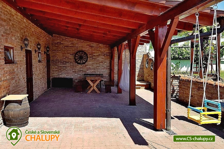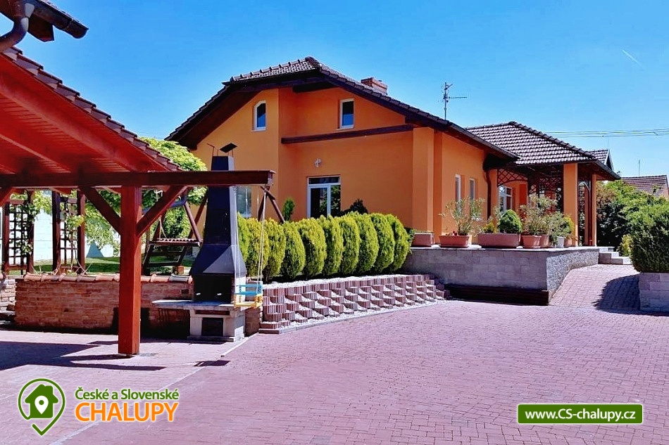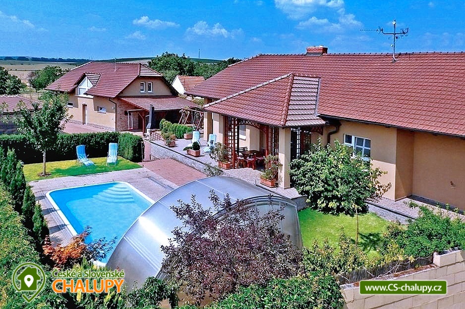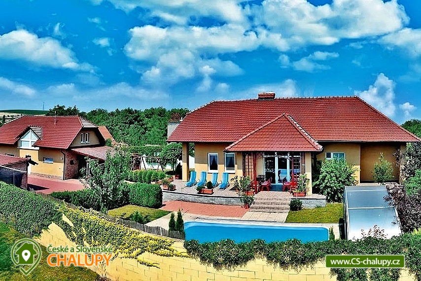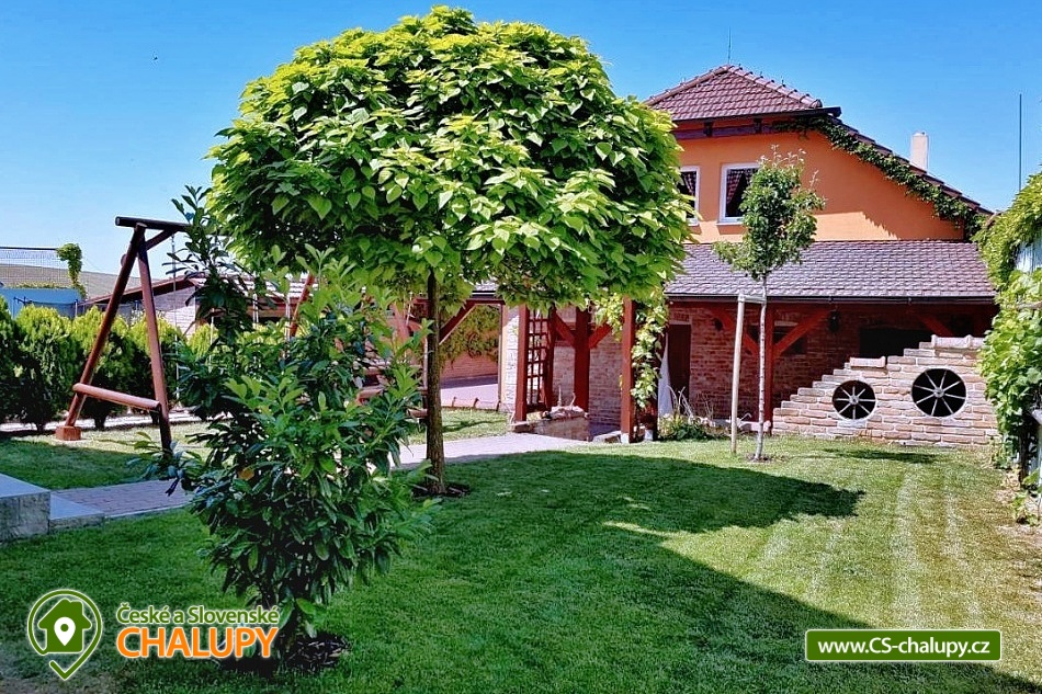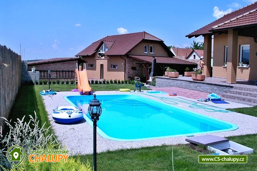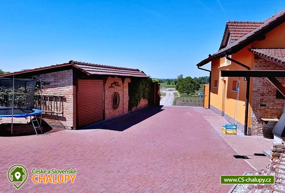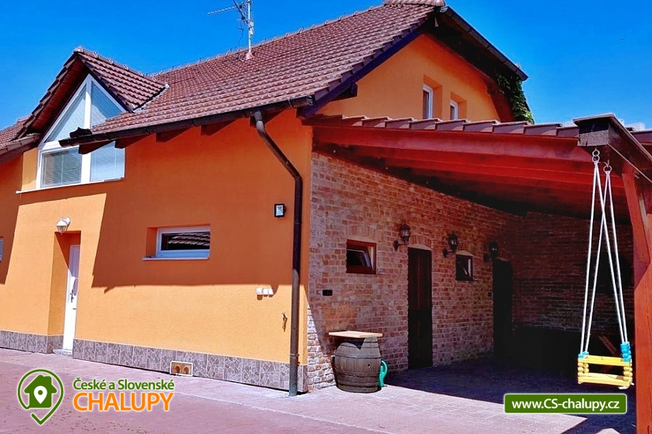 Cottage Na Vinařské Stezca with swimming pool, infrared sauna and wine cellar is located in southern Moravia, in the small wine-growing village of Starovičky, where the cycle path leads through the André Region from Hustopečí to Vrbice. It is a fenced building on the outskirts of the village with a garden, seating by the children's corner (swings, sandbox, climbing frames, trampoline), another seating area by the indoor pool, a parking area, a large yard with a fireplace, barbecue and a garage for two cars. There are 2 separate apartments in the building with a total capacity of 16 people (the cottage is rented as a whole to 1 group of clients). Main building with apartment for 10 - 12 people, side building with apartment for 6 - 8 people. A summer kitchen is available at the sitting area, including sanitary facilities, a TV, a fridge and a sofa bed. The cottage for rent provides accommodation for up to 16 people in 5 bedrooms. In the main building by the pool, there are three bedrooms with a total of 10 beds and a cot, as well as a living room with a kitchen, a fireplace and a folding corner sofa for two people. Large bathroom with bathtub, shower and toilet. Utility room with washing machine. There is a new air conditioning unit and a separate toilet in the corridor near the rooms. From the living room there is direct access to the terrace with seating by the pool. In the adjacent building - in the attic, there is a fully equipped air-conditioned apartment 3+kk. The apartment has two bedrooms with 6 beds, a living room with a kitchenette, TV and sofa bed for 2 people, a bathroom with a shower, toilet and washing machine. On the ground floor, a garage for two vehicles, a room with an infrared sauna for 4 people and showers. Furthermore, a summer kitchen with a TV and a sofa bed. The summer kitchen also includes a small bathroom with shower and toilet. There is a wine cellar with seating under the building. From the outdoor part of the shed with seating near the children's corner. There is a sandpit, swings, a climbing frame, a jumping trampoline near the seating area. In the garden in the yard there is a large tennis wall or an area for sports. there is also a large covered swimming pool with dimensions of 8x4x1.6m. there is also a bicycle rental for both small and large cyclists (limited number of bicycles). Surroundings: Lednicko - Valtický area, Pálava, Mikulov castle, Macocha abyss, Pasohlávky aquapark, cycle paths, boating on the Novomlýnská dam, 3 swimming pools, fishing, wine tourism and more. We look forward to seeing you here.