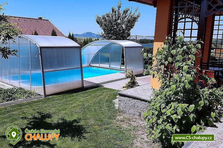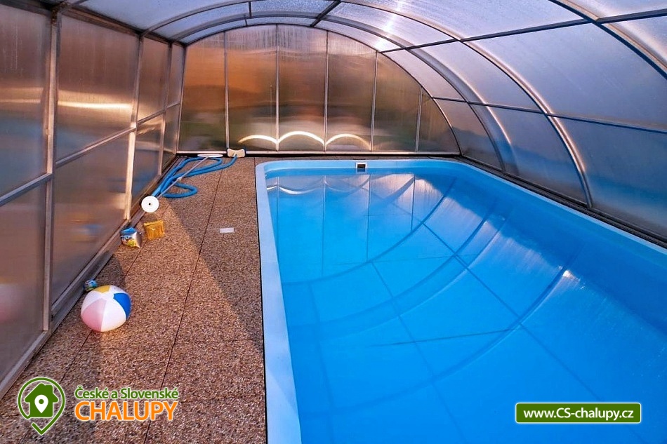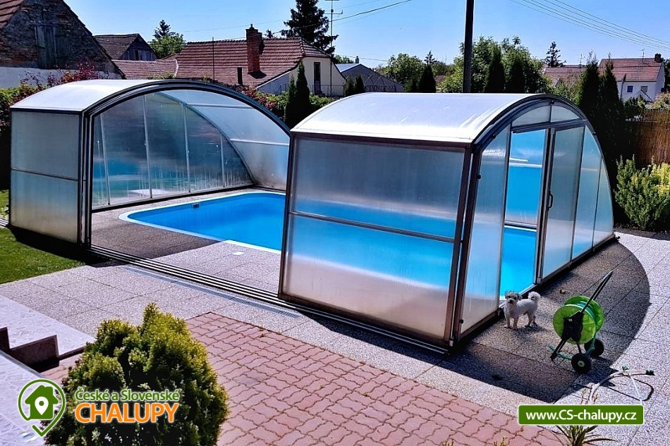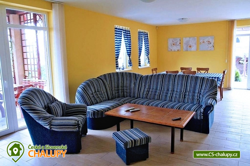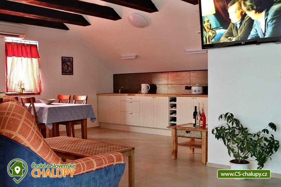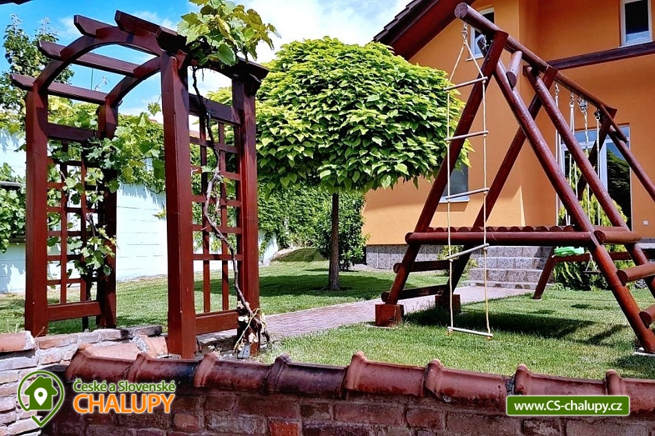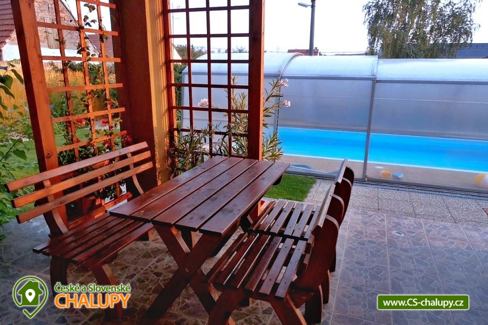 Cottage Na Vinařské Stezca with swimming pool, infrared sauna and wine cellar is located in southern Moravia, in the small wine-growing village of Starovičky, where the cycle path leads through the André Region from Hustopečí to Vrbice. It is a fenced building on the outskirts of the village with a garden, seating by the children's corner (swings, sandbox, climbing frames, trampoline), another seating area by the indoor pool, a parking area, a large yard with a fireplace, barbecue and a garage for two cars. There are 2 separate apartments in the building with a total capacity of 16 people (the cottage is rented as a whole to 1 group of clients). Main building with apartment for 10 - 12 people, side building with apartment for 6 - 8 people. A summer kitchen is available at the sitting area, including sanitary facilities, a TV, a fridge and a sofa bed. The cottage for rent provides accommodation for up to 16 people in 5 bedrooms. In the main building by the pool, there are three bedrooms with a total of 10 beds and a cot, as well as a living room with a kitchen, a fireplace and a folding corner sofa for two people. Large bathroom with bathtub, shower and toilet. Utility room with washing machine. There is a new air conditioning unit and a separate toilet in the corridor near the rooms. From the living room there is direct access to the terrace with seating by the pool. In the adjacent building - in the attic, there is a fully equipped air-conditioned apartment 3+kk. The apartment has two bedrooms with 6 beds, a living room with a kitchenette, TV and sofa bed for 2 people, a bathroom with a shower, toilet and washing machine. On the ground floor, a garage for two vehicles, a room with an infrared sauna for 4 people and showers. Furthermore, a summer kitchen with a TV and a sofa bed. The summer kitchen also includes a small bathroom with shower and toilet. There is a wine cellar with seating under the building. From the outdoor part of the shed with seating near the children's corner. There is a sandpit, swings, a climbing frame, a jumping trampoline near the seating area. In the garden in the yard there is a large tennis wall or an area for sports. there is also a large covered swimming pool with dimensions of 8x4x1.6m. there is also a bicycle rental for both small and large cyclists (limited number of bicycles). Surroundings: Lednicko - Valtický area, Pálava, Mikulov castle, Macocha abyss, Pasohlávky aquapark, cycle paths, boating on the Novomlýnská dam, 3 swimming pools, fishing, wine tourism and more. We look forward to seeing you here.