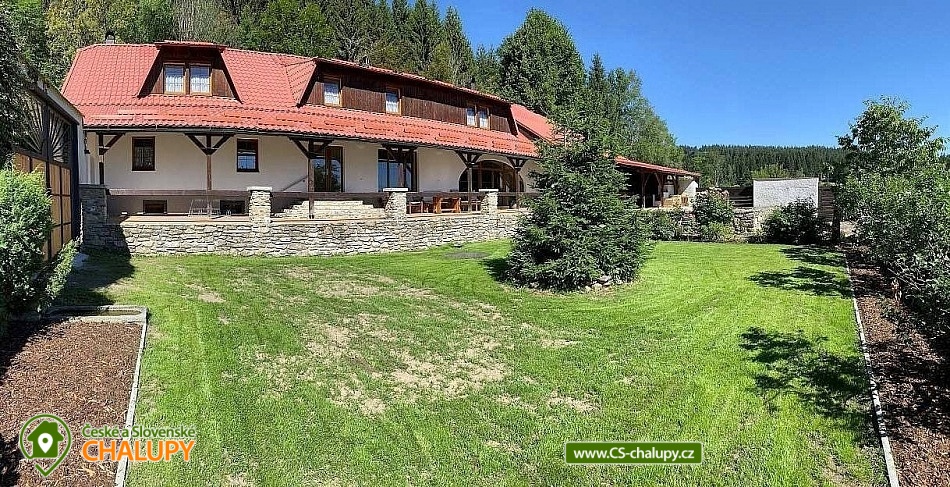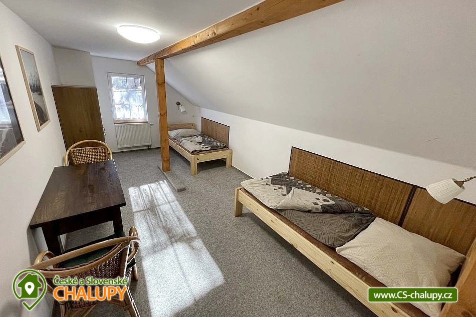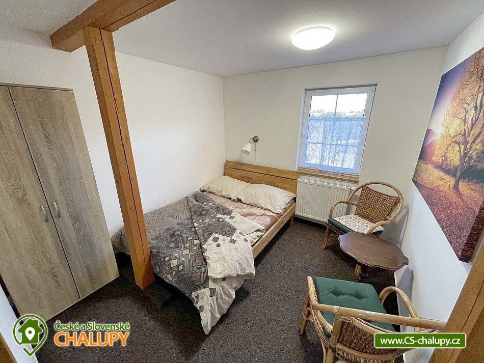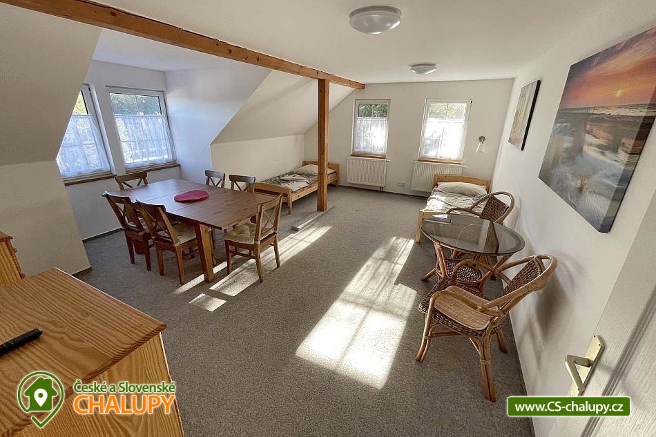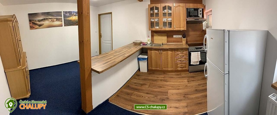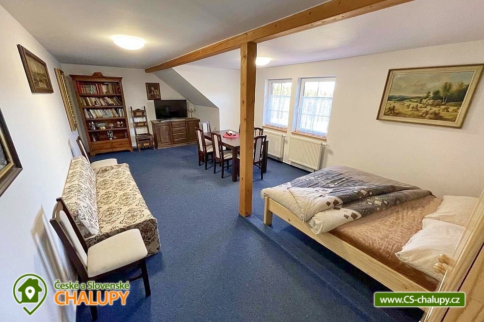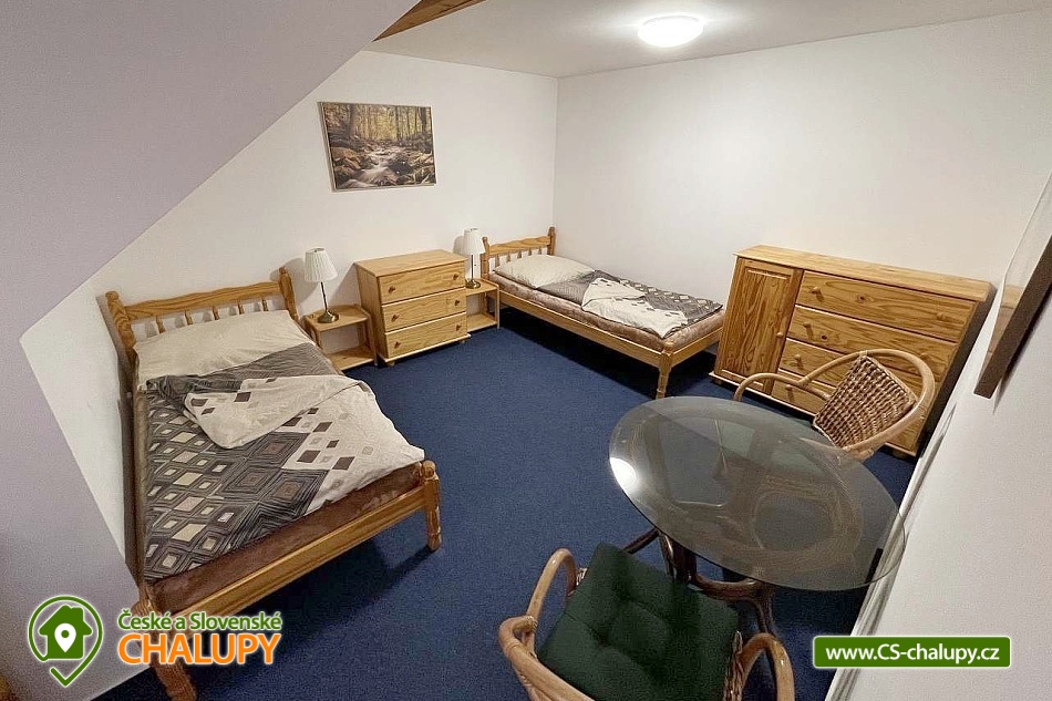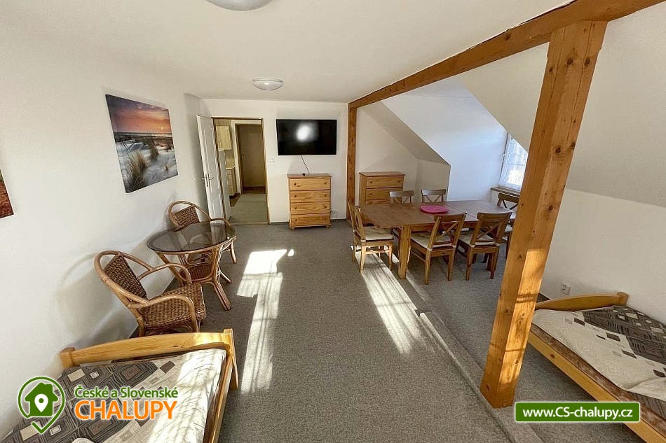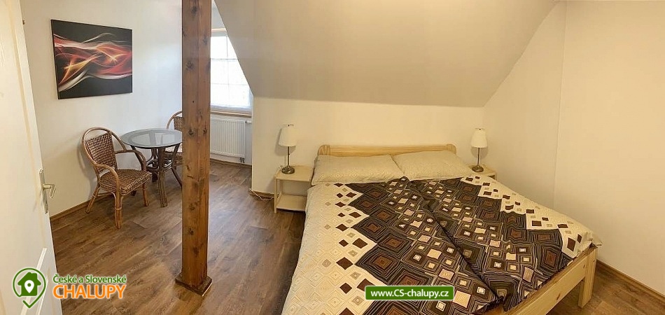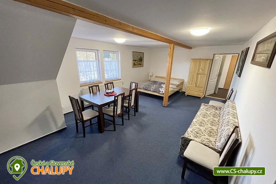 Cottage with apartments - accommodation in the beautiful forested countryside of the Šumava National Park near the Churáňovské tourist routes, ski areas and excursion destinations (Horská Kvilda, Klostermannova skála, Kašperské Mountains, etc.). The capacity of the object is up to 16 people in two separately rented six-bed apartments. They can also be rented as a whole. Both apartments are located on the 1st floor of the cottage and have the same layout. Each apartment has 2 double bedrooms (double bed and two single beds) and 1 double bedroom with a living room (2 single beds, dining table for 6 people and TV). Of course, there is also a fully equipped kitchen (ceramic hob, electric oven, microwave, kettle, fridge and kitchen utensils needed for cooking and dining) and its own seating area. The sanitary facilities include one bathroom in both apartments with a spacious shower with a thermostatic head, a heated towel rack, a sink and a toilet. The heating is central. All accommodation can also spend pleasant moments in a large common room with a dining area for 12 people, a sofa, a billiard table, darts and a fully equipped kitchenette (fridge with freezer, electric kettle, coffee maker, dishwasher and complete dishes for grilling). Blankets for covering up, equipment for cricket and badminton are also available for rent. There is also the possibility of using a tap for 2 barrels. The tap is powered by bio-fuel, thanks to which you can enjoy draft drinks without worrying about them spoiling. WIFI internet connection is provided throughout the building. You can sit outside on a covered terrace with garden furniture and a gas grill. The garden also includes a fireplace. There is a bicycle and ski storage room available. Parking is available directly at the building. Each apartment has its own parking space for 4 cars right next to the cottage. In the vicinity of the property there is the possibility of hiking, cycling, swimming, fishing, skiing, cross-country skiing and mushroom picking. There is a chairlift to the top of Churáňov Mountain within walking distance. Swimming options include: Zdíkovec Pond, Úbislavický Pond, Kvilda Swimming Pool, Rohanov Swimming Pool, Vimperk Swimming Pool, etc. There are nearby ski resorts: Zadov Ski Area, Nové Hutě Ski Area, Javorník, Kvilda and others. Trips in the area include the Jezerní Swamp Natural Monument, Zadov Rope Park, Javorník Lookout Tower, Kašperk Castle, Srní Wolf Nature Trail or Rábí Castle. We look forward to seeing you there.