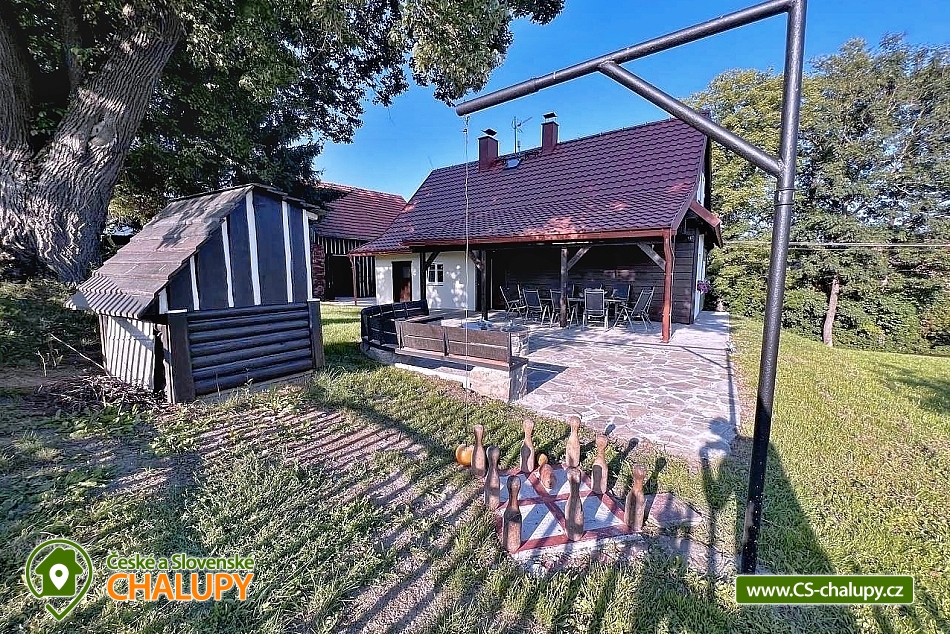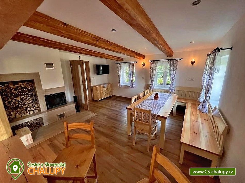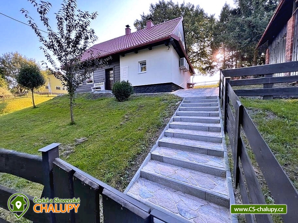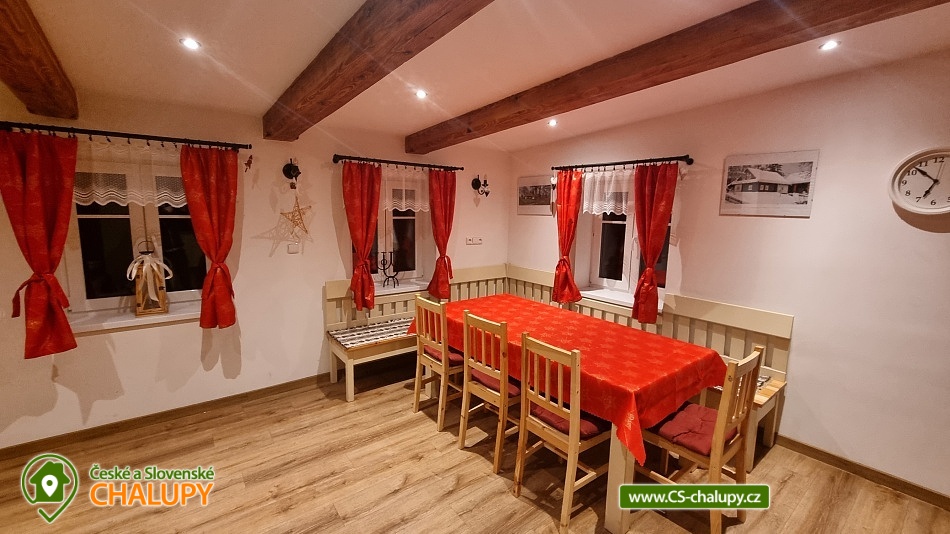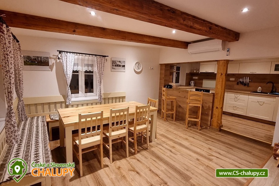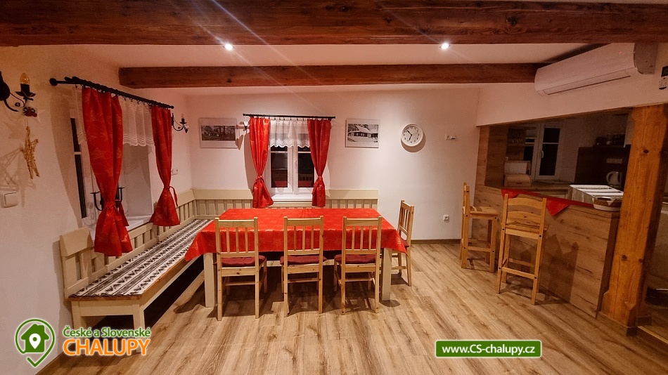 Chalupa Na Chajdě is located in the Moravian-Silesian Region, in the picturesque village of Kozlovice, a village of the Wallachian Voivods in the foothills of the Moravian-Silesian Beskydy Mountains, which is a peaceful stop in today's busy times. The cottage is located 10 km west of the town of Frýdlant nad Ostravicí, 12 km southeast of Příbor and 14 km southwest of Frýdek - Místek. We offer weekly and weekend stays. The cottage has been completely renovated and provides accommodation for up to 12 people in 3 bedrooms. It is fully equipped for moments of comfort and relaxation, especially during family holidays in summer or winter. Every guest will feel at home with us. In the fully equipped cottage you will find everything you need for an undisturbed stay. The cottage has a fully equipped kitchen (ceramic hob, oven, dishwasher, microwave oven, kettle, all crockery and washing machine). On the ground floor there is also a stylishly equipped dining room, a living room for 10 to 12 people with a large table, television and a fully functional fireplace. On the ground floor, there is also a bathroom with a shower and a toilet, as well as a common room with a table and a fireplace, which can also accommodate up to 12 people. Upstairs there are three separate bedrooms. One with a double bed, and two single beds. In the other two there are always three single beds and the possibility of one extra bed. A second toilet is also available on the floor. Access to all three bedrooms is only possible via the Miller Staircase. A bathroom with a toilet on the ground floor, and a second toilet on the first floor. Heating: Heating is possible with a heat pump and fireplace with distribution to all rooms. The garden of the cottage has a covered seating area for 12 people, a fireplace with seating and a grill with complete equipment. You can diversify your time in the spacious garden by playing skittles. The cottage also includes a barn, which is equipped with a hot tub and a games room, consisting of a pool table, professional football, table tennis and wall darts. The entire cottage is air-conditioned and covered by a WIFI signal. Excursions: From Kozlovice you can go to three beautiful Ondřejníky mountains - Skalka, Solárka and Stará Úboč, from which you can see the surrounding area and the highest mountain of the Beskydy - Lysa hora. The village abounds in many hillsides and pastures, and each house is nicely set in it. There are many tourist destinations in the vicinity that can also be reached by bicycle, e.g. Hukvaldy Castle ruins 3 km, Kopřivnice Automobile Museum 10 km, Šipka cave 13 km, Štramberská Trúba lookout tower 14 km, Hermitage with a statue of the god Radegast, Tarzánie rope park 14 km and the Wallachian Museum in Nature 20 km. We look forward to seeing you here.