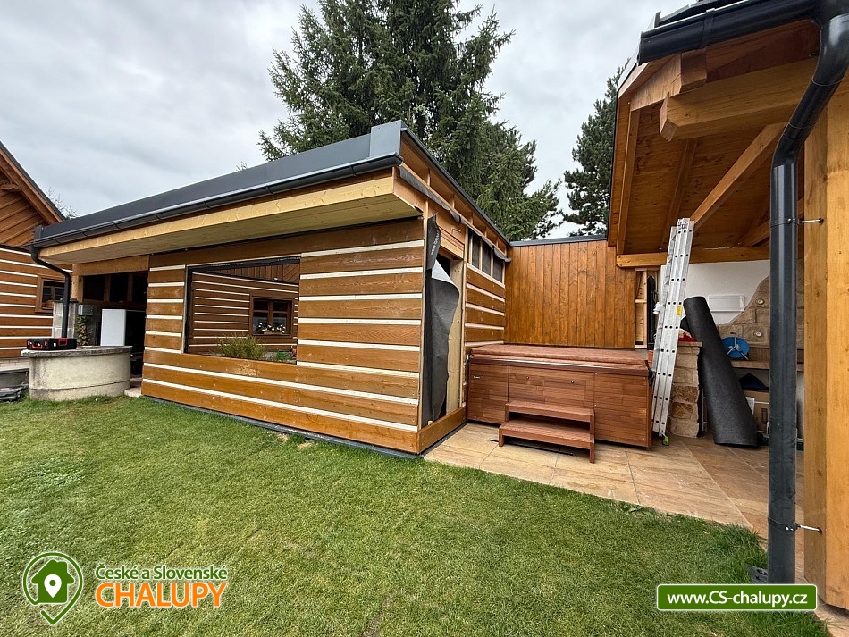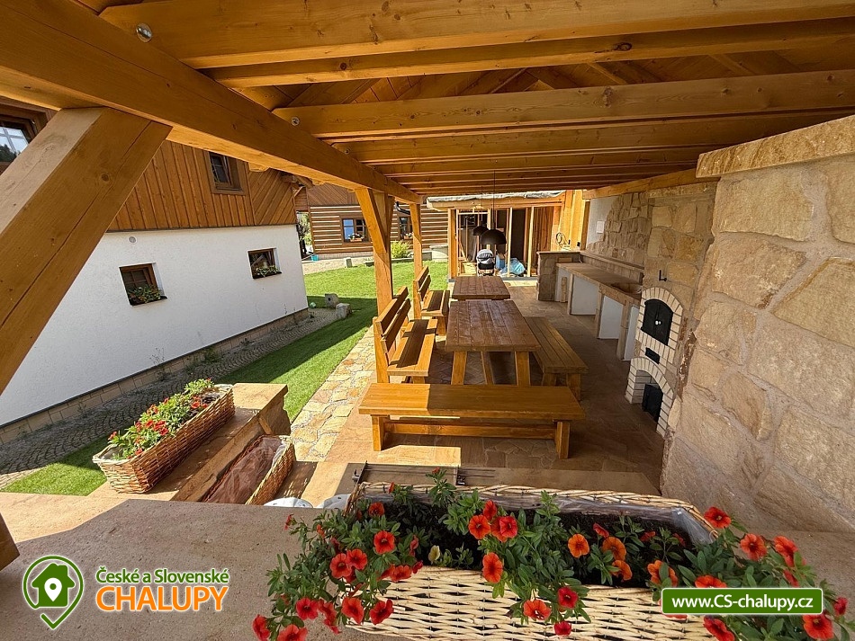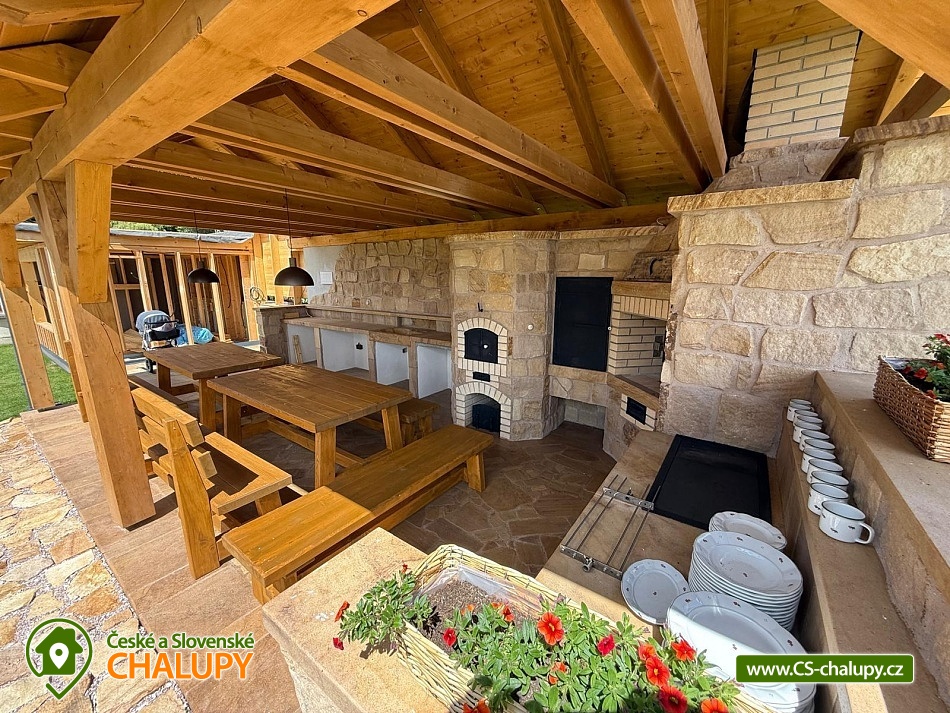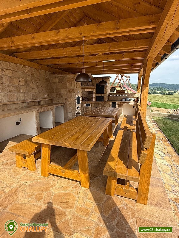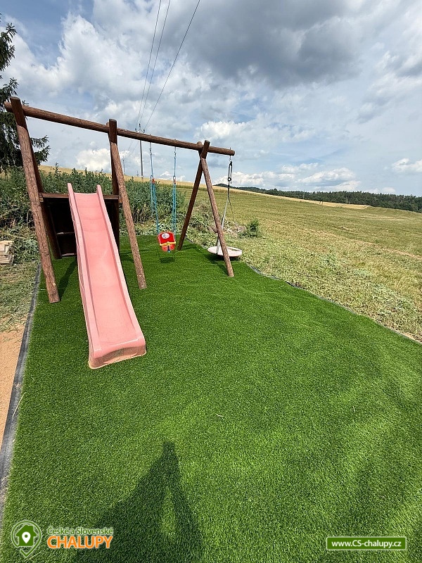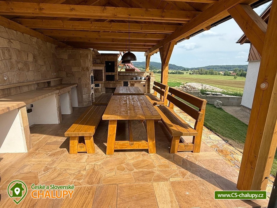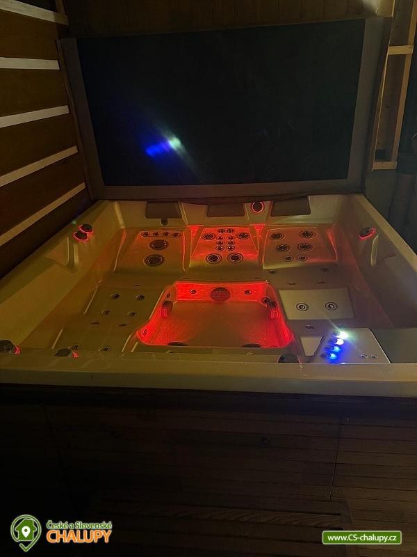 The luxuriously furnished cottage is located in the very heart of the Bohemian Paradise, in the picturesque village of Mladějov, near the Prachovské Rocks. Its location makes it an ideal place for hiking, cycling and well-deserved rest. You can look forward to a heated swimming pool, terrace, large garden and plenty of privacy. The cottage provides accommodation for 15 people in 4 bedrooms. There are three spacious bedrooms on the first floor. The blue and red bedrooms are 4-bed (1 double bed, 1 single bed, 1 extra bed) and the yellow bedroom is 2-bed (2 separate single beds) with the possibility of an extra bed for a child. There is also a residential attic with four mattresses (four adults or more children can comfortably fit here), which is designed as a fun space for children where they can play. A cot is available. Each bedroom is equipped with a TV and a private bathroom with a shower, sink and toilet. On the ground floor there is also a large bathroom with a toilet, washing machine and iron. For social moments, there is a spacious living room, the dominant feature of which is a stylish tiled stove, which gives the cottage a pleasant atmosphere. There is also a sofa, which can be used as an extra bed for one person, a TV and board games. The living room is loosely connected to a fully equipped kitchen (induction hob, electric oven, microwave, kettle, fridge, freezer, dishwasher and dishes) with seating at solid oak tables and a TV. The entire cottage is heated by underfloor heating, with a tiled stove with a fireplace in the living room. WI-FI internet access is available throughout the building. The cottage is surrounded by a large grassy plot with parking on a fenced, camera-guarded parking lot right next to the building (max. 6 cars). You can spend your free time together on a large, partly covered terrace with wooden seating and a garden grill. You can also use the fireplace. The dominant feature of the garden is a heated indoor pool with a counter-current and a whirlpool built into the pool steps (available from April to September). You can relax on the outdoor loungers. In your free time, you can play badminton and pétanque. The little ones will appreciate the playground with a swing, slide and trampoline, and adults will appreciate the tap facilities. For cyclists, there is a possibility of storing bicycles in the bike shed. In the vicinity of the cottage, there is the possibility of hiking, cycling, swimming, skiing, cross-country skiing, fishing or mushroom picking. Swimming options include, for example: Sobotka swimming pool, Nebákov pond, Sklář - Ostružno swimming pool, Jinolické ponds, Věžák pond, Kníže - Jičín swimming pool, Roudenský pond, Aqua Centrum Jičín or Sedmihorky swimming pool. In winter, nearby ski resorts are an advantage, for example: Kozákov Ski Resort, Zvičina Ski Resort, Paseky nad Jizerou Ski Resort, Šachty Ski Resort, cross-country skiing area in Lomnice nad Popelkou, etc. The surrounding area is attractive for trips: Prachovské Rocks, ruins of Trosky Castle, Nebákov and Podsemín ponds, Humprecht Castle, Kost Castle, Hrubá Skála Castle, Šolcův Statek or Jičín - the city of fairy tales. We look forward to seeing you.