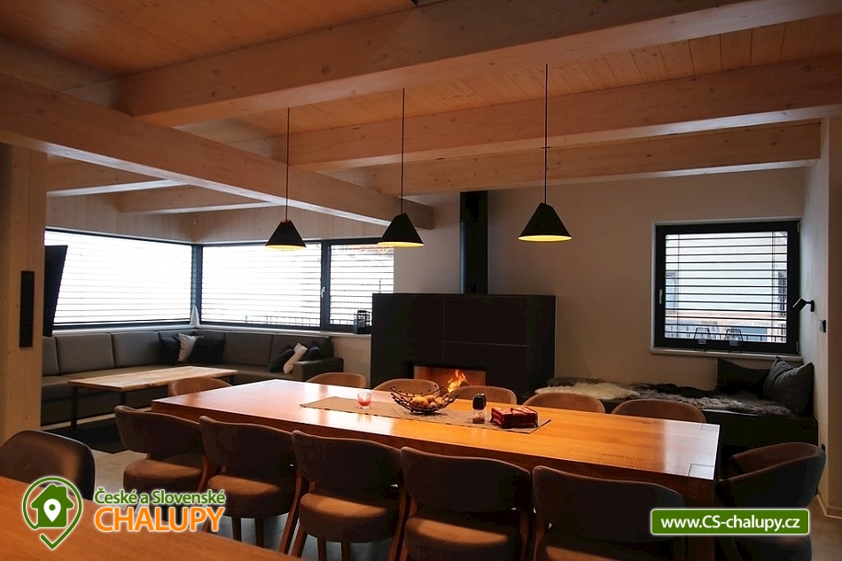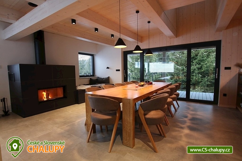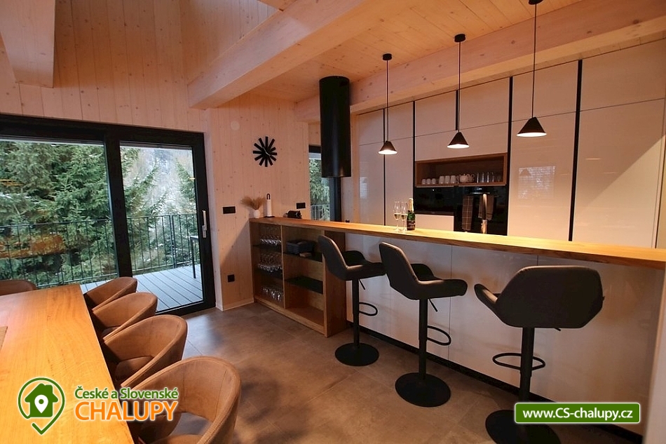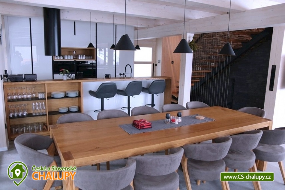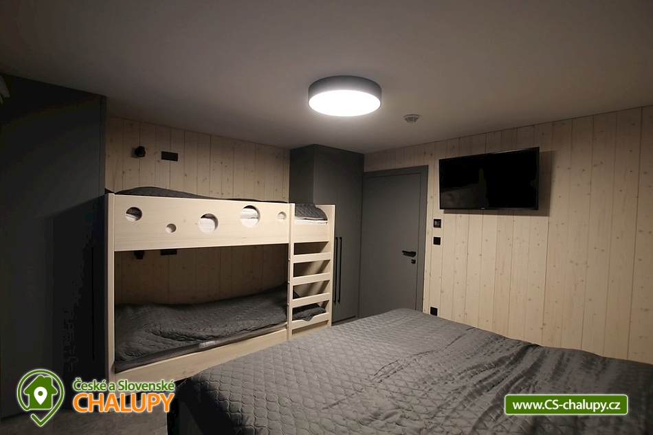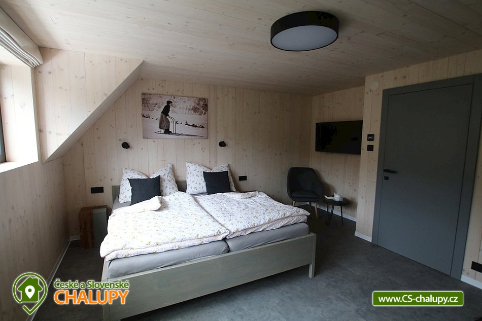 Chalupa s bazénem a saunou - Králický Sněžník leží ve Velké Moravě, která je součástí Dolní Moravy, v okrese Ústí nad Orlicí. Chalupa leží mezi Jeseníky a Orlickými horami, na úpatí pohoří Králický Sněžník. Její poloha z ní činí oblíbené letní turistické i zimní lyžařské středisko. Chalupa k pronájmu poskytuje ubytování pro až 14 osob ve 4 ložnicích. V přízemí je velký obývací pokoj s kuchyňským koutem mohutnými kachlovými kamny s plochou na ležení, jídelní kout a šatna s toaletou. Velká kuchyně je moderně vybavena 2 velkými lednicemi, indukční varnou deskou, myčkou nádobí, mikrovlnou troubou s grilem, varnou konvicí a kávovarem. V obývacím pokoji je pohodlná rohová sedačka a velká televize. Ve vstupu do chalupy je nástěnný horkovzdušný vysoušeč bot. Vedle hlavního vchodu je venkovní lyžárna, kolárna. V suterénu je pokoj se samostatnou toaletou a sprchou a finská sauna s odpočívárnou. V pokoji je manželské dvoulůžko a patrová postel. Z pokoje i odpočívárny je možné vyjít na venkovní terasu. V prvním patře jsou dva pokoje. Jeden má manželskou postel a patrovou postel, druhý má manželskou postel a jednolůžko. Oba pokoje mají samostatné sprchy a toalety. V podkroví je jeden třílůžkový pokoj s krásným výhledem na Kralický Sněžník. Je zde také koupelna s toaletou. V každém pokoji je TV. Jednotlivé pokoje mají samostatnou regulaci podlahového topení. V celém objektu je k dispozici WiFi. Objekt je vytápěn kachlovými kamny, případně elektrickým podlahovým topením. V létě je u chalupy k dispozici 3x6 m bazén se zastřešením, vyhřívaný tepelným čerpadlem. Vedle bazénu je zastřešené posezení s krbem a grilem. Přímo před chalupou máme k dispozici vlastní parkoviště pro 5 aut. V zimní sezóně pravděpodobně nutnost použít sněhové řetězy na posledních 25 m u chalupy. V okolí velké množství sportovních aktivit a zábavy. Velká bobová dráha, Stezka v oblacích, dětské zábavní parky, nejdelší vysutá lávka na světě, Termály Losiny a celoroční areál Sněžník. Těšíme se na Vás u nás.