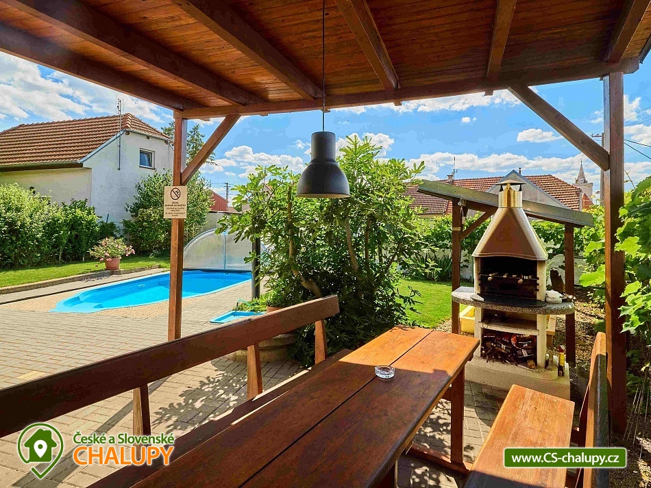 Věstonická cottage - Dolní Věstonice - accommodation Pálava. Our Věstonická cottage consists of a main cottage (14 people) and a separate house (7 people) in the adjacent enclosed garden. The total capacity is up to 21 people. The garden includes a private pool with a terrace, a pergola with barbecue facilities and a children’s corner. It features air conditioning in all rooms, LED TV and free Wi-Fi throughout. In the main cottage there are a total of 5 bedrooms, each with its own bathroom. Capacity is 14 beds (2 + 2 + 3 + 4 + 3 persons). There are 2 kitchens and a living room with a fireplace. A separate house in the garden, which is located separately from the main building, will provide accommodation for another family. In two bedrooms on the first floor there are a total of 7 beds (3 + 4). On the ground floor there is a living room with kitchenette and bathroom. You can enjoy privacy with barbecue under the pergola and relax in the garden or by the pool terrace. The generous bicycle storage room in the garage of the house offers the possibility of convenient storage of bicycles for all guests. On the ground floor of the main cottage you will find a large living room with a fireplace, in which all guests will find comfort. There is a modern kitchen, where in addition to standard modern appliances you will also find a dishwasher and washing machine. Heating is provided by fireplace stoves, el. direct heaters and underfloor heating. Parking is possible directly at the building. The village of Dolní Věstonice with a thousand-year-old wine-growing tradition can be found north of the Pavlovské vrchy, about 10 km north of Mikulov on the southern bank of the Novomlýnské reservoirs. Almost the entire eastern part of the village consists of Sklepní Street with original and newly built wine cellars. Directly above the village are the ruins of the castle Děvičky and the highest point of Pálava Děvín. We recommend visiting: Archeopark Pavlov and the ruins Sirotčí hrádek, Barefoot trail Schrattenberg - Valtice, Aqualand Moravia, Padleboard - Pavlov, Lednice Valtice area and Mikulov - chateau and quarry where Winemakers and Berries were filmed.