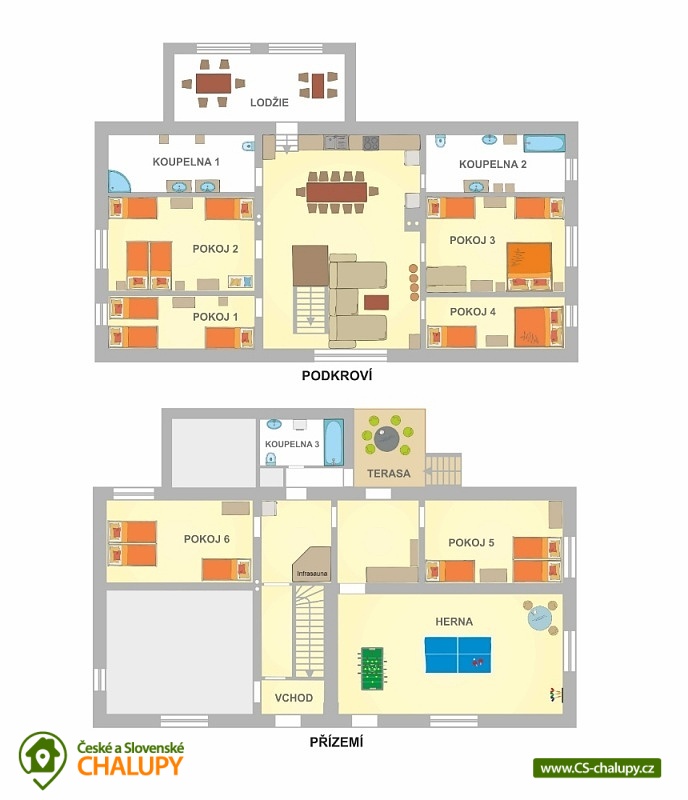 Chalupa s bazénem - Hrubý Jeseník. Prostorná chalupa pro až 24 osob nabízí příjemné ubytování v řídké zástavbě horské vesničky Nové Losiny v nádherné krajině Hrubého Jeseníku a je výborným výchozím bodem pro objevování krás Jeseníků. V chalupě je 7 ložnic: čtyři ložnice 3-lůžkové a dvě ložnice 4-lůžkové a jedna 2-lůžková, k dispozici jsou i 2 přistýlky. 4 ložnice jsou k dispozici v patře se společným obývacím prostorem, kuchyní, jídelnou, lodžií a dvěma koupelnami s WC. 3. ložnice a třetí koupelna s WC jsou v přízemí. V chalupě je plně vybavená kuchyně. K dispozici jsou 2 lednice s mrazákem, 2 malé lednice, sklokeramický sporák s troubou, myčka, mikrovlnka a rychlovarná konvice, Smart televize a druhá TV, WIFI, zastřešená terasa a INFRASAUNA , velká herna a elektrický krb (efekt plamenů a může i hřát). Bazén, Trampolína, Kulečník, Pingpongový stůl, Skluzavka a Šipky, dětská postýlka, jídelní stolička, nočník, sušák na prádlo. Výhodou je celoročně prosluněné místo s prostornou zahradou a protékajícím potokem. Zahrada přímo sousedí s lesem, spousta možností aktivních procházek či lenošení. Na zahradě je krb, bazén, trampolína, pingpongový stůl, spousta hrací plochy a zastřešené posezení. Na naši chalupě bydlíte vždy sami bez přítomnosti majitele. Dostanete se k nám autem, vlakem i autobusem. Vytápění zajišťuje bezobslužně plynový kotel. Parkování přímo u chalupy pro 6 aut. Chalupa leží v blízkosti mnoha turistických cílů, velkých i menších lyžařských středisek, ty nabízí celoroční využití lanovek k turistice nebo sjezdům na kolech a koloběžkách, inline dráha, horské minikáry, bobové dráhy, hřiště a další. Kam na výlet: Termály a Lázně Velké Losiny, Jeseník a Karlova Studánka. Areál Kocián - Dětské hřiště, Skatepark, Minigolf, Rybářská bašta, rybolov - Loučná. Horské minikáry - Ramzová, Loučná. Bikepark, discgolf - Kouty. Wellness centrum, hrad Kolštejn - Branná. Bobová dráha - Petříkov, Dolní Morava. Ruční papírna - kde si můžete vyrobit vlastní papír - Velké Losiny. Možnosti koupání v okolí: termální koupaliště Velké Losiny, Hynčice pod Sušinou - rybník Úžas, koupaliště Rapotín, Jeseník, bazén Jeseník - Priessnitz, lom Žulová a další. Blízké SKIAREÁLY: Do 5 km - Přemyslov, Branná, Františkov. Do 10 km - Kouty, Ramzová, Loučná, Ostružná, Petříkov. Do 25 km - Dolní Morava, Kraličák, Červenohorské Sedlo, Stříbrnice, Filipovice, Kunčice, Paprsek a další.