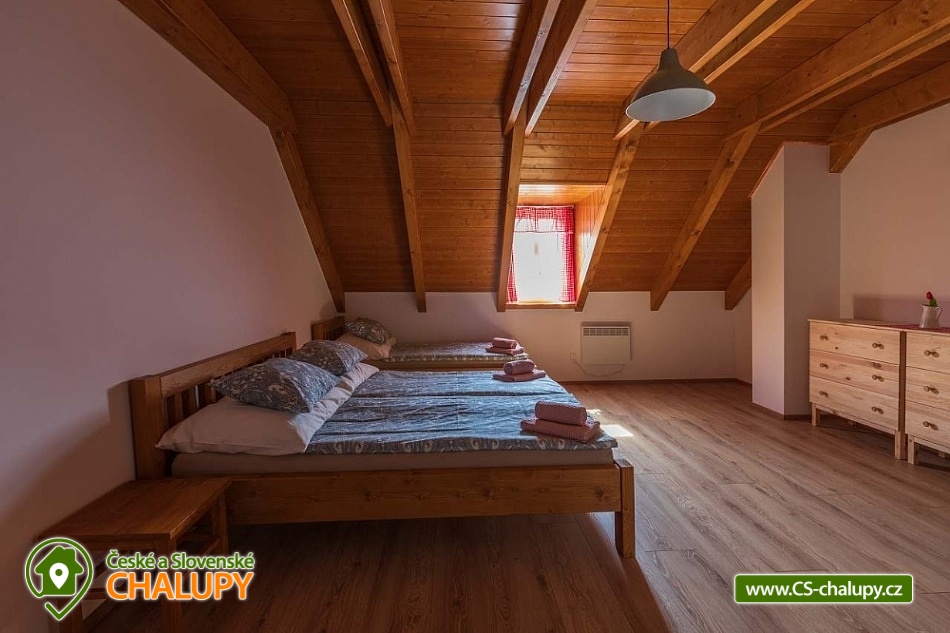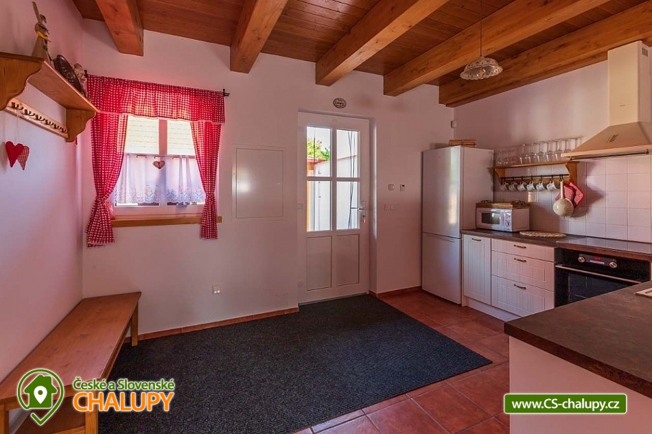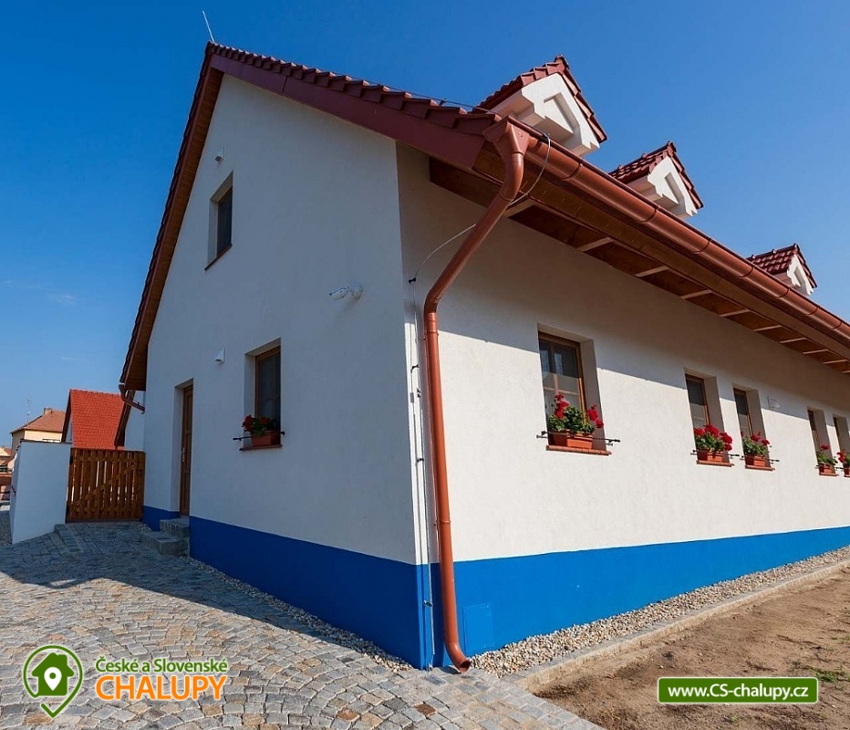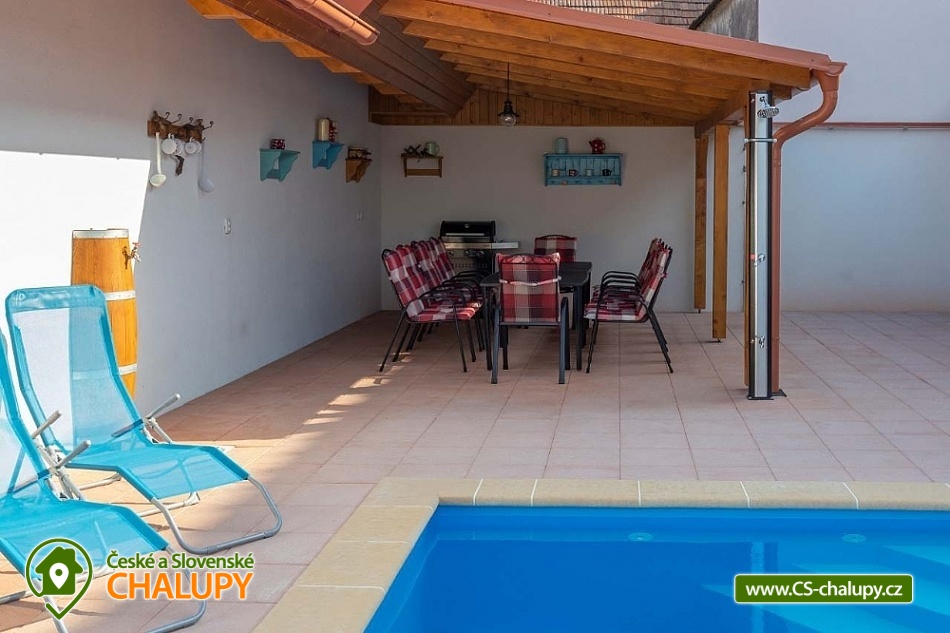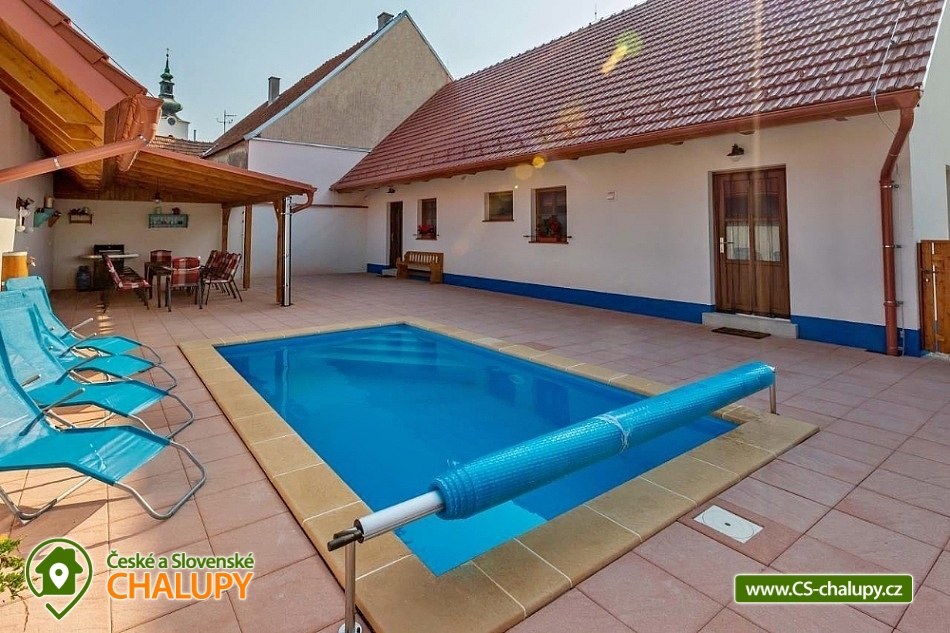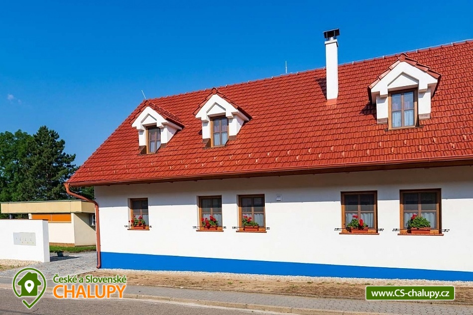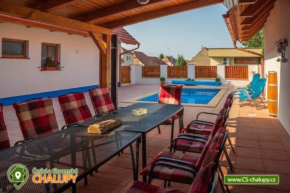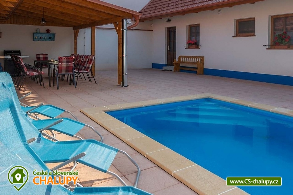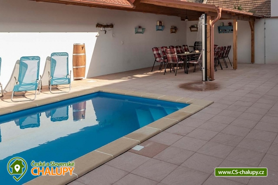 Chalupa s vyhřívaným bazénem pod Pálavskými vrchy u Novomlýnské nádrže - jižní Morava. Chalupa je zařízená ve venkovském stylu s klimatizací a venkovním bazénem 5 x 3 m, který je vyhřívaný tepelným čerpadlem. Chalupa je vhodná i pro rodiny s dětmi. Vinařská oblast plná cyklostezek a turistických tras. Čeká vás tady několik sklepů pro večerní koštování, vinic jsou kolem širé lány a víno nám šmakuje jako na celé Pálavě. Místní poklidný ráz je stvořený pro dovolenou. V chalupě pro až 13 osob jsou 3 samostatné pokoje (4+1,4, 4 lůžka), každý pokoj je s vlastním sociálním zařízením (WC, sprchový kout) a TV. Společenská místnost je s jídelnou a vybavenou kuchyní: myčka, mikrovlnná trouba, lednice s mrazákem, horkovzdušná trouba, kávovar Nespresso, rychlovarná konvice, pračka a vinotéka. Ve společenské místnosti jsou vnitřní krbová kamna, která zajišťují vytápění celého objektu a v každém pokoji je navíc el. topení. Chalupa má kryté venkovní posezení (pergola 6x5m) s možností grilování. Ze dvora (rozměr 16x9m) je přístup do kuchyně a společenské místnosti. V celém objektu i na dvoře je přístupná WI-FI. Kapacitu je možné rozšířit o dalších 13 osob v naší sousední chalupě 1M-188. V blízkosti se nachází Novomlýnské nádrže, Lednicko - Valtický areál, Pálavské vrchy, známé vinařské obce Velké Pavlovice, Zaječí, Rakvice, Velké Bílovice, Pavlov, Bulhary, Horní Věstonice, Dolní Věstonice atd., které jsou navzájem propojené cyklistickými stezkami a kde je možnost navštívit velké množství vinných sklepů a rodinných vinařství, kde je možné sjednat i řízenou degustaci vín.