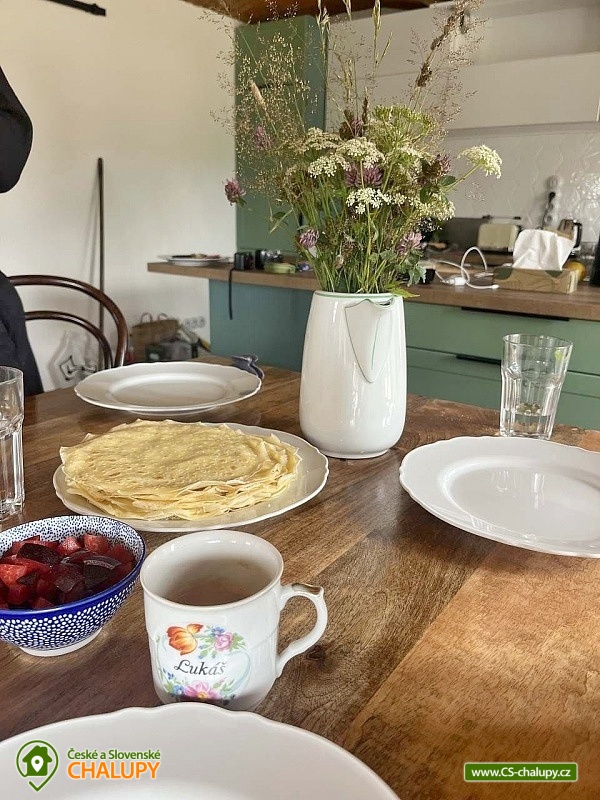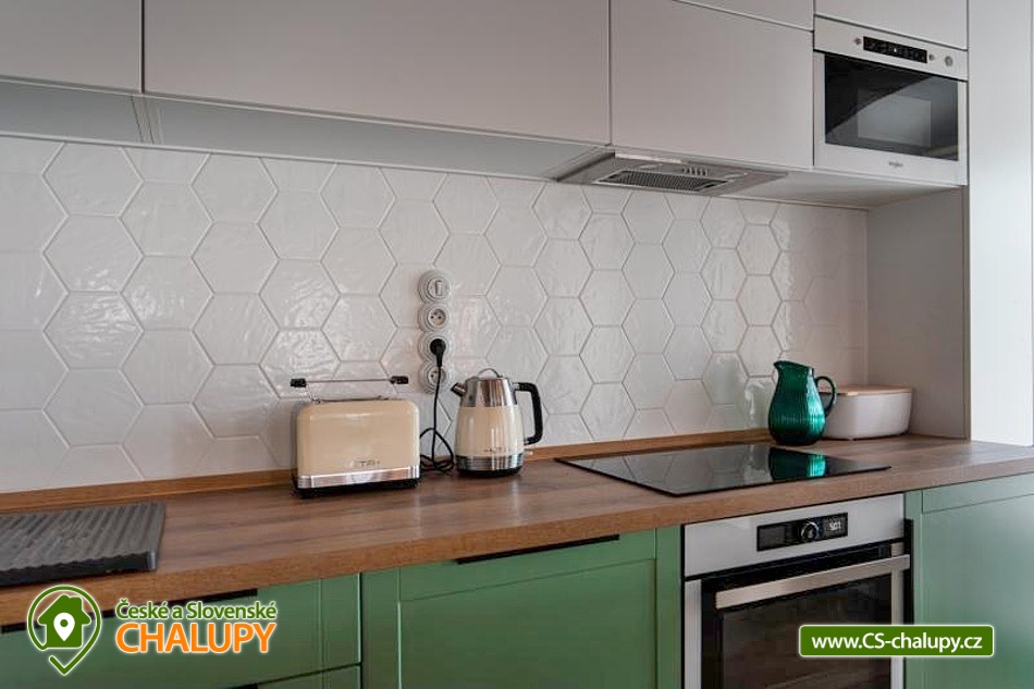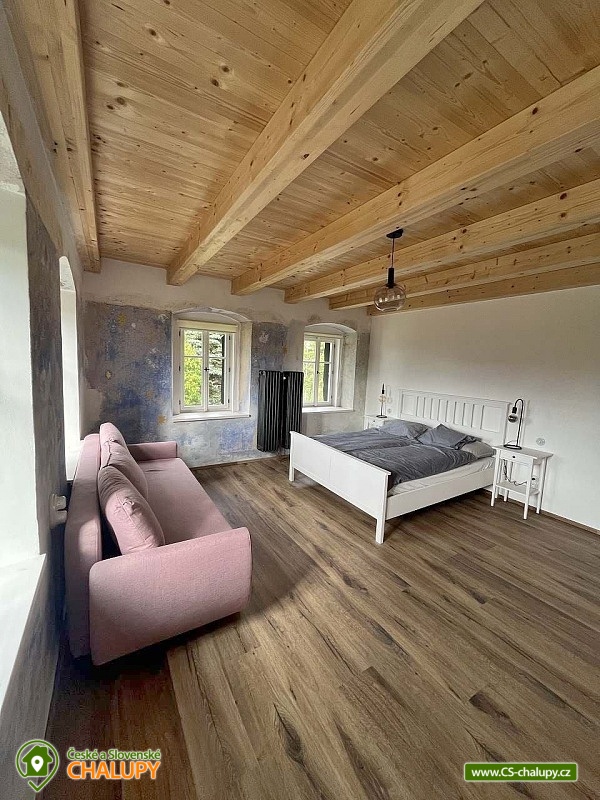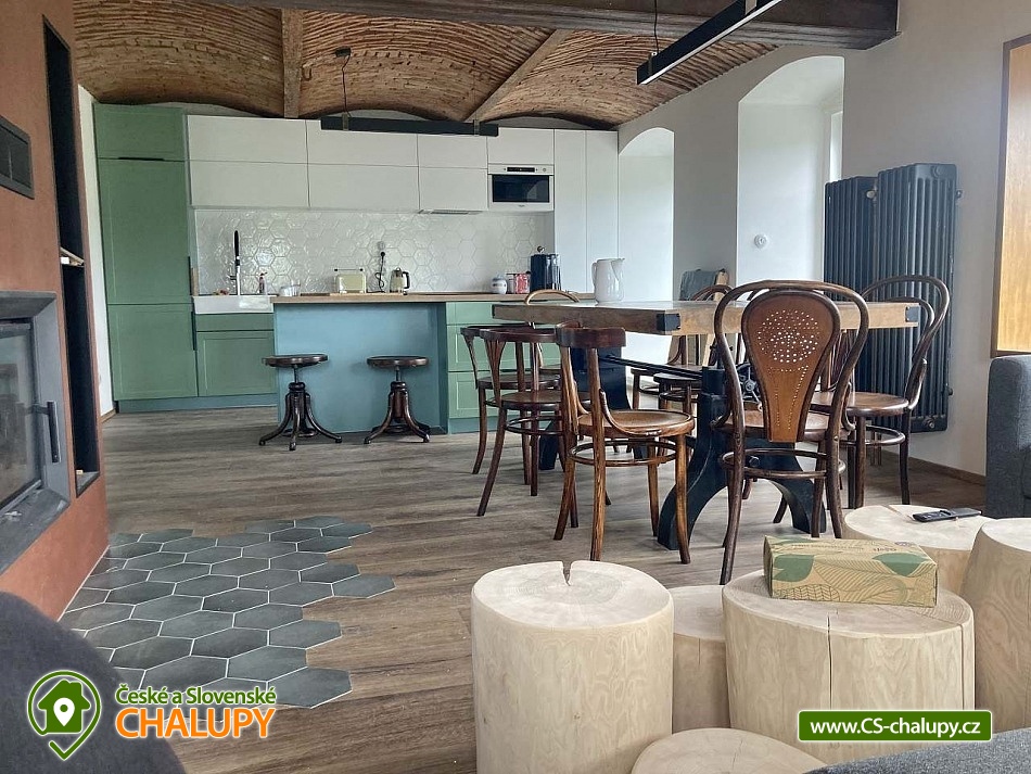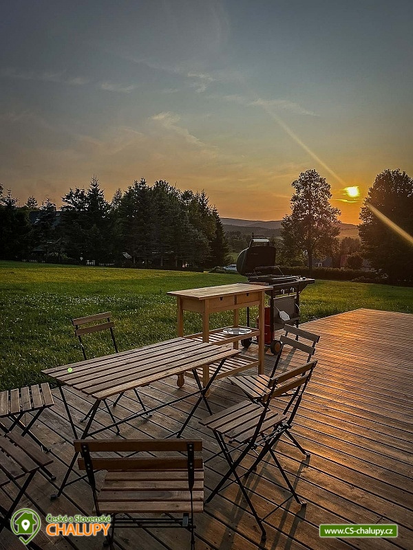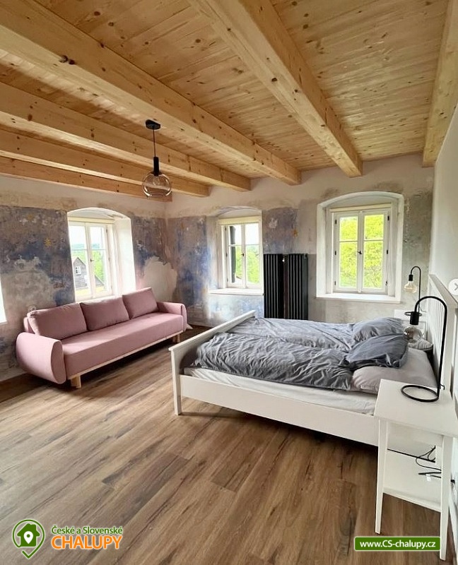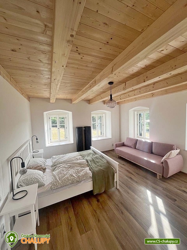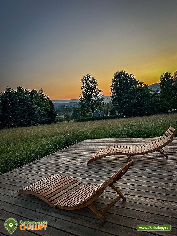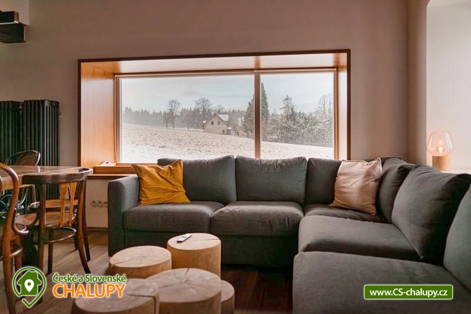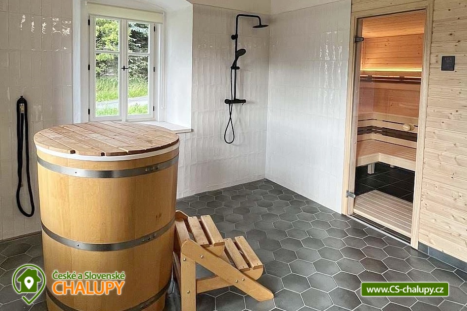 The Konírna Cottage is located near the forest and meadows in a quiet location in the town of Kovářská in the picturesque surroundings of the Ore Mountains. You can look forward to a stylish interior that combines traditional mountain architecture with modern elements. You can relax in the sauna. The Konírna Cottage offers accommodation for 18 people in 5 bedrooms. The accommodation is suitable for family recreation, larger groups or for organizing celebrations, teambuildings or exercise stays. On the ground floor there is a double bedroom with 1 double bed. Four more four-bed bedrooms are located upstairs. All have 1 double bed and 2 extra beds in the form of a sofa bed. On the ground floor there is an entrance hall, a utility room with a washing machine, a shoe dryer and a ski or bike rack. Pleasant moments can be spent in the common room with a fireplace, sofa, library, smart TV with O2TV, large window with seating, spacious dining table and fully equipped kitchen with island (fridge, freezer, oven, automatic bean-to-cup coffee maker, microwave, pantry, pots, pans, all dishes and cutlery). Pleasant relaxation can be enjoyed in the wellness room with a Finnish sauna for 6 people, ice tub, shower and loungers. For moments of fun, there is an attic space with a bar with a refrigerator, sofa, tables for sitting, ping-pong table, table football and built-in speakers in the ceiling. The bar also includes a cooling tap. A keg of beer can be provided upon request. WIFI internet connection is available throughout the building. The sanitary facilities include one bathroom with a shower and a separate toilet on the ground floor and one bathroom with a bathtub and toilet on the first floor. Another shower is by the sauna. Towels and sheets for sauna use are available. Heating is provided by central heating with a heat pump and an electric boiler. In the living room there is a fireplace stove with an exchanger enabling heating of the entire building. In the cottage you can borrow a vacuum cleaner, broom, cleaning products and slippers. The cottage has plenty of storage space, a fire extinguisher and a first aid kit. The living room is connected to a spacious sun terrace, where there is seating (table, chairs and benches), deckchairs and a gas grill. Parking is available directly at the property. Near the cottage there is the possibility of hiking, cycling, swimming, mushroom picking, skiing and cross-country skiing. The village includes a pond where you can swim and skate in winter, and a bowling alley. About 10 minutes from the cottage is the Klínovec area, which is used for skiing in winter and offers prepared trails of all difficulties for cyclists in summer. There are also ski resorts available: Loučná pod Klínovcem, Alšovka - Měděnec, Neklid - Boží Dar and others. Swimming options also include: aquapark Klášterec nad Ohří, swimming pool Perštejn, aquapark Jáchymov, Černé jezírko, Velký rybník Hroznětín, etc. Excursions in the surrounding area include the extinct village of Königsmühle, the Museum of the Air Battle over Kovářská, Měďník hill, Přísečnice water reservoir, Velký Špičák hill, Klášterec nad Ohří Castle or on the German side Fichtelberg above the town of Kurort Oberwiesenthal. We look forward to seeing you there.