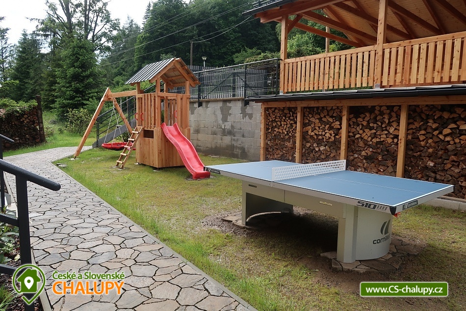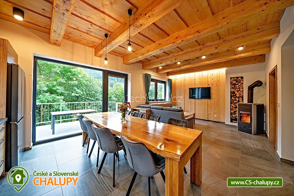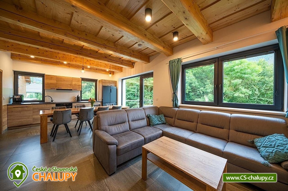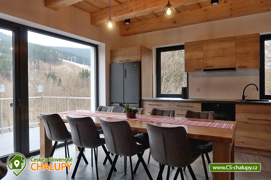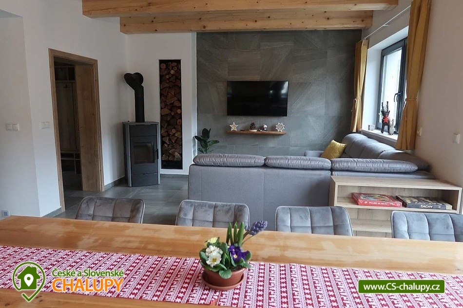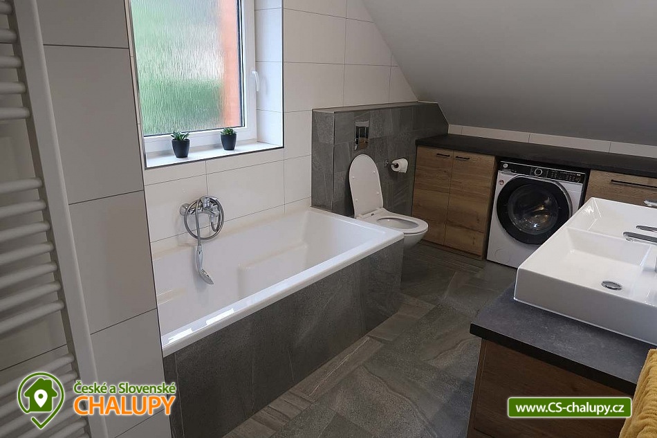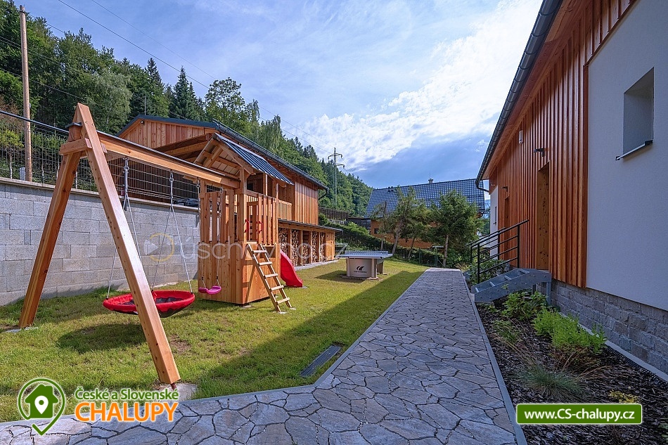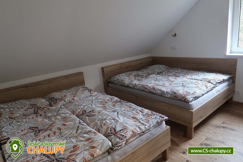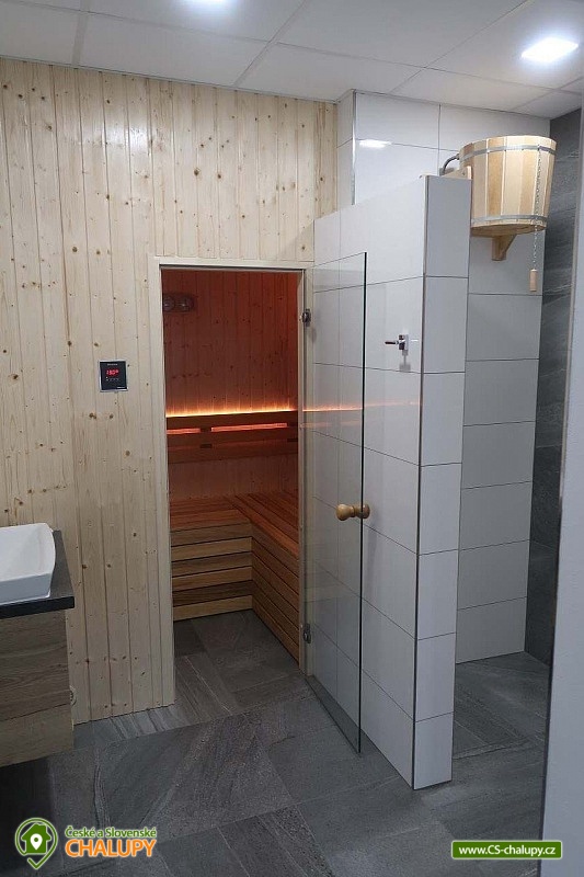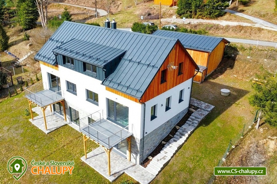 Wellness cottage Kouty with sauna and whirlpool - Kouty nad Desnou. Renting 2 cottages for 2 x 11 people, which are separated and rented separately. It is possible to rent both parts of the cottages at once for up to 22 people. Each cottage has its own wellness area with a private hot tub and sauna. Each cottage has 2 bedrooms, one bedroom has two double beds and the other bedroom has two double beds and one single bed, 2 extra beds available. The kitchen is well equipped with all appliances, dishwasher, induction, microwave oven, hood, American fridge, coffee maker, toaster, etc. In the living room there is a television with internet. Seating and a table with six chairs on the terrace. Quality hot tub and Finnish sauna in the basement. Each half of the cottage has three bathrooms - two showers and one bathtub and three toilets, of which two toilets are separate and one is in the bathroom. The floor heating is connected to an electric boiler and a fireplace with an exchanger in the entire building. Parking is for 4 cars in the closed building and another 3 cars can park outside the building behind the fence. The entire plot is fenced, has 1300 m2 and in the lower part each half of the cottage has a separate garden. There are swings and a common garden fireplace for grilling. In the vicinity of the building, hiking, cycling, swimming, mushroom picking, fishing, skiing and cross-country skiing are possible. There is also a golf course nearby. Swimming options include, for example: Domašov - Bělá pod Pradědem swimming pool, Velké Losiny - thermal baths, Velké Losiny thermal swimming pool, Rapotín swimming pool, Karlova Studánka swimming pool, Jeseník swimming pool, Jeseník - Priessnitz pool, Krásné dam, Hynčice pod Sušinou - Úžas pond, swimming pool Šumperk - Bratrušák, Šumperk pool - Aquacentrum, etc. In winter, nearby ski resorts are available: Kouty nad Desnou or, for example, Červenohorské sedlo. We look forward to seeing you here.