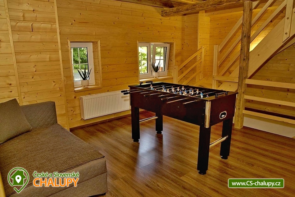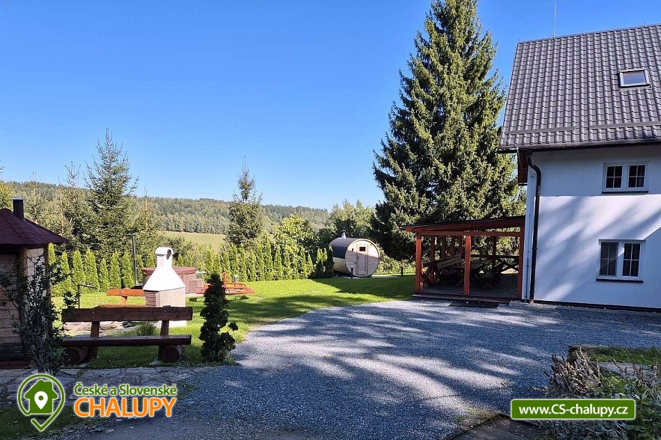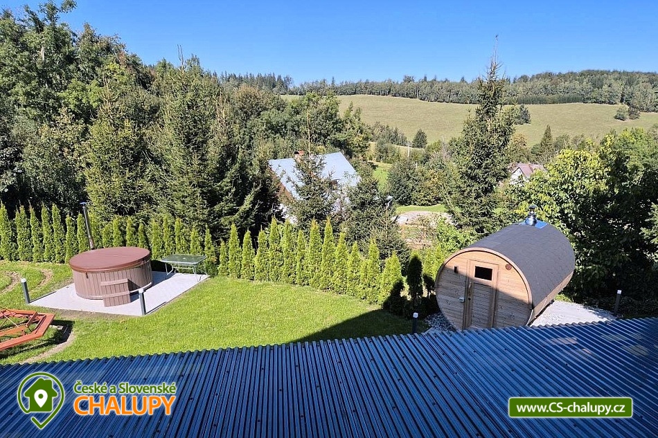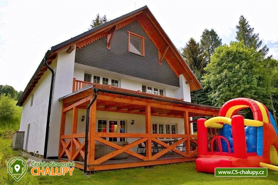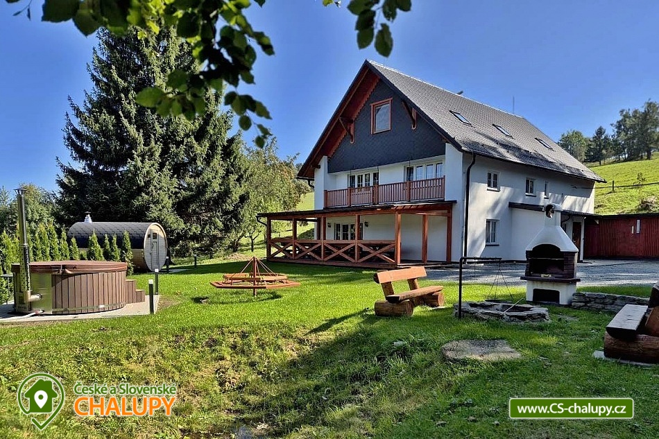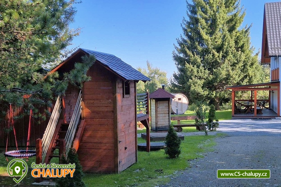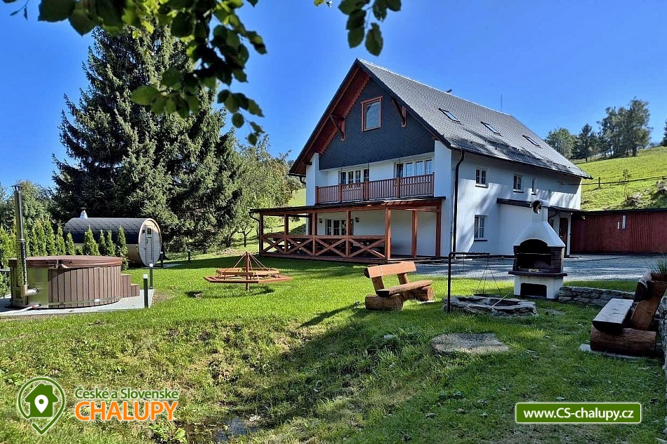 Comfortably equipped wellness cottage near Indrů (Finnish sauna + heated bathing barrel + whirlpool) equipped for maximum comfort and family stays (inflatable bouncy castle). Location in a quiet part of the cottage settlement near the village of Zálesí u Javorník in the Rychlebské hory. Nature lovers will enjoy hiking and cycling, or just relax and enjoy the beautiful view of the surrounding pastures and forest. We place maximum emphasis on cleanliness - satisfied guests will appreciate our work. The cottage for rent provides accommodation for up to 22 people in 7 bedrooms. DESCRIPTION: Ground floor - bedroom (double bed, 2 persons). Living room (folding couch), TV and SAT. Fully equipped kitchen (ceramic hob, electric oven, microwave oven, kettle, fridge with freezer, capsule coffee machine and dishwasher). Floor - room no. 1 (double bed + single bed). Room No. 2.- (double bed). Room No. 3.- (double bed). Room No. 4. (double bed + single bed). Room No. 5. (double bed + 2 x single beds). Room No. 6 (double bed + 2 single beds). Upstairs there is also a common room where you can sit on the sofa or play table football. Social facilities: 2x bathroom (shower) + 2x WC. Heating: fireplace stove + automatic pellet boiler. Parking right next to the cottage, 10 parking spaces. In the garden near the cottage there is a bouncy castle (for a fee) and a sandpit for your children. There is table tennis and darts under the gazebo. You can also play pétanque, cricket or frisbee in the garden. You can leave your sports equipment in the shed. On summer days, you can use the charcoal grill or fire pit. Treat yourself to draft beer on the terrace with outdoor seating - we can lend you a beer tap. No one will disturb you during your stay because there is a very bad mobile signal at the cottage and we don't even have internet here. Surroundings: Rychlebské trails - cycling, Lesní bar Stříbrný pramen - Zálesí, which is run by the owner of the cottage himself. Also, the Jánský Vrch castle in Javorník, Borůvková hora - a nearby 899 m high peak with the possibility of visiting the observation tower, Tančírna in Račí údolí - a reconstructed architectural monument (concerts, exhibitions). Indoor swimming pool Javorník, Swimming pool Červenka and Otmuchowski lake. Ski resorts in winter: Filipovice, Horní Lipová, Ladek Zdrój. We look forward to seeing you here.