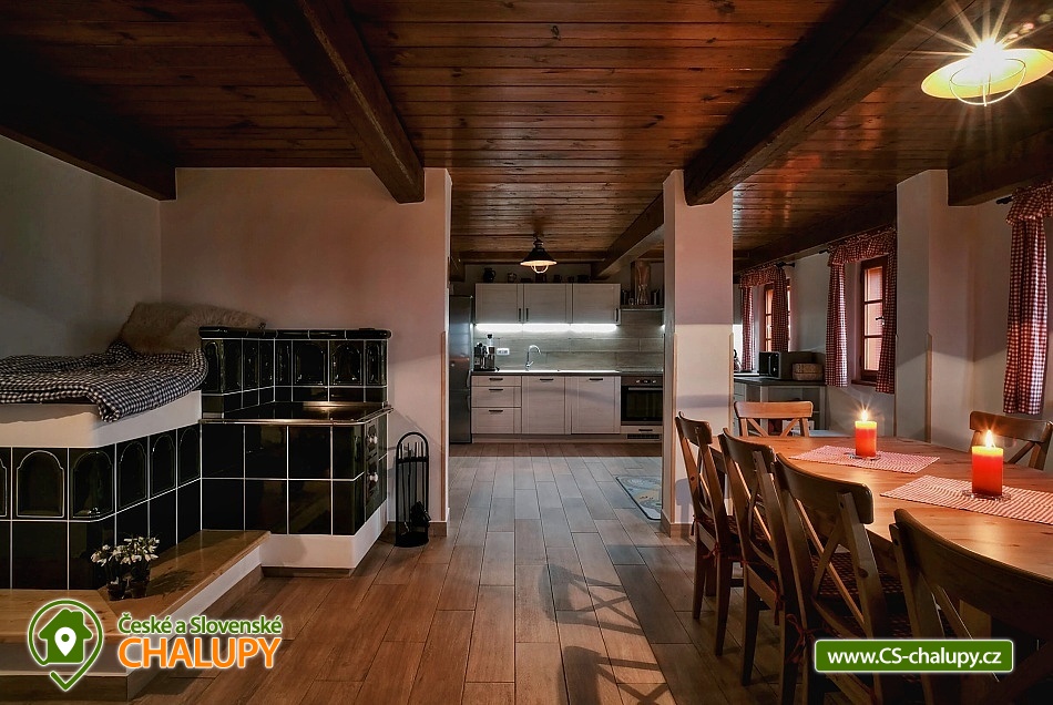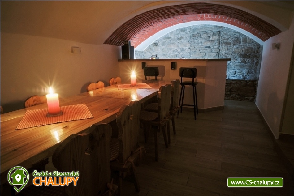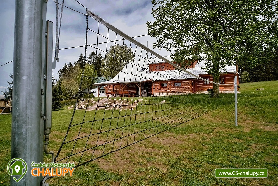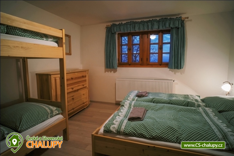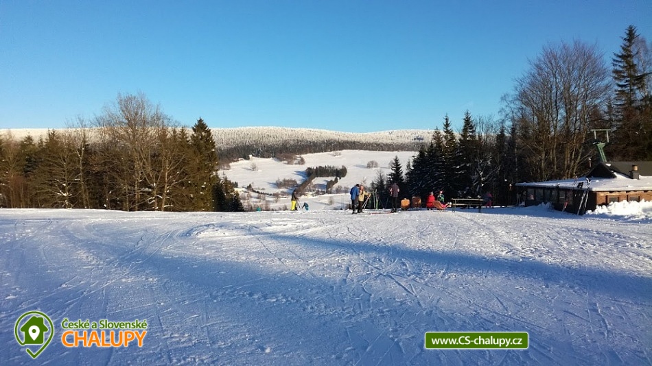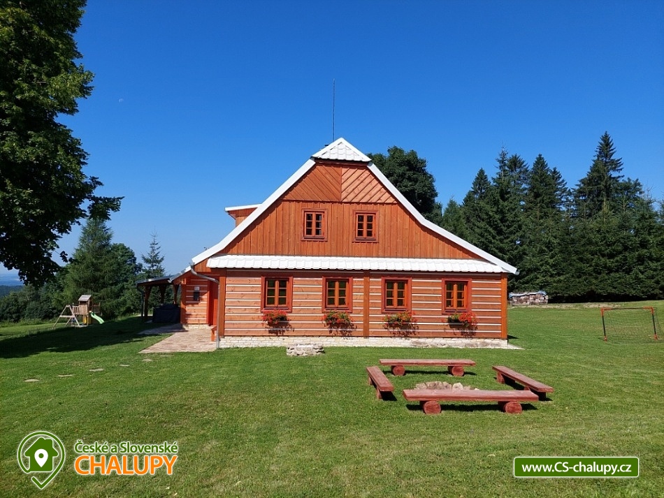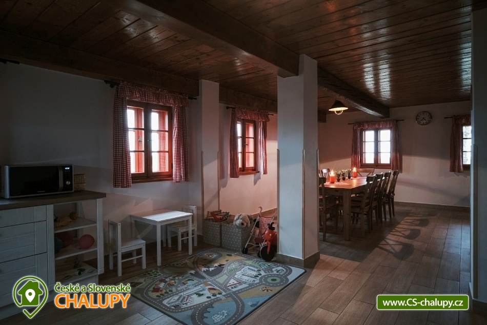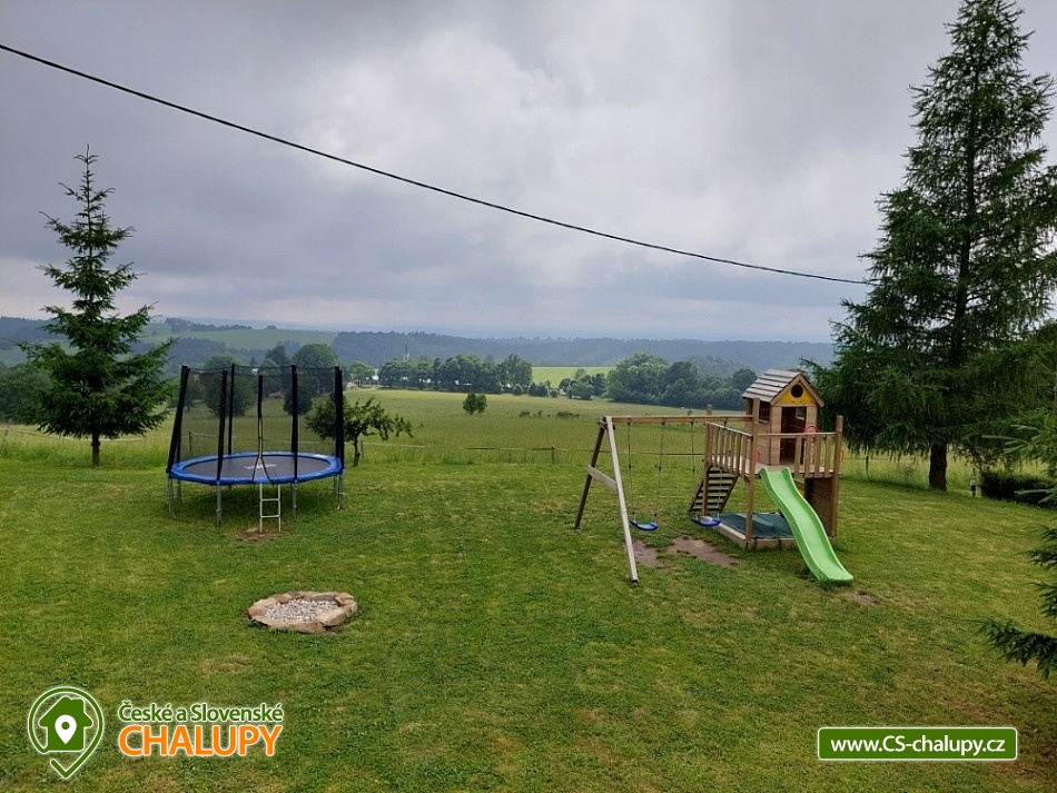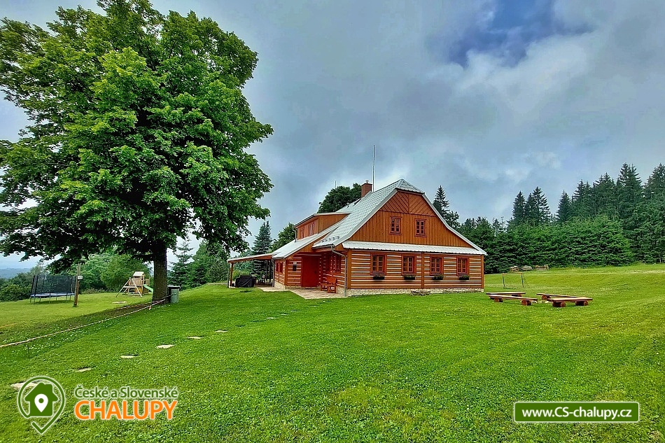 Cottage Kunčinka - Zdobnice - Kuncina Ves. Newly renovated and luxuriously furnished holiday cottage with sauna Kunčinka stands in the small village Kunčina Ves near the ski resort Zdobnice in the heart of the Eagle Mountains. It provides cozy accommodation for families with children and all other age groups throughout the year. On the ground floor of the cottage there is a spacious sitting room with fully equipped kitchen, seating for 14 persons, sofa, TV, tiled stove with oven and play corner for children, bathroom and toilet, WIFI. Guests have a sauna for about 7 people with shower and toilet, bike room, ski room and wine bar with seating for 10 people, bar and cooler for beer barrels. On the 1st floor there are 4 spacious bedrooms for 17 persons (with 2 extra beds) - 1st room: 5-6 pers., 1x double bed, 3x single bed + possibility of one extra bed., 2nd room: 3 pers., 1x double bed and 1x single bed, 3. room: 4 pers., 1x double bed, 1x bunk bed (200x80cm), 4. room: 5-6 pers., 1x double bed, 3x single bed + possibility of one extra bed, bathroom and 2x separate WC. For the smallest customers there is a portable baby cot, dining chair, changing pad, potty other small items for maximum comfort. Heating is solved by heat pump, throughout the ground floor is underfloor heating, upstairs are radiators. It is also possible to flood in a tiled stove and relax in the oven. The cottage includes an outdoor seating area with gas grill with the possibility of renting barbecue equipment, fireplace, playground with sandpit, climbing frame and trampoline and playground for volleyball, netball or badminton. Parking is available in the parking lot directly at the cottage (6 parking spaces). In winter, we recommend snow chains with more snow. The cottage is located in a remote area and is surrounded by a large meadow and adjacent forest. Enjoy panoramic views of the surrounding countryside, romantic walks in the surrounding area and mushroom pickers. Hiking and cycling enthusiasts can look forward to a number of hiking trails and a network of cycle paths in the area. Children can enjoy winter sleigh rides near the cottage, adults and older children can use the offer of several ski resorts and choose from a number of cross-country trails. The best accessible ski resort is Zdobnice about 800 m from the cottage (the upper station of the lift Valčenka, accessible by car or on foot). It offers 3 ski lifts, a ski school, ski equipment hire, snacks and a children's play area.
