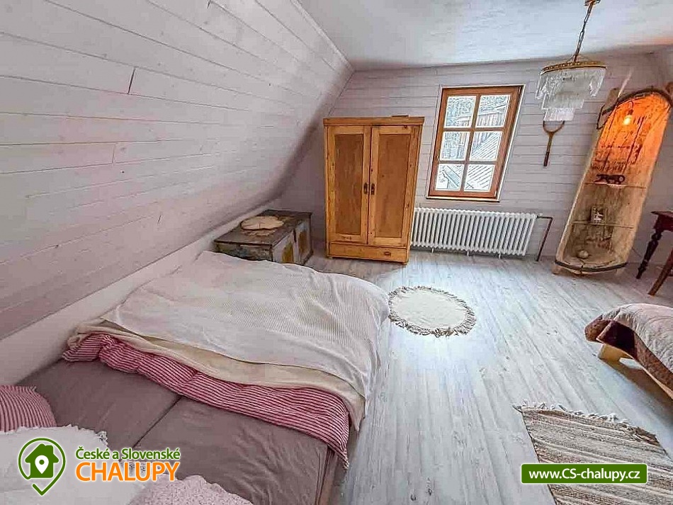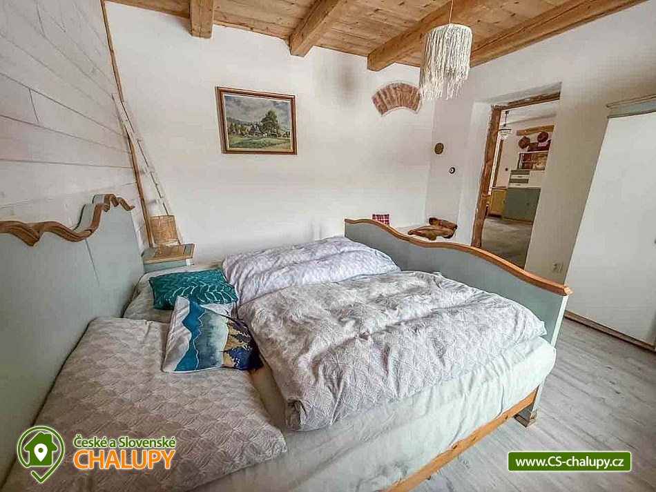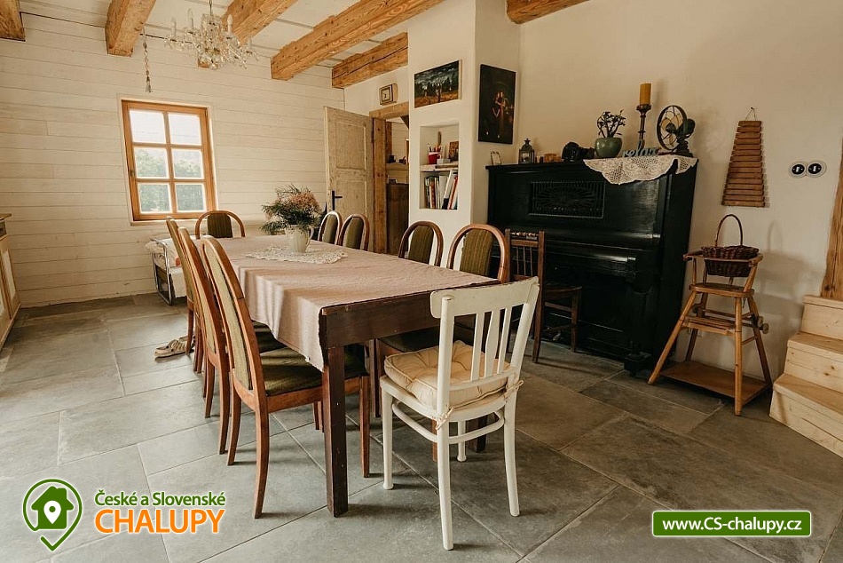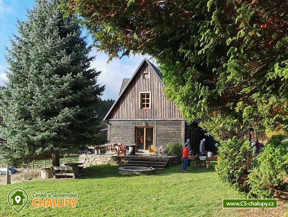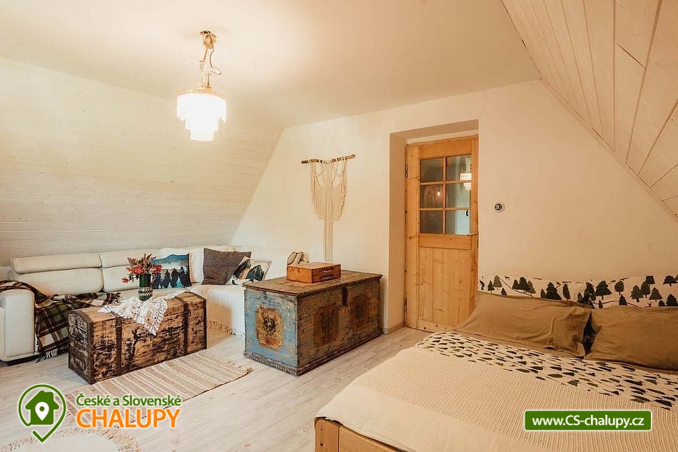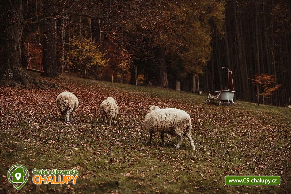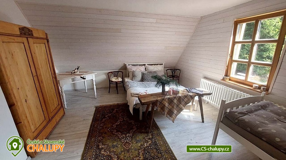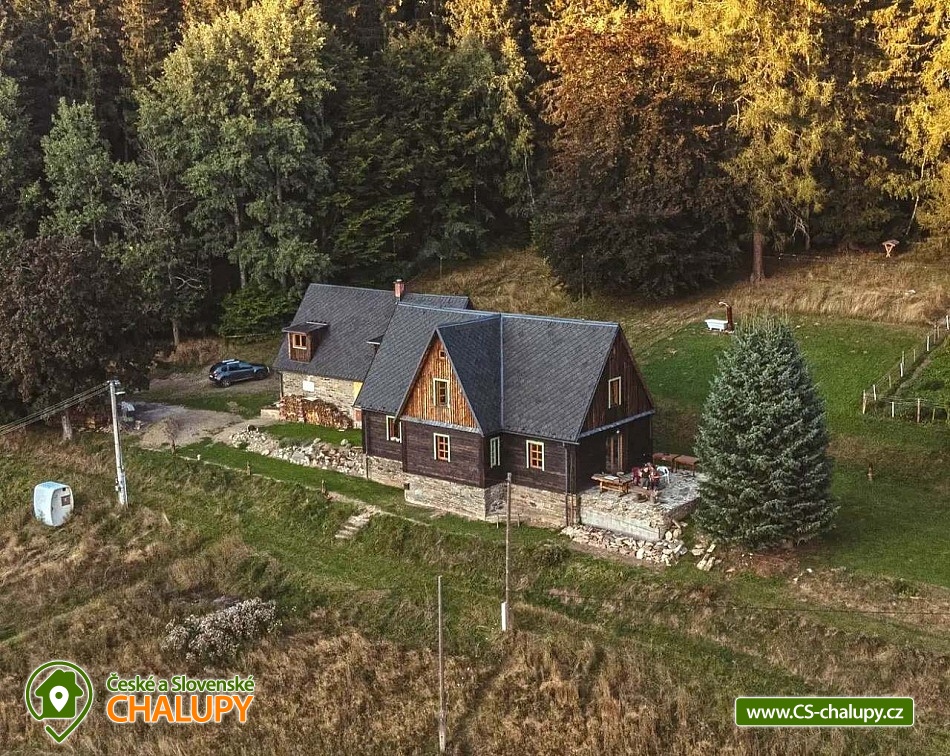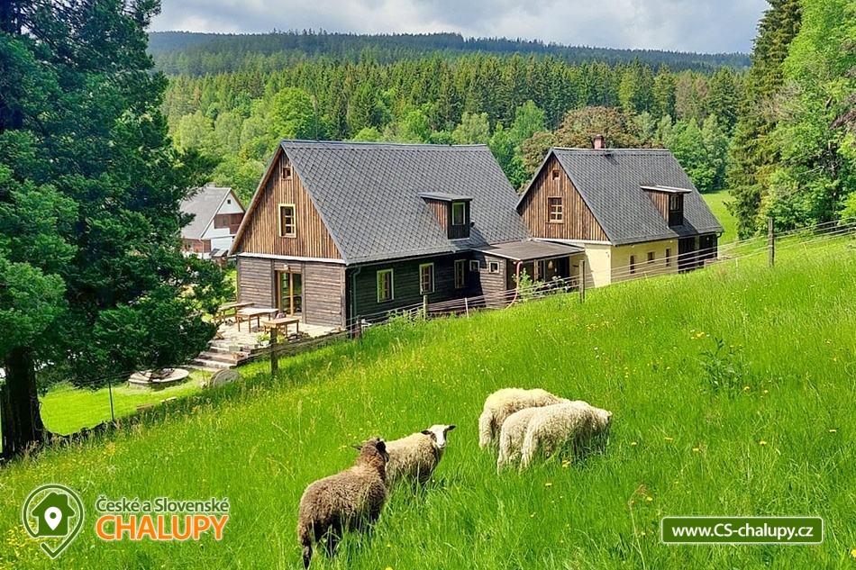 Chalupa se saunou v Jesenických horách nedaleko Karlovy Studánky a hory Praděd. Chalupa leží na polosamotě u lesa a v krásné přírodě CHKO Jeseníky. Nabízí ubytování pro až 15 osob v 5 ložnicích (2x dvoulůžková, 1x dvoulůžková + dětská přistýlka a 2x čtyřlůžková). V podkroví je další místnost, která slouží jako tělocvična i relaxační místnost. Ideální pro cvičení jógy, meditace, terapie nebo společné aktivity. Díky možnosti přemístit matrace nabízí také další místo k přespání pro 10 osob. K dispozici je plně vybavená kuchyň (indukční varná deska horkovzdušná trouba, dvě lednice, myčka nádobí, rychlovarná konvice, toustovač, sušička na ovoce a dále pak náš oblíbený coffee spot – útulné místo s kavárenským stolečkem, kávovarem na zrnkovou kávu, překapávačem, moka konvičkou i ručním mlýnkem). V jídelně je velký stůl s kapacitou až pro 12 osob - vytváří ideální prostor pro společná jídla i večerní posezení. Atmosféru dotváří starý klavír a gramofon, které dodávají místnosti kouzlo venkovské chalupy. Z jídelny je přímý vstup na terasu, kde v létě hosté rádi stolují a grilují s výhledem do přírody Jeseníků. Sociální zařízení zahrnuje 1x koupelnu s vanou a WC v patře, 1x koupelnu se sprchovým koutem a 2x samostatné WC v přízemí. Objekt je vytápěn centrálně elektrokotlem. V přízemí je podlahové topení, v 1. a 2. NP radiátory. Ohřev vody zajišťuje moderní elektrický bojler. K dispozici Wi-Fi připojení. Parkování je možné přímo u chalupy pro 8 aut. Chalupa je obklopena přírodou a nabízí několik míst k odpočinku i setkávání: venkovní ohniště pro večerní posezení, kamenná terasa s bylinkovými záhony - v letních měsících oblíbený prostor pro doušek kávy či čaje. Ovečky jako součást chalupy, které dotvářejí venkovskou atmosféru a jsou radostí zejména pro děti. K dispozici je také sauna a kolárna/lyžárna pro bezpečné uložení sportovního vybavení. Okolí je ideální pro pěší turistiku, cyklovýlety, běžky, skialpy i klidné procházky přírodou. V zimě jsou v dosahu běžkařské trasy a lyžařská střediska, v létě koupání v přírodě a houbaření. Tipy na výlety: Praděd, naučné stezky Kotel, kolem pramenů Moravice, Bílé Opavy, Karlova Studánka - lázně, přečerpávací elektrárna Dlouhé Stráně a turistické trasy v CHKO Jeseníky. Koupání: rybník Andělská Hora, koupaliště Vrbno p. Pradědem, krytý bazén a koupaliště Bruntál, přehrada Slezská Harta, Karlova Studánka. Lyžování: v místě Poma (300 m), výjezd na lyžařské středisko Praděd - Ovčárna, ideální běžecké terény, množství dalších vleků v blízkém okolí. Těšíme se na Vás u nás.