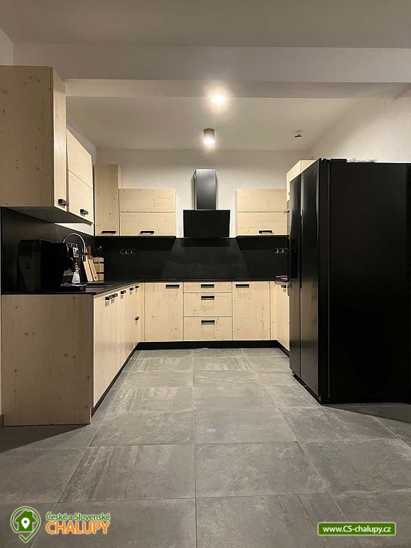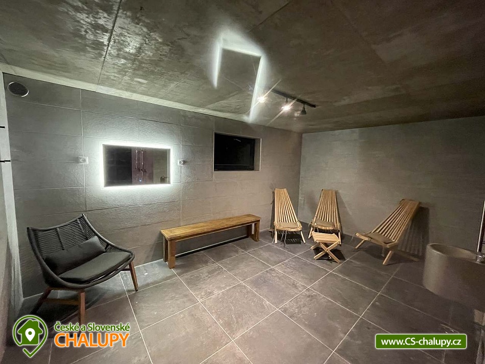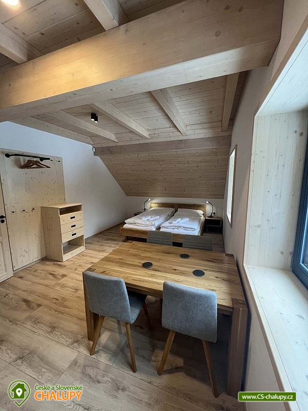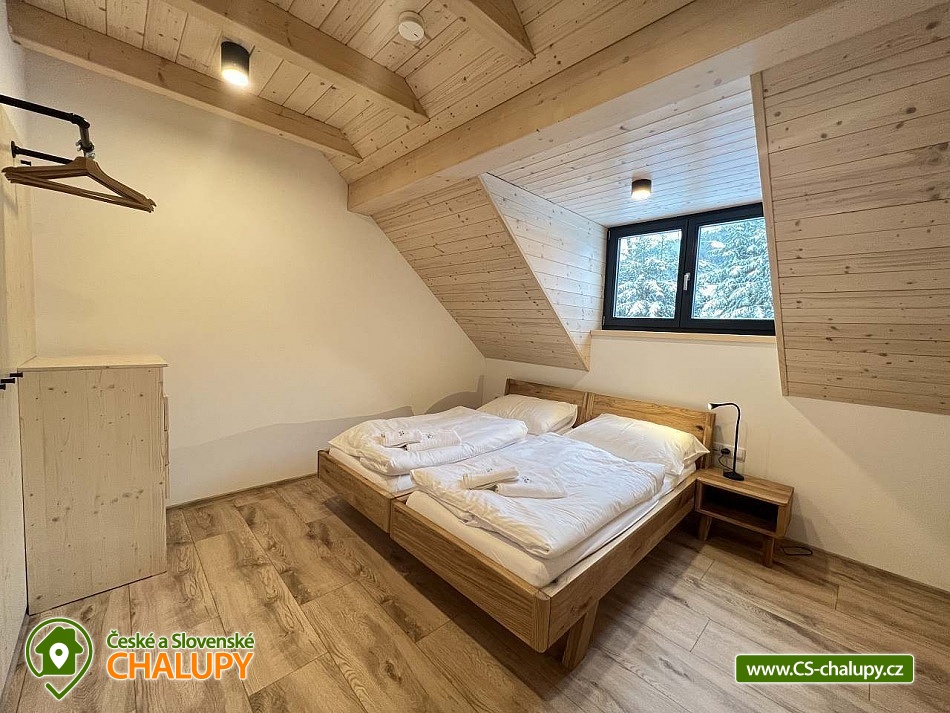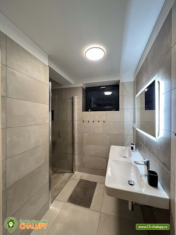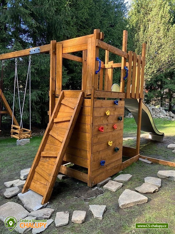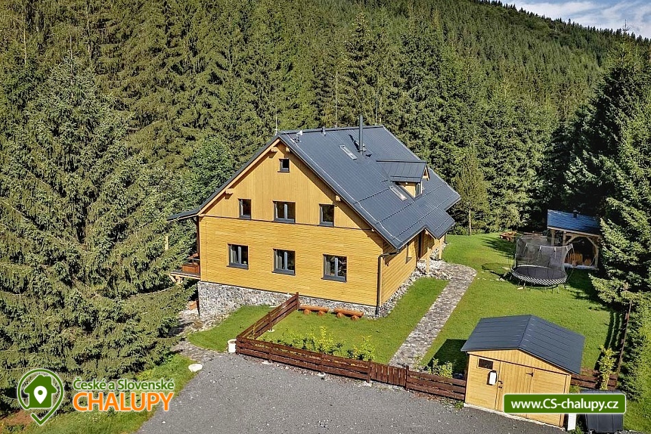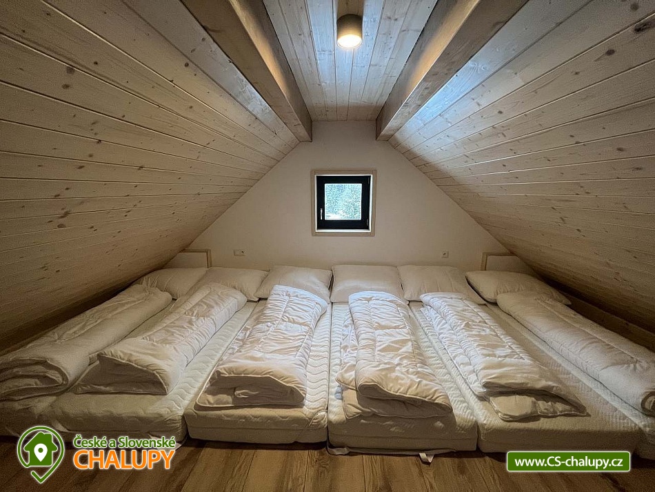 Chata Nový Zlatník with a sauna - Krásná - Lysá hora - accommodation PLACE Beskydy. The cottage for rent provides accommodation for up to 28 people in a total of 9 bedrooms. It is perfect for stays with children, as well as for corporate events or meetings with friends. There are a total of 24 beds available (4 of which are fold-out beds) and another 4 extra beds (quality mattresses) and 2 cots. All apartments and rooms have their own bathroom with WC, except for one 4-bed room. Social facilities include a total of 5 bathrooms with toilets (shower and sink), 2 showers by the sauna and 1 separate toilet. Heating is provided by hot water underfloor heating and a fireplace in the common room. Meals are self-catering with the possibility of cooking in very well-equipped kitchenettes. There are a total of 2 available (a larger kitchen in the common areas and a smaller kitchen upstairs). In addition, a common room with a dining room: a common kitchen with a dishwasher, oven, coffee machine, faucet, American refrigerator, dining tables for 24 guests, TV 65", wifi, fireplace, sofa, football table and outdoor covered terrace with seating. There is parking for 5 - 7 cars at the cottage, other places in the parking lot 50m from the cottage, where there is also a bus stop. At the cottage, there is an outdoor seating area with a grill, a fire pit, climbing frames for children, a trampoline and a large plot of land with a stream. The cottage is located in the beautiful Beskydy countryside, so there are a number of tips for trips to the surrounding area. We recommend cycling routes in the vicinity of the building. In winter, ski areas: Sviňorky, Zlatník, Radegast, Visalaje. Year-round water parks: Olešná Tropikana and Pool: Morávka. Rope park Tarzania - Pustevny. Tourism: Lysá hora, Prašivá, Bíly kříž, Svarná Hanka, Travný. We look forward to seeing you here.