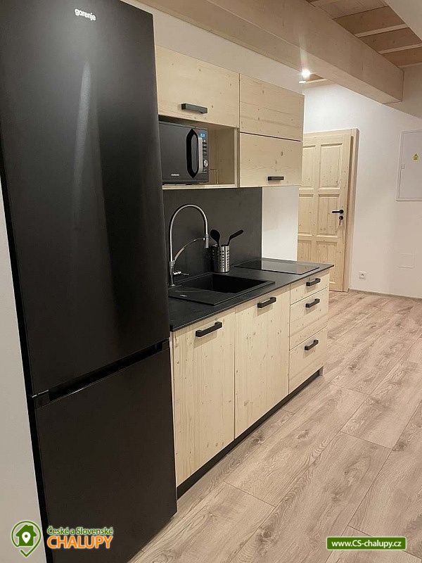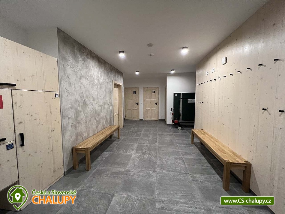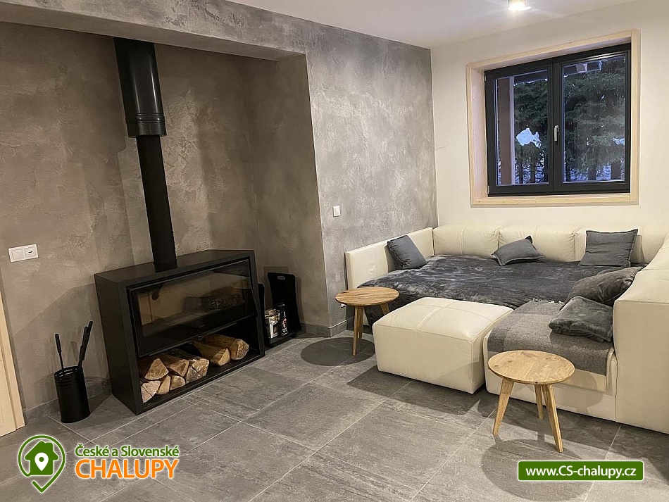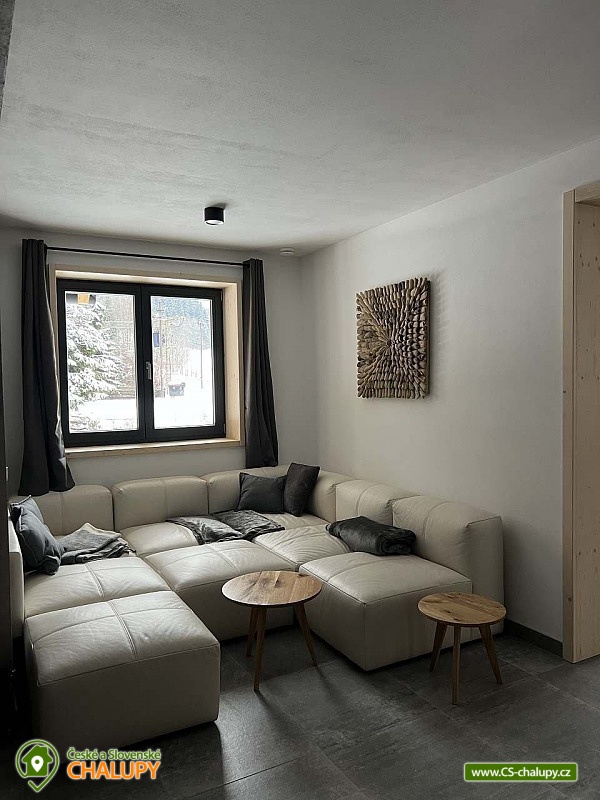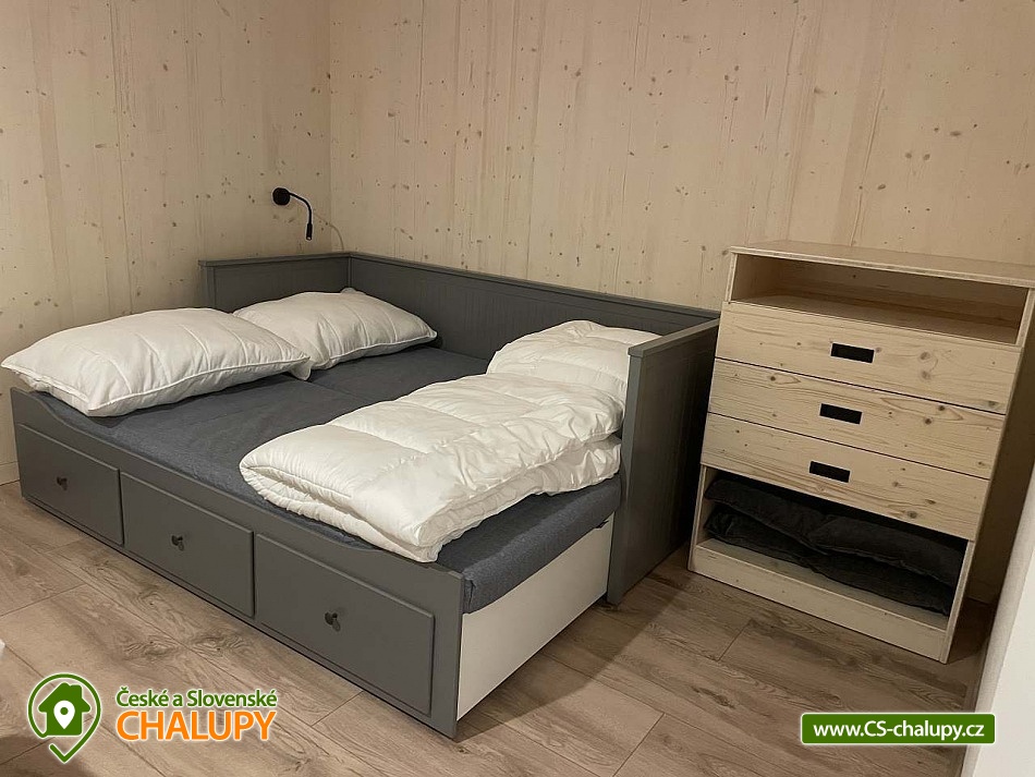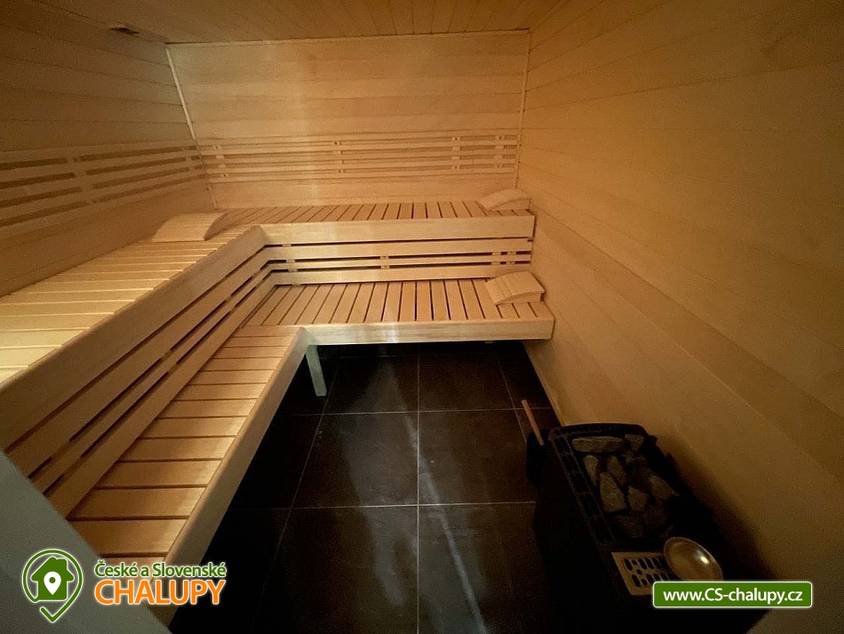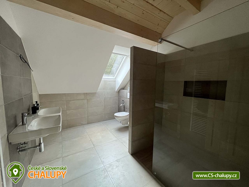 Chata Nový Zlatník with a sauna - Krásná - Lysá hora - accommodation PLACE Beskydy. The cottage for rent provides accommodation for up to 28 people in a total of 9 bedrooms. It is perfect for stays with children, as well as for corporate events or meetings with friends. There are a total of 24 beds available (4 of which are fold-out beds) and another 4 extra beds (quality mattresses) and 2 cots. All apartments and rooms have their own bathroom with WC, except for one 4-bed room. Social facilities include a total of 5 bathrooms with toilets (shower and sink), 2 showers by the sauna and 1 separate toilet. Heating is provided by hot water underfloor heating and a fireplace in the common room. Meals are self-catering with the possibility of cooking in very well-equipped kitchenettes. There are a total of 2 available (a larger kitchen in the common areas and a smaller kitchen upstairs). In addition, a common room with a dining room: a common kitchen with a dishwasher, oven, coffee machine, faucet, American refrigerator, dining tables for 24 guests, TV 65", wifi, fireplace, sofa, football table and outdoor covered terrace with seating. There is parking for 5 - 7 cars at the cottage, other places in the parking lot 50m from the cottage, where there is also a bus stop. At the cottage, there is an outdoor seating area with a grill, a fire pit, climbing frames for children, a trampoline and a large plot of land with a stream. The cottage is located in the beautiful Beskydy countryside, so there are a number of tips for trips to the surrounding area. We recommend cycling routes in the vicinity of the building. In winter, ski areas: Sviňorky, Zlatník, Radegast, Visalaje. Year-round water parks: Olešná Tropikana and Pool: Morávka. Rope park Tarzania - Pustevny. Tourism: Lysá hora, Prašivá, Bíly kříž, Svarná Hanka, Travný. We look forward to seeing you here.