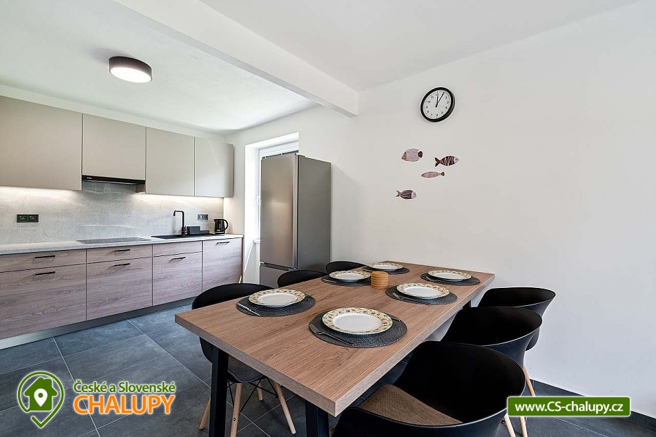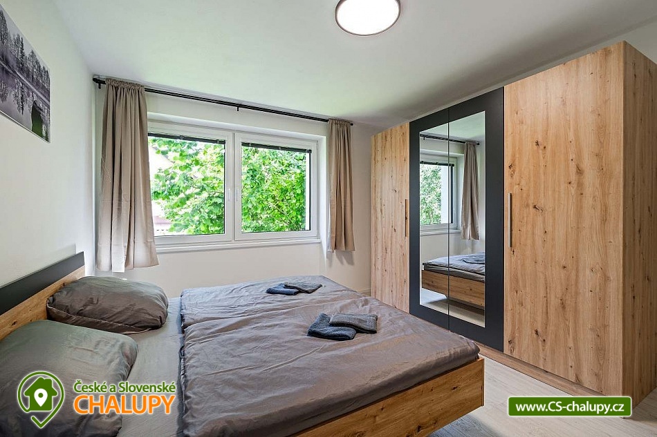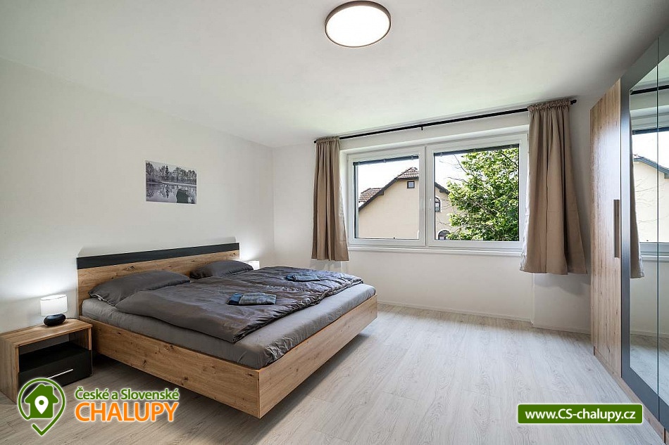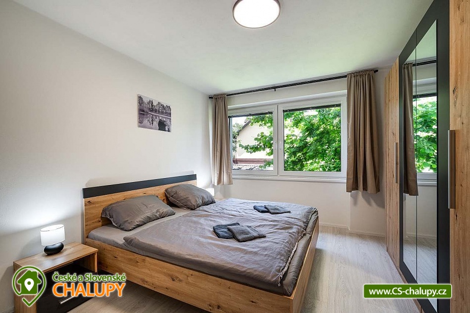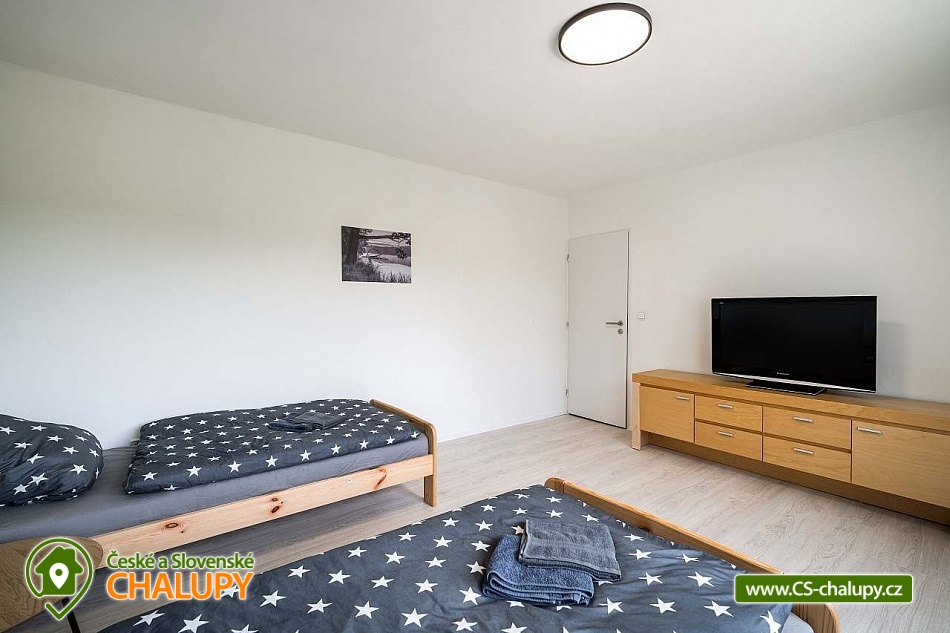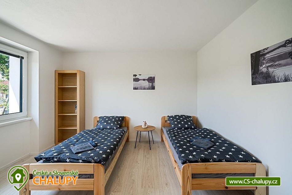 Cottage with sauna - Apartments Třeboň is located in the village of Stříbřec in the heart of the picturesque landscape of the Třeboň ponds. The nearby natural surroundings are interwoven with a number of hiking and cycling trails. The cottage offers accommodation for 12 people in two separately rented six-bed apartments with their own kitchen and bathroom. Both apartments have the same layout. There are two double bedrooms (1 double bed and 2 single beds) and 2 extra beds in the form of a sofa bed in the living room. The bedrooms are equipped with comfortable beds with high-quality mattresses, bedding and there are also bedside tables with a lamp. The windows are equipped with blackout curtains and outdoor blinds, which ensure a peaceful and undisturbed sleep. A cot is available for rent. You can spend time together in the living room with a comfortable sofa bed, coffee table and flat-screen TV, where you can fully use Wi-Fi and TV services. The living room is connected to a fully equipped kitchen (fridge with freezer, induction hob, dishwasher, microwave, oven, electric kettle, capsule coffee maker, toaster, dishes, cutlery, pots, pans, towels, a jar for dishes, kitchen utensils and basic ingredients such as salt and pepper). The kitchen includes a dining table with six chairs. A high chair is available for rent. Both apartments have a balcony. The sanitary facilities include one bathroom in each apartment with a modern shower and toilet. There is a washing machine, hairdryer, mirror, towels and hand soap. Heating is provided by a heat pump. For all guests, a common room with a children's playroom, table tennis and darts is available in the lower part of the cottage. You can relax in the sauna. Outside, you can sit on the spacious roofed terrace with comfortable garden seating for up to 6 people. There is also a fireplace including grilling forks for sausages. The children's playground is located next to the outdoor seating. A lockable bicycle shed can be used to store bicycles. Parking is available directly at the property. There are two parking spaces. The property is protected by an outdoor camera system. Hiking, cycling, swimming, mushroom picking and fishing are possible in the surroundings of the cottage. Swimming options include: Aurora Třeboň Spa, Nový Stříbřecký Pond, Staňkovský Pond, Rožmberk Pond, Hejtman Pond, Velký Hatínský Pond, Cep Sandpit, Novomlýnský Pond - Peršlák, Opatovický Pond, Svět Pond, etc. Excursions in the surrounding area are popular with visitors to Třeboň Castle, Jindřichův Hradec Castle and Chateau, Nová Bystřice Veterans Museum or České Budějovice. We look forward to seeing you here.