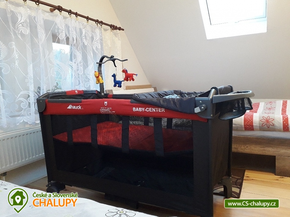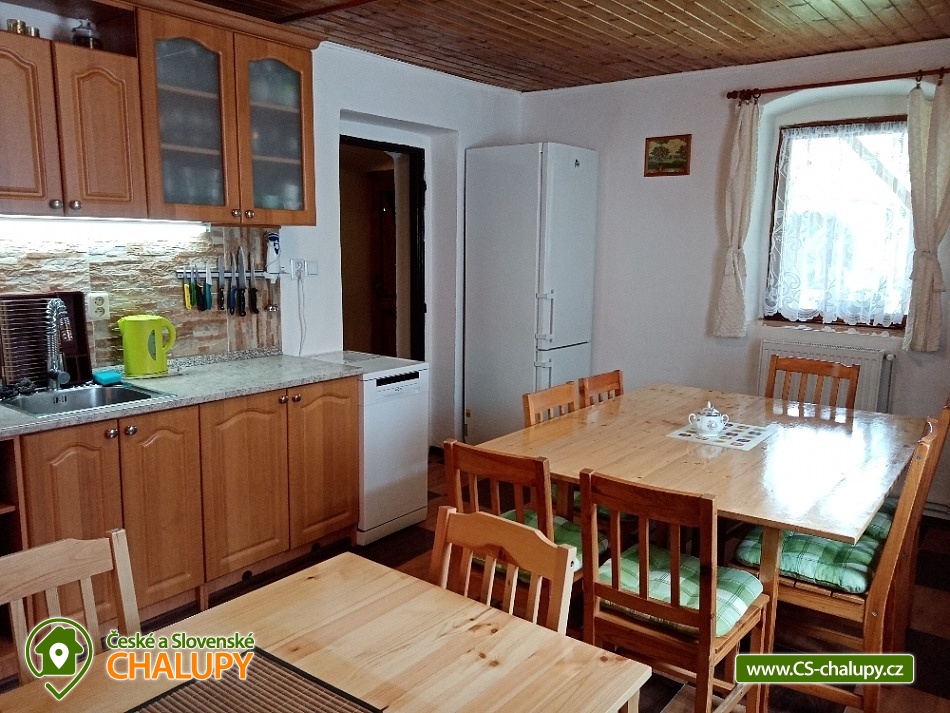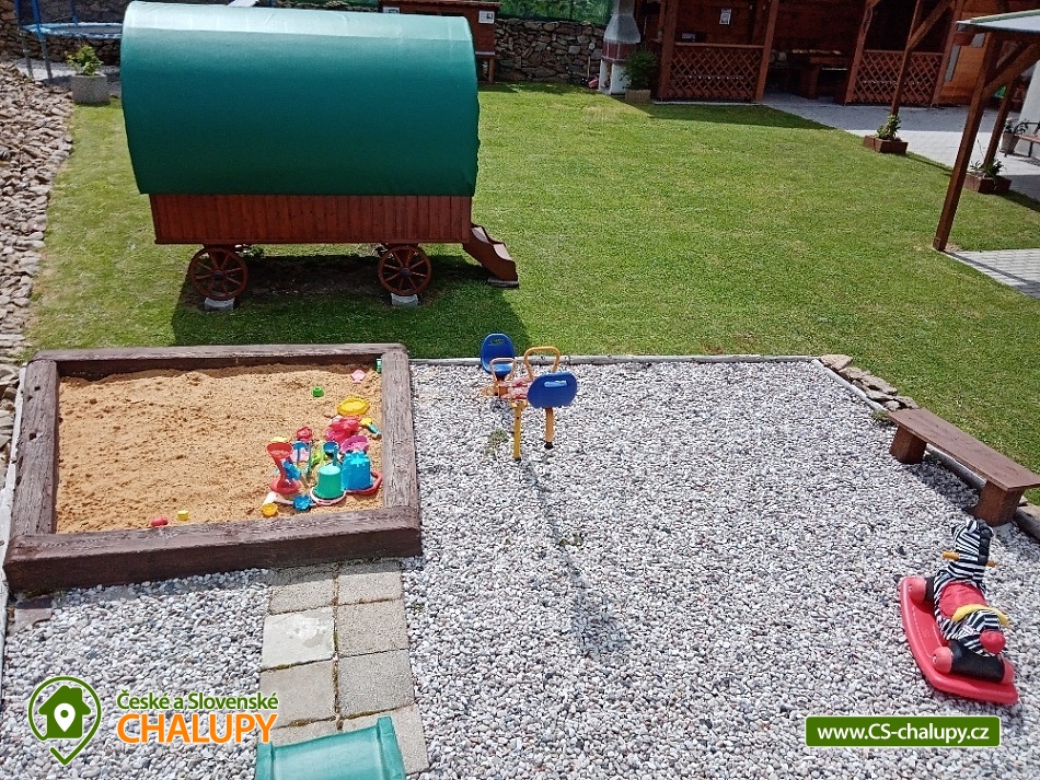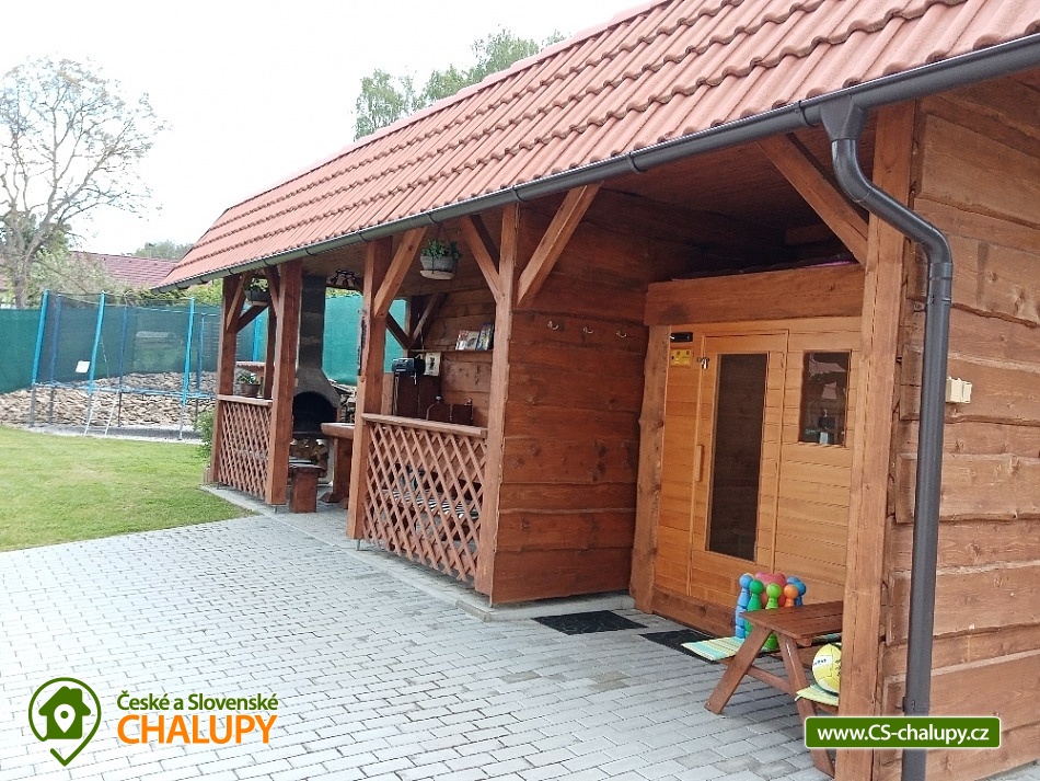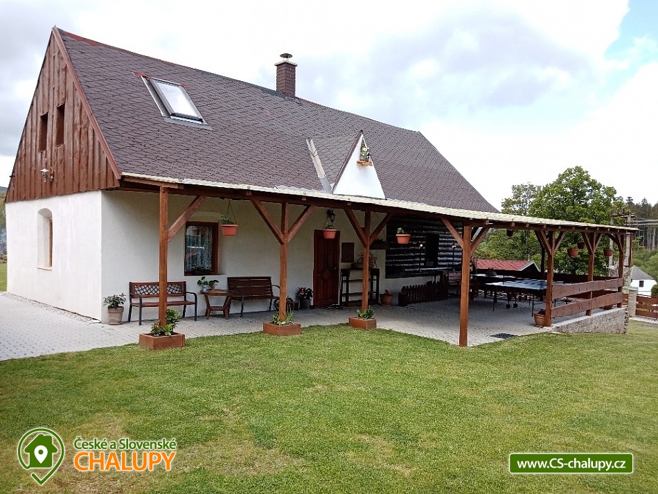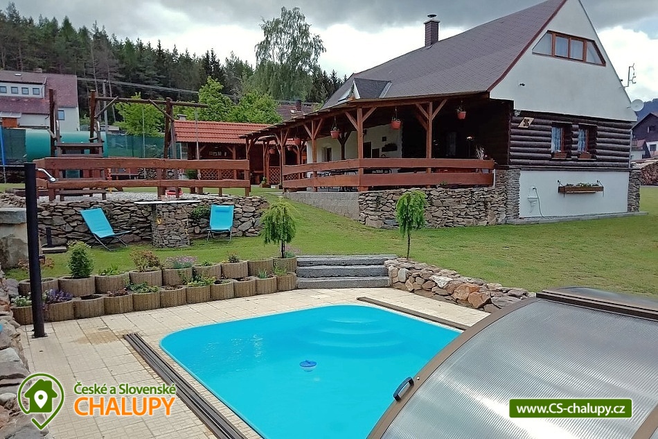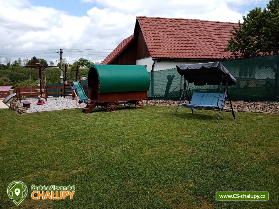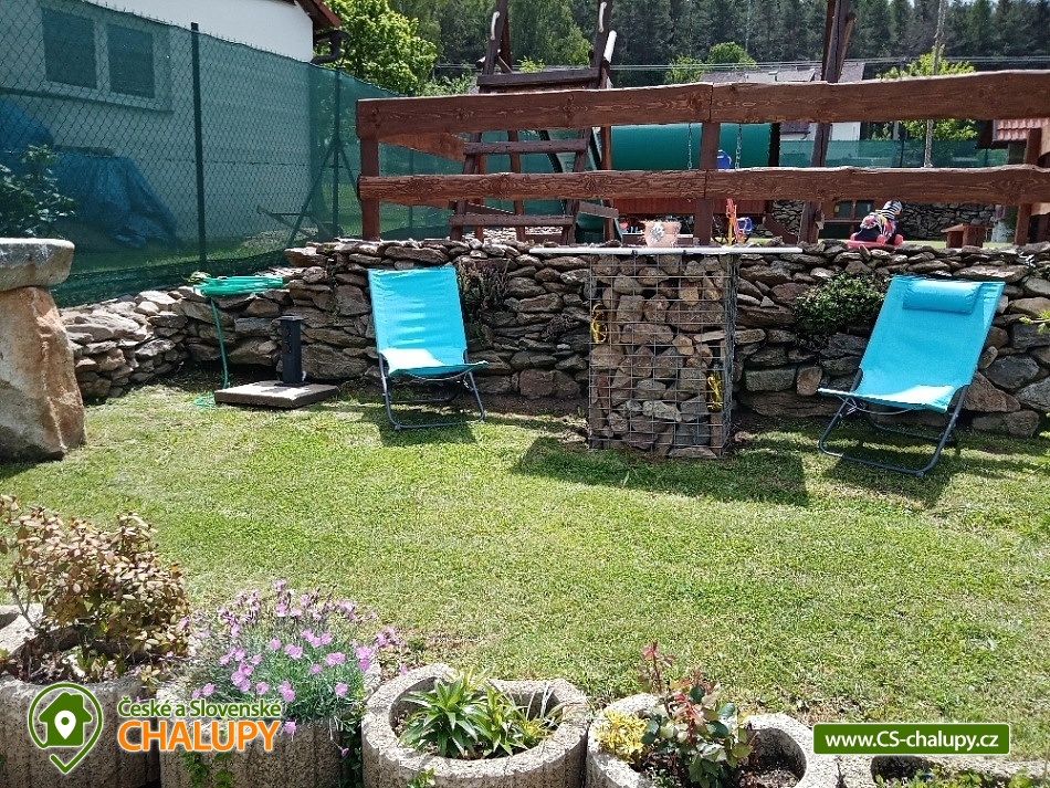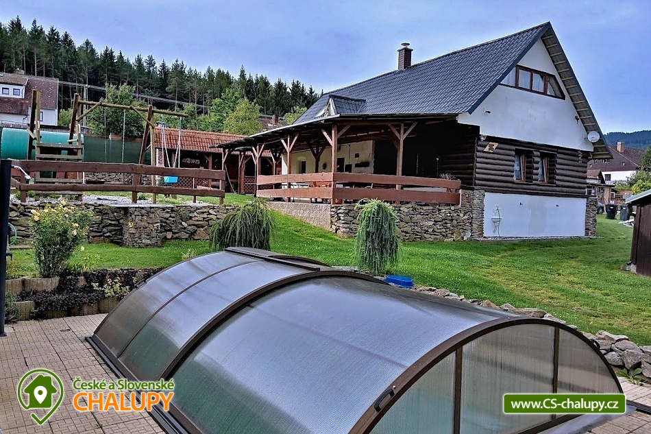 Cottage Lazny - Strasin - accommodation Sumava - swimming pool and sauna. Very nicely furnished, newly renovated 4-room cottage (120 m2) is located in the small village Lazny Sumava and offers rental for max. 12-14 persons. Entrance to the hallway. From the corridor on the right is the living room (25 m2), which is equipped with 2 sofas and TV. From the hallway on the left is accessible kitchen (18 m2), which is available ceramic hob (4 cooking units), el. oven, fridge / freezer, dishwasher, percolator, toaster, toaster, el. kettle, dining area for 12 persons, high chair, TV and radio. The large bathroom, which also enters from the hallway, is equipped with a massage shower, sink, toilet and washing machine - boiler 180 l. The bathroom is equipped with equipment for children (changing table, baby bed, bath, potty). Steep stairs lead from the living room to the attic. There are 2 separate bedrooms and a separate toilet with sink. The layout of the beds in the bedrooms is as follows: 1 / (25 m2) with 2 double beds and 2 beds and 2 / (25 m2) with 2 double beds and 2 beds. In the attic beware of the sloping walls. Dogs are not allowed in the attic. The cottage has an Internet connection (WI-FI). Central el. heating. Non-smoking property. The cottage is situated in a large fenced garden (approx. 1000 m2), where guests can use the recessed swimming pool (4 x 3 x 1,2 m) with sliding roof and solar shower, trampoline (diameter 4,5 m), pergola with outdoor seating , fireplace, infrared sauna for 3 persons with shower (the shower is out of operation in winter), fireplace with benches and children's activities (swings, slide, sandpit, playhouse). Fenced parking. The garden of the cottage is guarded by a camera system with recording. Lazny village is situated in the picturesque Šumava countryside 18 km southeast of Sušice and 10 km northeast of Kasperske Hory. The surrounding area is ideal for hiking and cycling trips throughout the Šumava and Pošumaví. However, those who prefer historical monuments or passive relaxation will also be pleased. Swimming in a natural swimming pool in Nezdice in the Bohemian Forest (3 km), in a swimming pool in the village of Zihobce (5 km) and in aquaparks in Susice (18 km) or in Horazdovice (25 km). Tennis courts on site (0.1 km). Gym, squash, bowling and boat rental for descending the Otava River in Sušice (18 km). Fishing on the river Otava (15 km). Skiing in the surroundings: Nezdice na Sumave (3 km): 1 ski lift, length of ski slopes: 1,6 km, night skiing, cross-country trails. Kasperske Hory (10.5 km) 794 m above sea level: 3 lifts, length of slopes: 1.9 km, difficulty light to medium, night skiing, artificial snow, snowboarding, 40 km of maintained cross-country trails, ski school, ski rental, ski service. Zadov (15km) 890 - 1120 m: 2 lifts, 4 lifts, length of slopes: 4,5 km, difficulty light to medium, night skiing, artificial snow, snowboarding, 52 km maintained cross-country trails, ski school, ski rental, ski service .