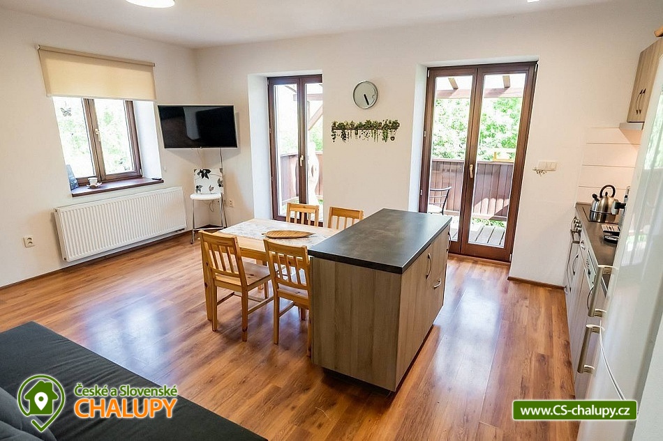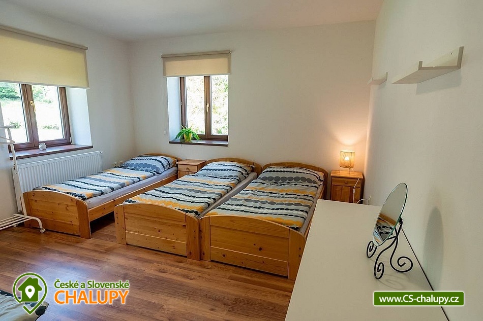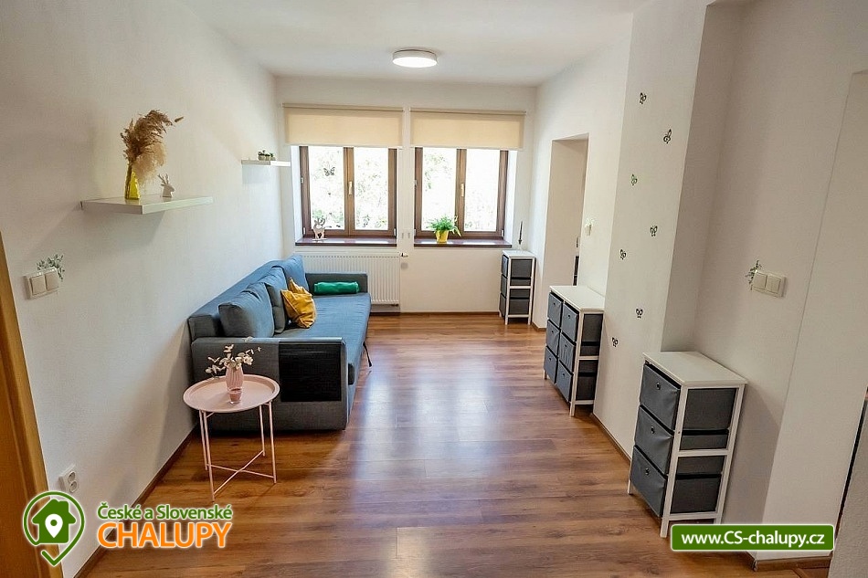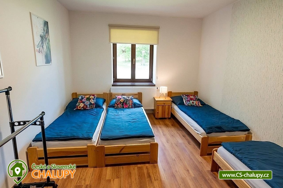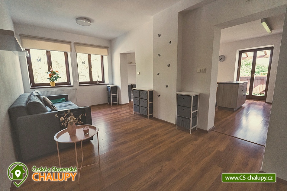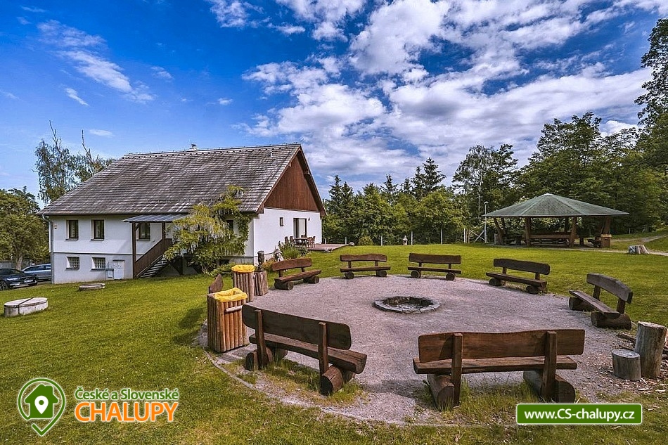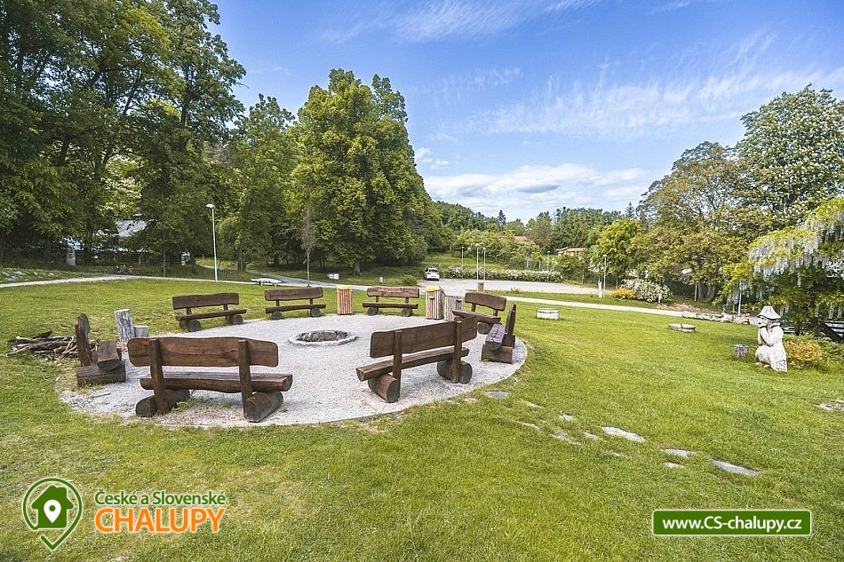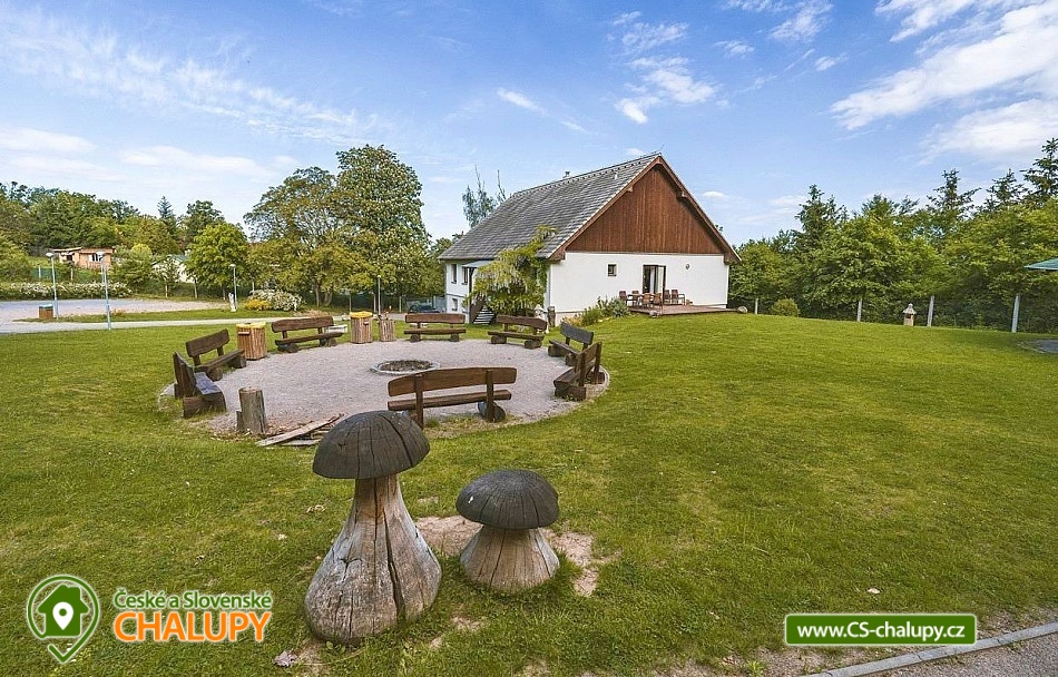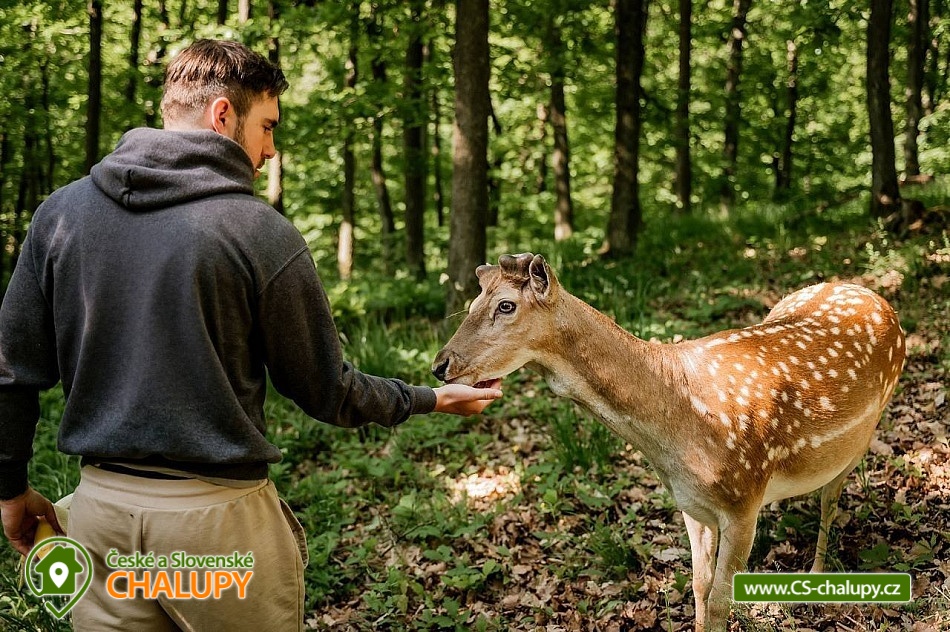 Cottage by the forest - located in the Baba Nature Park near the village of Řečkovice - South Moravia. The cottage can accommodate up to 13 people in 2 bedrooms. The cottage with an outdoor seating area is located in a quiet area, in a secluded area by the forest in the village of Jinačovice near the Brno Dam and the Brno Zoo. The cottage includes a spacious, three-room apartment, which has 1x four-bed bedroom (four single beds), 1x five-bed bedroom (five single beds), 2x extra beds in the hall (sofa bed) and 2x extra beds in the living room (sofa bed). A cot is available for rent. The living room has a sofa, TV, dining table and fully equipped kitchen (fridge, freezer, dishwasher, hob, oven, kettle and coffee maker). Upon agreement, two taps can be arranged. In the common room next to the apartment you can spend time with friends and play board games. The sanitary facilities include one bathroom with a bathtub and a washing machine and one separate toilet. Toiletries, towels and a hairdryer are available. Bed linen is provided. Heating is provided by a wood-burning stove and central heating. WIFI internet connection is available throughout the property. From the kitchen you can enter directly onto the balcony with a small seating area, from which you can enjoy views of the surrounding natural landscape and sometimes even the grazing fallow deer Jonáš. There is also a terrace, a large gazebo with seating, a grill and a fireplace with benches. Outdoor wooden games can be rented for an additional fee (Russian skittles, Mölkky, Spin Ladder, throwing rings and pétanque). Parking is possible directly in the closed area next to the property. Hiking, cycling, swimming and mushroom picking are possible in the area around the cottage. There are tennis courts nearby and there is also a pedal boat and boat rental at the Brno Dam. A beautiful nature trail with interactive elements runs through the entire area of the cottage. Swimming options include: Sokolské swimming pool, Ledňáček pond, Wellness Kuřim, Aquapark Kohoutovice, Lužánky municipal swimming pool, Riviéra swimming pool, etc. Excursions in the surrounding area include Veveří Castle, Macocha abyss and Punkva Caves, Pernštejn Castle, Western town Boskovice, Villa Tugendhat, Špilberk Castle and the historical center of Brno. We look forward to seeing you there.