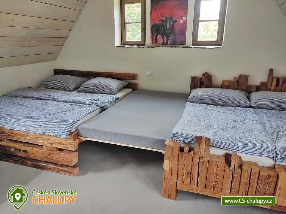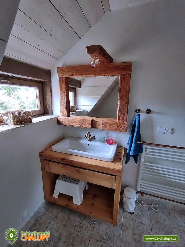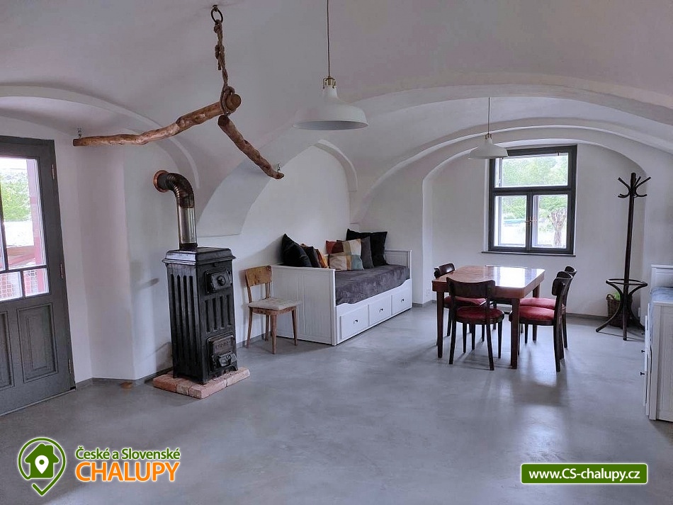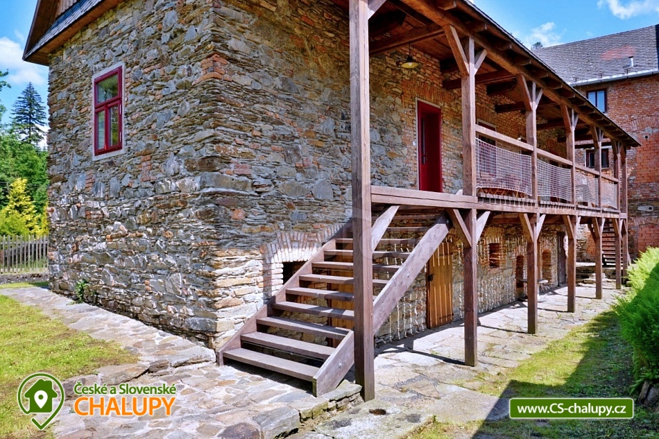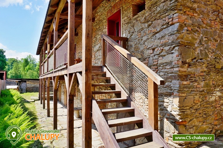 Cottage by the water mill - located near the highest peak of Devět skal in the Žďárské vrchy Protected Landscape Area. The cottage is part of the water mill complex, whose history dates back to the 15th century, and a small hydroelectric power plant is still operational there - there is a possibility of natural swimming right next to the cottage. The cottage can accommodate up to 13 people in 3 bedrooms. DESCRIPTION: Access to the property is via external stairs via a roofed porch (terrace) with an outdoor seating area, from which you enter the interior of the cottage. The entrance hallway has hangers and a sink. The spacious living room with vaulted ceilings is equipped with a dining and kitchenette, a fireplace insert and 2 sofa beds (both sofas offer full sleeping space for 2 people). There is direct access from the living room to the roofed porch (terrace). Another space on the ground floor is a bathroom with a shower and toilet. A high chair is available for small children, and a travel cot and a bath tub are available on request. From the entrance hall, stairs lead to the attic, where there are 3 separate bedrooms, a second bathroom (shower, sink) and a separate toilet. The layout of the beds in the bedrooms is as follows: 1. with a double bed, 2. with a double bed and 3. with 2 double beds and a sofa bed for 1 person, with the possibility of adding 1 additional sleeping place. The kitchenette has a ceramic hob (4 cooking units), electric oven, fridge with small freezer compartment, dishwasher, microwave, coffee maker, capsule coffee maker (Tchibo), toaster and electric kettle. WIFI is available in the living room. In the basement of the cottage under the porch (terrace) there is a cellar suitable for storing bicycles and skis. The cottage is located on an unfenced plot, where guests can use a fireplace and a portable grill. Sanitary facilities - The cottage has 2 toilets and 2 showers. Heating - The property is heated by electric underfloor heating and a fireplace insert in the living room. The property has a paved parking area for 3 cars and a grassy area for any additional cars. NOTE: The cottage is located near the Svratka River, from which a watercourse (up to 1.5m deep) leads to the cottage (to the mill). ATTENTION! The watercourse is free to enter, there is no railing, fence or playpen. Therefore, caution should be taken when moving children!!! The power plant staff may occasionally come to the mill area to clean and maintain the watercourse. SURROUNDINGS: Ruins of Štarkov Castle near Jimramova, Prosíčka Rock Lookout, Jimramov Ski Resort - skiing, Dalečín Ski Resort - skiing, Ruins of Dalečín Castle, Dráteničky Rock Formation, Drátenická Rock, Pasecká Rock, Devět Skal, Medlov, Sykovec and Milovský Ponds, Polička Swimming Pool and Karasín Lookout Tower. We look forward to seeing you here.