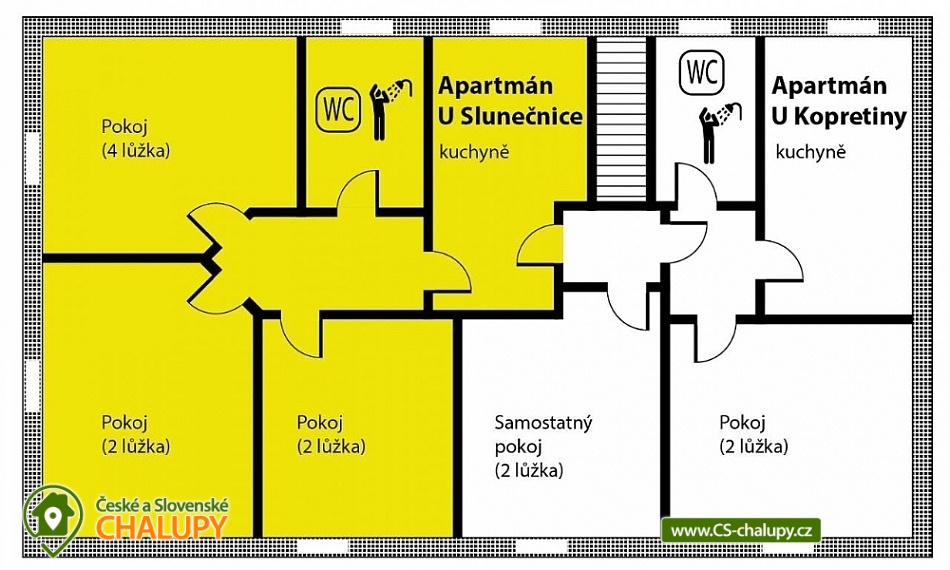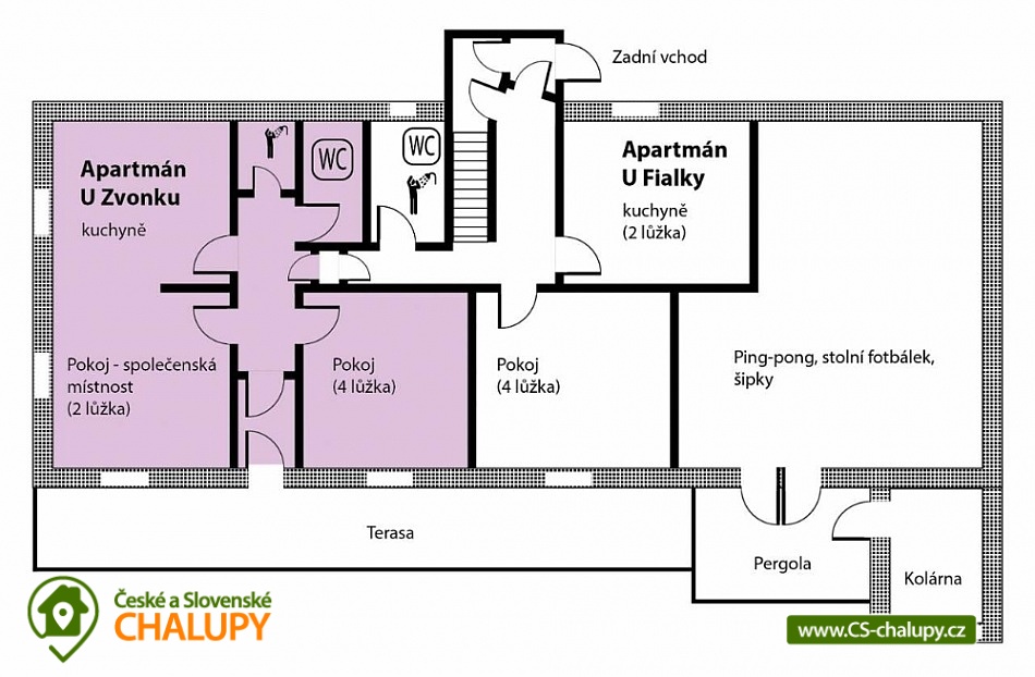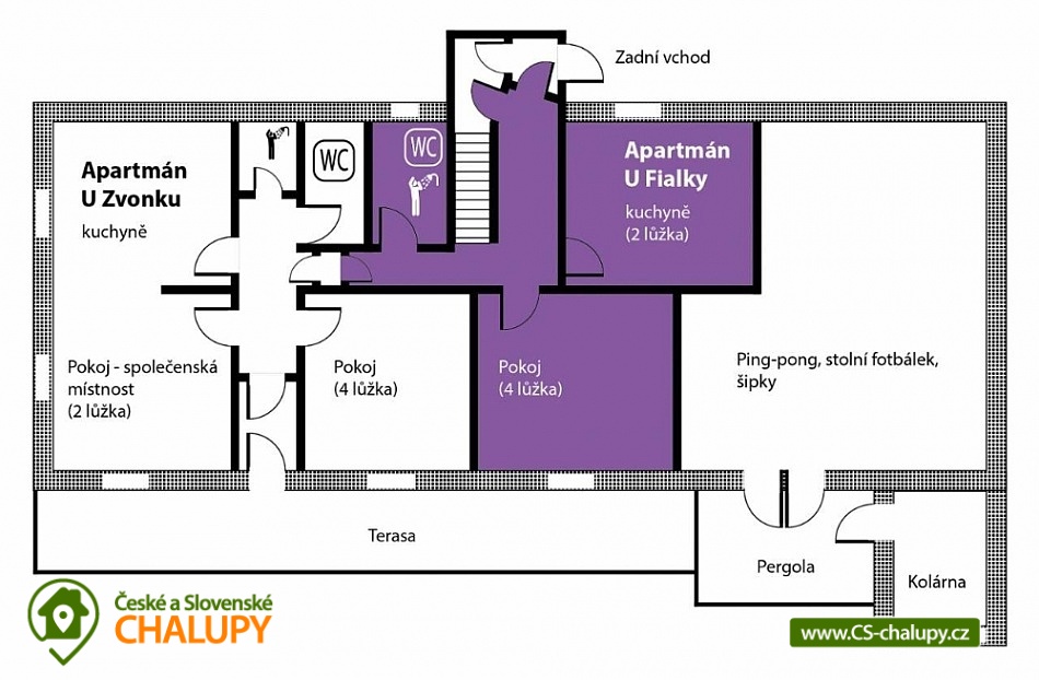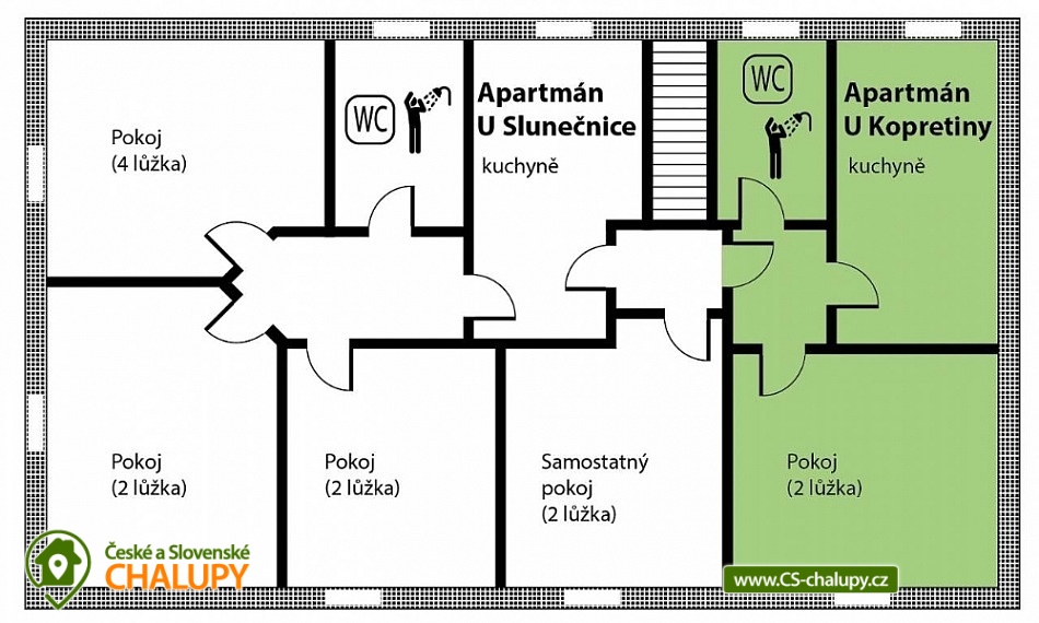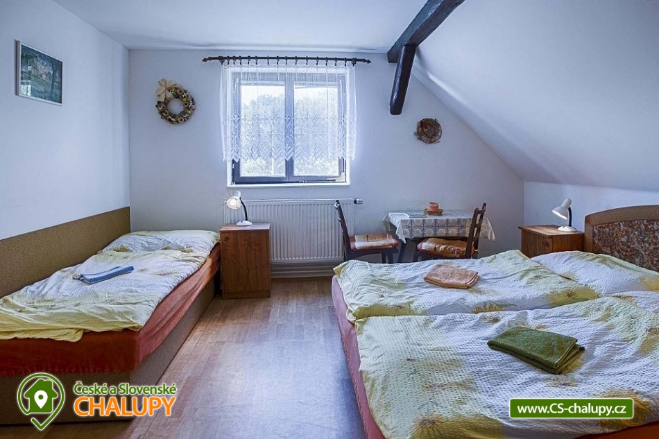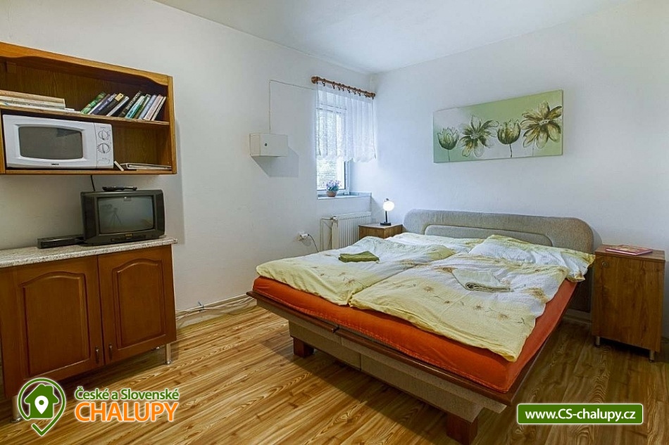 Chalupa U Potoka ve Věcově je přímo stvořená pro strávení klidné a příjemné dovolené. Žďárské vrchy, které ji obklopují, jsou vyhledávanou oblastí v létě i v zimě. Přijeďte si k nám odpočinout a naplno si užít své volné dny. Chalupa poskytuje ubytování pro až 23 osob ve 4 apartmánech. Každý apartmán má vlastní vybavenou kuchyni s lednicí, mikrovlnnou troubou, sporákem, varnou konvicí, hrnci i nádobím. Samozřejmostí je také sociální zařízení a vlastní vchod pro každý apartmán. Apartmán Zvonek: Bezbariérový apartmán v přízemí s vlastním vstupem pro 4 až 6 hostů. Tvoří ho samostatný pokoj se 4 lůžky, společenská místnost, kde se vyspí další 2 hosté, velká kuchyně a sociální zařízení. Kuchyni od společenské místnosti odděluje posuvná stěna. Apartmán Fialka: Apartmán v přízemí pro 4 až 6 osob tvoří prostorný pokoj se 4 lůžky a samostatná kuchyně s dalšími 2 lůžky. Příjemné zázemí doplňuje koupelna s vanou a toaleta. Apartmán Kopretina: Apartmán v podkroví pro 3 hosty. Kromě pokoje s lůžky v něm najdete také velkou kuchyni, sociální zařízení a předsíňku. Apartmán Slunečnice: Největší z našich apartmánů pro 8 hostů najdete v podkroví. Má tři samostatné pokoje, dva menší s 2 lůžky, jeden větší se 4 lůžky. Krajina Žďárských vrchů s krásnými lesy, skálami a rybníky je půvabná v každém ročním období. V létě jsou Žďárské vrchy ideální pro pěší turistiku a cykloturistiku. Nejčastějšími cíli pěších výletů našich hostů jsou zřícenina hradu Štarkov, Bohdalecká skála, Devět skal, Žákova hora, skála Prosička a další. V blízkém okolí chalupy je také vyhlášený houbařský ráj. Rájem cyklistů jsou zase singltreky v nedaleké Cyklo aréně Vysočina v Novém Městě na Moravě, kde se jezdí i závody Světového poháru na horských kolech. Milovníci jízdy v terénu tu najdou téměř 30 kilometrů stezek rozdělených do 5 stupňů obtížnosti. Těšíme se na Vás u nás.