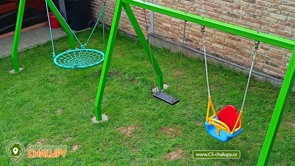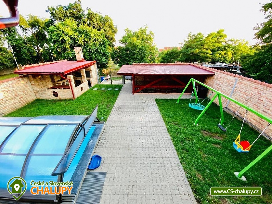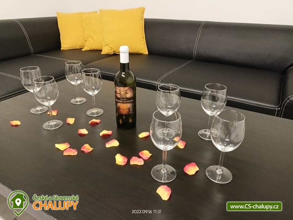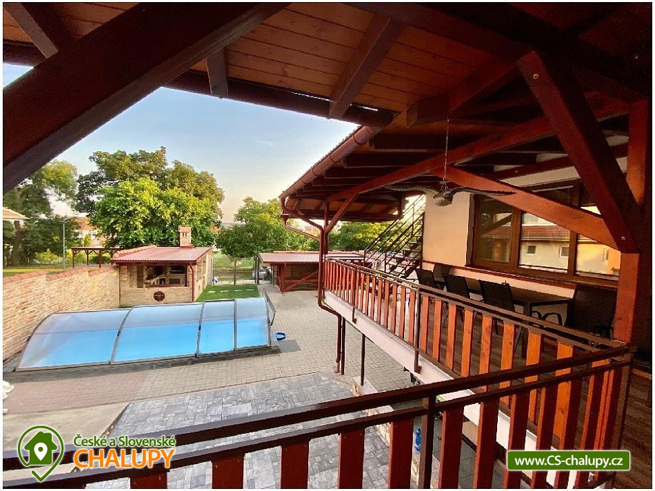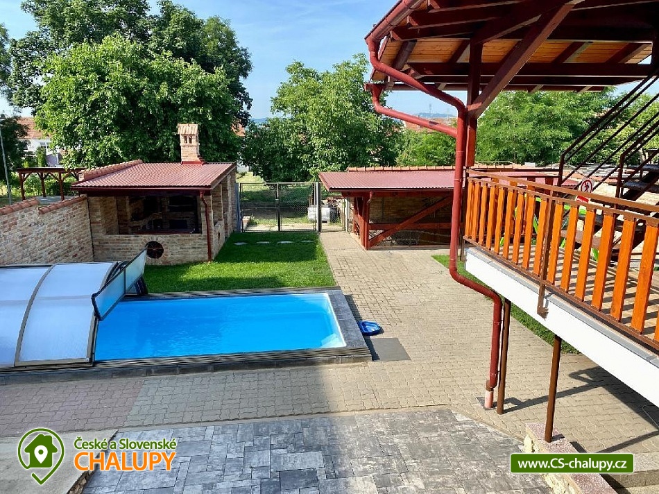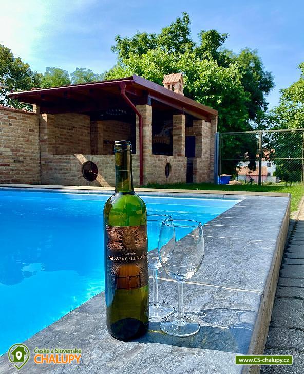 Chata s bazénem a vinným sklípkem u vodní nádrže Nové Mlýny, v samotném srdci Pálavy, obec Šakvice. K dispozici zastřešený zapuštěný bazén 6,20 m x 3,10m, hloubka 1,4 m. Objekt je samostatný, oplocený, uzavřený a má vlastní vinný degustační sklípek s nabídkou jihomoravských vín. Možnost si domluvit DEGUSTACI u nás ve sklípku. U vinného sklípku je zastřešené posezení se zděnou udírnou a grilem. Součástí ubytování je terasa, která má přístup i ze dvora. Pod terasou venkovní bazén a pro děti 3 houpačky. Chata je pronajímána jako celek - Objekt je jen pro Vaši partu zaručuje 100 % soukromí. Ubytování tvoří společenská místnost (kožená sedačka + malý stůl) s jídelnou, velký jídelní stůl pro 5 osob a vybavenou kuchyní (myčka, lednice s mrazákem, mikrovlnná trouba, rychlovarná konvice, indukční varná deska, horkovzdušná trouba) a 5 samostatných neprůchozích ložnic. 1.patro s terasou: Ložnice č.1: manželská postel a 2 palandy, ložnice č.2: manželská postel + samostatná postel, ložnice č.3: manželská postel, ložnice č.4: dvě samostatné postele. Na chodbě koupelna se sprchovým koutem a samostatné wc. Suterén-přízemí ložnice č.5: 3 samostatné postele. V suterénu jsou další 2 wc a koupelna. V celém objektu Wi-Fi. Vytápění zajišťuje plynový kotel. Objekt je vhodný pro větší rodinu, cyklisty nebo skupinu přátel či dokonce pro malé firmy, které u nás mohou se svým managementem přes den prezentovat své plány a cíle do budoucna a večer strávit v klidu a pohodě u vína. Pro cyklisty úschova kol. Lokalita je ideální pro cyklistiku, (cyklostezky přímo z domu), rybaření, pěší vycházky, vodní sporty, poznávací turistiku v Lednicko - valtickém areálu a v Mikulově, Aqualand Moravia a další. Znojmo – celodenní výlet cyklovýlet. Turisté ocení pěší výlety na Pálavu, Dívčí hrad a Sirotčí hrádek. Možnosti koupání: vodní nádrž Nové Mlýny, bazén Hustopeče, koupaliště Hustopeče, koupaliště Horní Bojanovice, rybník Šutrák, koupaliště Němčičky, Aqualand Moravia, lom Mariánský mlýn, koupaliště Mikulov - Riviéra, koupaliště Březí, Mlýnský rybník, rybník Velký Bílovec, koupaliště Žabčice, koupaliště Koupaliště města Židlochovice, bazén Blučina.