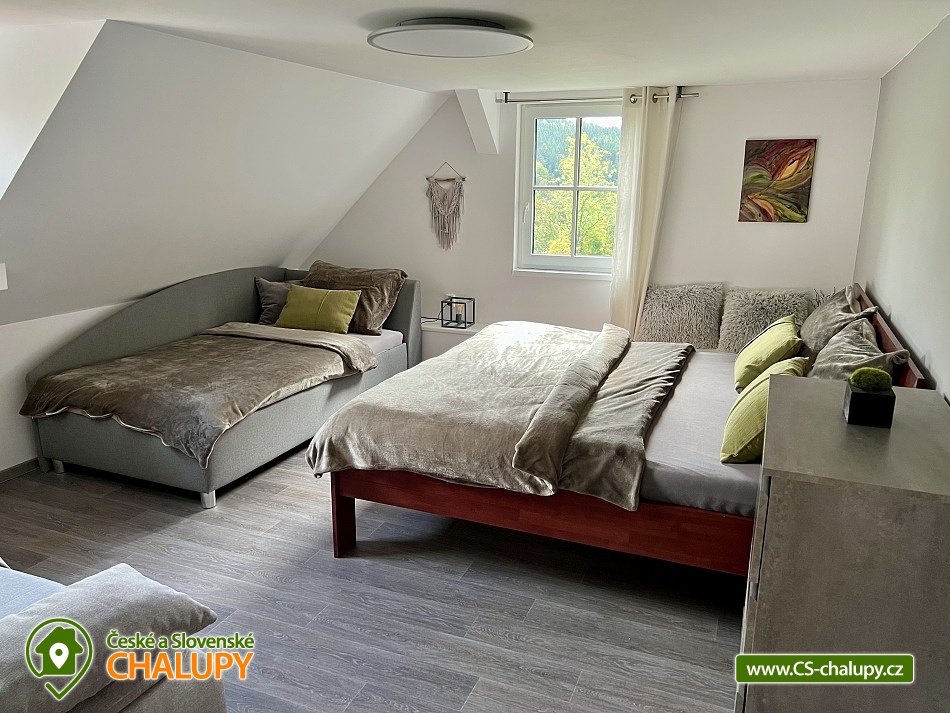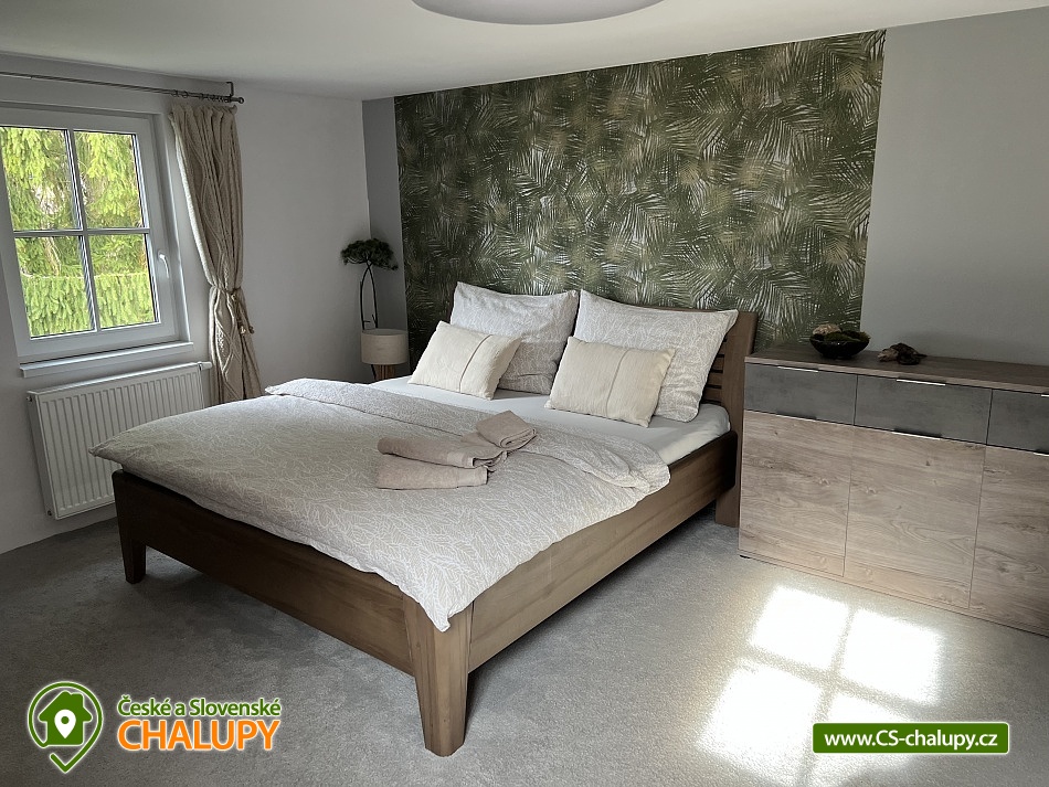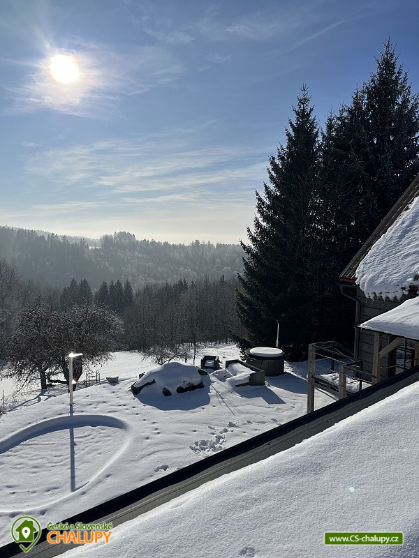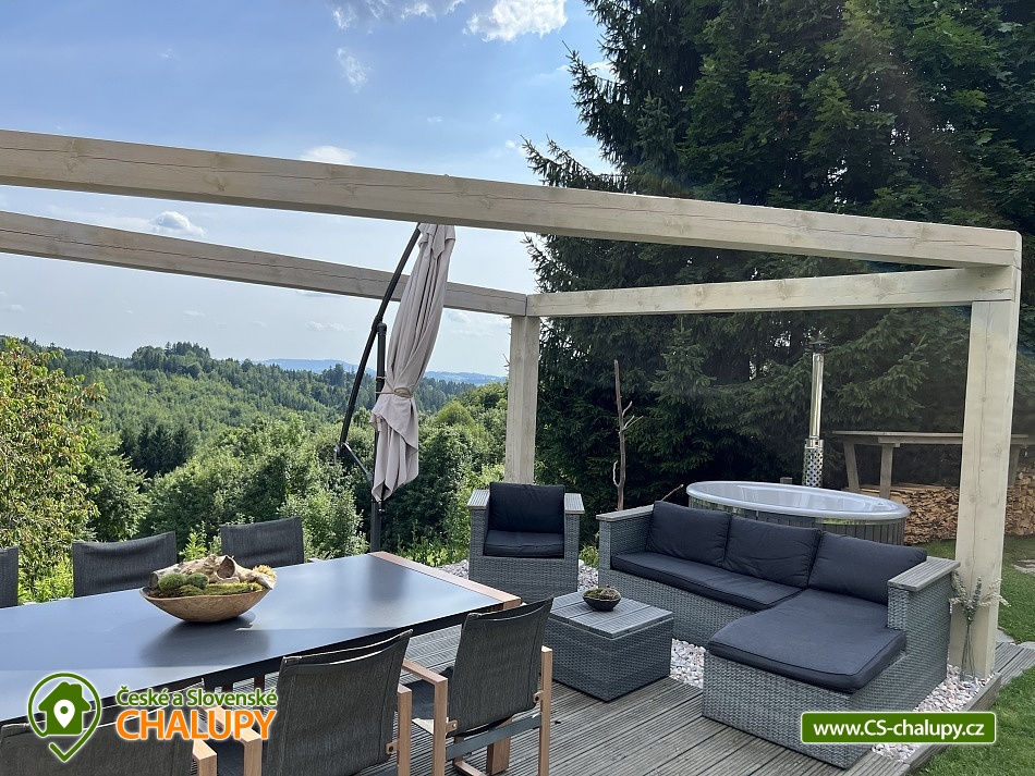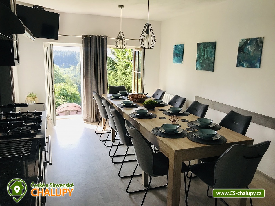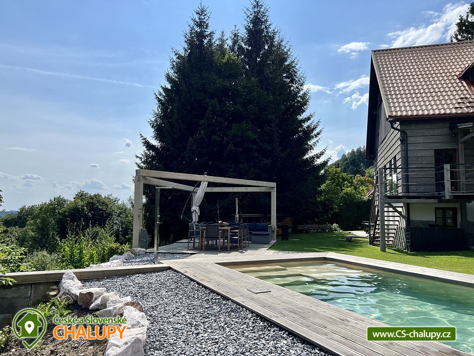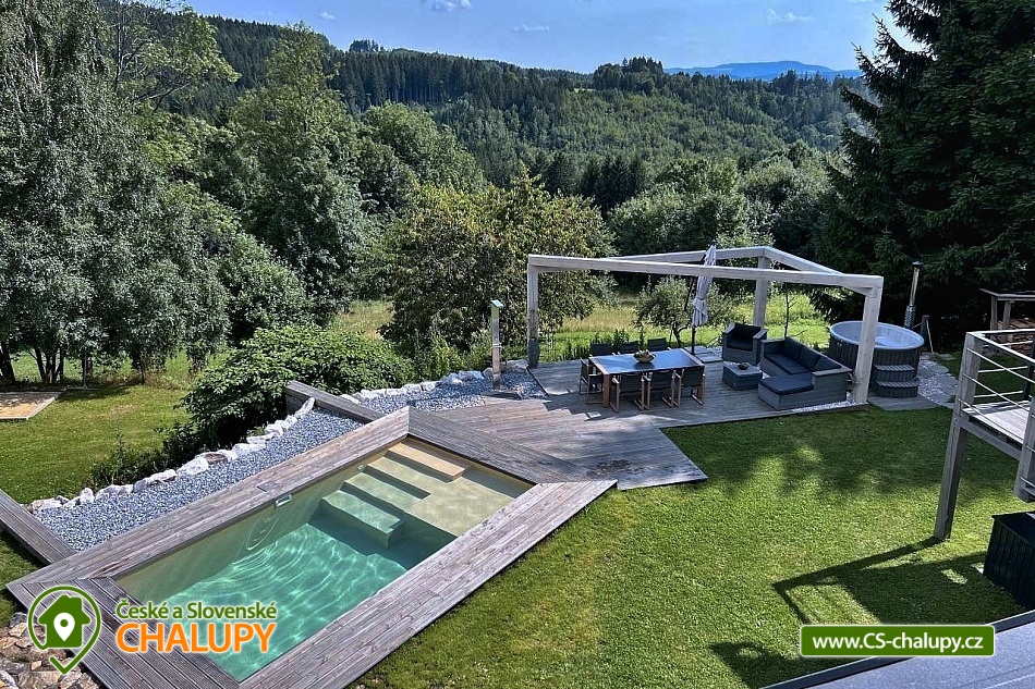 Wellness horská chata s bazénem se nachází na okraji malé obce Český Šumburk na pomezí Krkonoš a Jizerských hor - lokalita obcí Příchovice a Kořenov. Na terase u chaty je pro Vás připravený vyhřívaný bazén se slanou vodou a posezením, odkud je kouzelný výhled do horského údolí a nedalekých lesů. Možnost využití venkovního vířivého sudu a vnitřní infrasauny a vířivky. Chata nabízí ubytování pro až 24 osob v celkem 6 pokojích. Pokoje jsou v prvním patře, každé dva pokoje mají vždy společnou koupelnu a toaletu plus jeden samostatný záchod je na chodbě. Kuchyně je plně vybavená s plynovým sporákem, velkou troubou, mikrovlnkou, americkou lednicí, a druhá lednice s mrazákem na chodbě, varná konvice, espresso, toustovač. Posezení u stolu v kuchyni je pro 12 osob a dalších 8 je ve společenské místnosti s televizí a krbem.Větší společenská místnost je na vyžádání a vejde se do ní 20 osob a další židle se dají přidat z menší společenské místnosti ,třeba na teambuilding a větší oslavy. Chata je v zimě vytápěna tepelným čerpadlem. Ve spodní části zahrady vás okouzlí velké prostorné posezení s grilem a ohništěm. Pro děti jsou připraveny houpačky, globus kolotoč a velká obdélníková trampolína zapuštěná v zemi s rozlehlou zahradou a loukou. K dispozici je také velké hřiště na volejbal nebo fotbal, dále stolní tenis, badminton,kuželky,petanque.OKOLÍ: V Příchovicích je krásná naučná stezka Járy Cimrmana U čápa s restaurací a hřištěm, opodál minigolf 5 min autem. Poblíž ve vsi Zlatá Olešnice se nachází koupaliště s beachvolejbalovým hřištěm a hřištěm pro děti. V obci Kořenov je možné využít bowling 10 min autem. Lanové centrum Harrachov 13 min autem, Bobová dráha Harrachov, Vodopády Jedlové, Rozhledna Bramberk, Mumlavský vodopád a Rozhledna Štěpánka. V Tanvaldu je úžasná pekárna, cukrárna, pizzerie, kebab. V zimě je v dosahu 3km sjezdovka v Příchovicích U čápa, 3km Rejdice s vyžitím pro snowboardy, ski areál Rokytnice nad Jizerou, Harrachov a Tanvaldský Špičák vzdálený 20 km. Trasa pro běžkaře je u rozhledny Štěpánka (4 km). Těšíme se na Vás u nás.