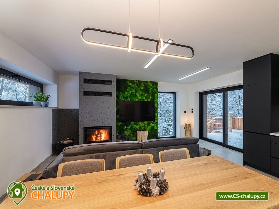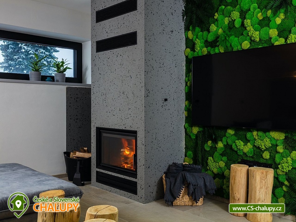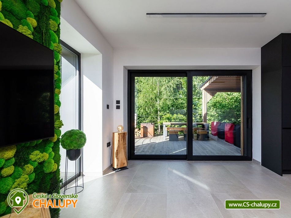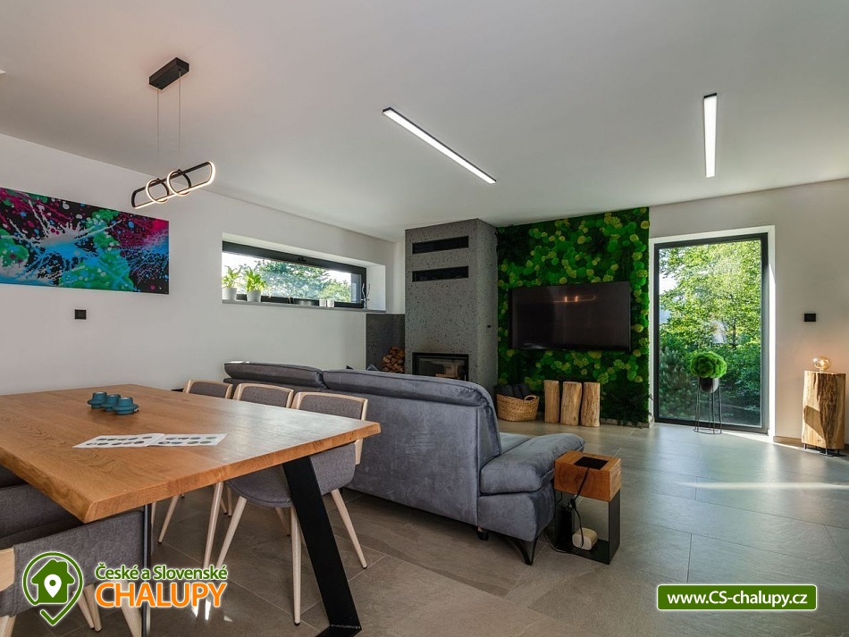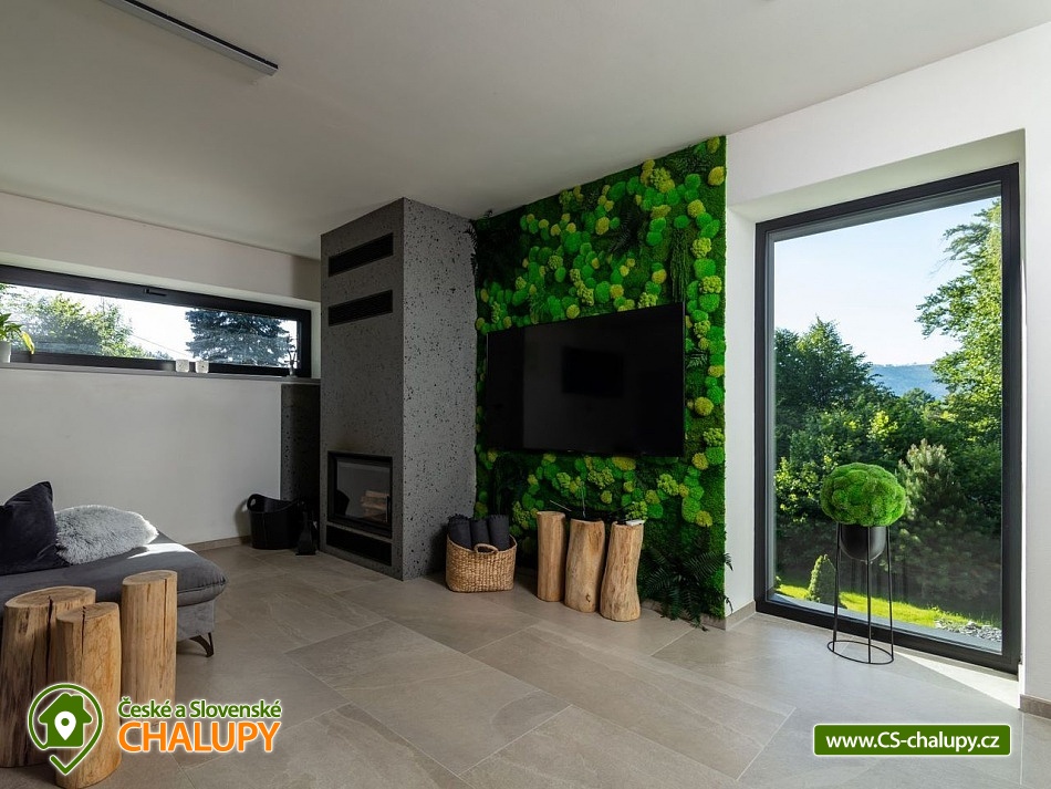 The cottage that exists - In the mountains - Čeladná is located in the beautiful Beskydy mountains, from where you can go on mountain trips, play golf, ride a bike or go skiing. You can look forward to a terrace with an outdoor cinema equipped with comfortable seats or to relax in the hot tub. The cottage offers accommodation for 6 people in two bedrooms with a beautiful view of nature. Both bedrooms are located on the first floor together with a toilet and a bathroom with a shower. In the first bedroom there are two double beds and a travel cot, which we are happy to prepare for you on request. Another bedroom offers a cozy place for two with a large double bed. On the ground floor you will find a kitchen with all the necessary dishes and utensils for cooking - convection oven, microwave, kettle, dishwasher, built-in refrigerator and DeLonghi coffee machine for bean coffee. The second bathroom with a shower, two sinks and a separate toilet can be found on the ground floor. Towels and bathrobes are always ready for you. A spacious living room with a fireplace and moss wall, which are the dominant feature of the entire space, is used for spending time together. The entire building has underfloor heating with the possibility of setting the temperature in each room separately. The Cottage also includes a washing machine and dryer, which are fully at your disposal. The terrace is fully connected to the living room and in the summer months you can connect it to the outside area. You can easily reach this cottage by car (chains are required in winter, however). We have provided parking for you in front of the cottage for 4 cars. Outside, you can spend your free time on the covered terrace with seating and a wood-fired garden grill, which you always have ready. The outdoor cinema, which you can watch from the comfort of the seats or directly from the hot tub, has high-quality sound and you can watch your favorite movie or listen to music here. There is a portable fire pit in the garden, where you can sit by the fire in the evening and roast dumplings. In the vicinity of the building there is a golf course, riding stables, cycle paths, hiking trails, where we recommend "Following the Bear's Paws" - here you will find marked trails and circuits under the highest peaks of the Beskydy Mountains. Swimming is possible here - the Olešná dam, the Ostravice - Sepetná swimming pool, the Frýdlant nad Ostravicí swimming pool, the Frenštát pod Radhoštěm water park. In winter, you will appreciate the possibility of skiing on the SKI Bílá or SkiPark Gruň slopes or the cross-country tracks on the Lysohorská cross-country highway. We look forward to seeing you here.
