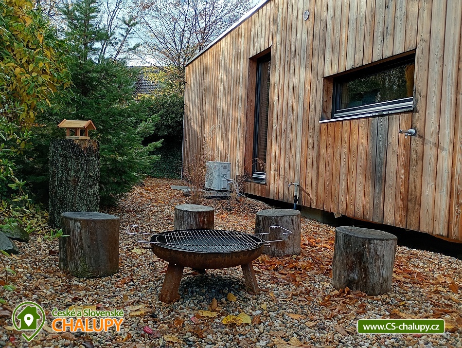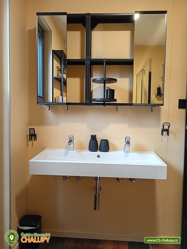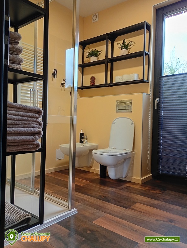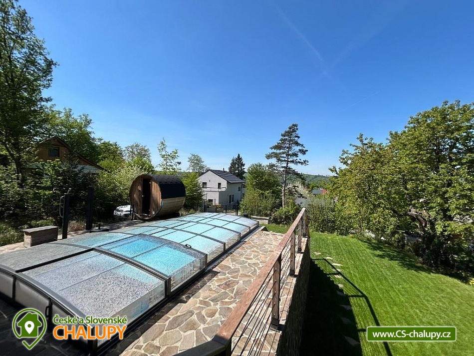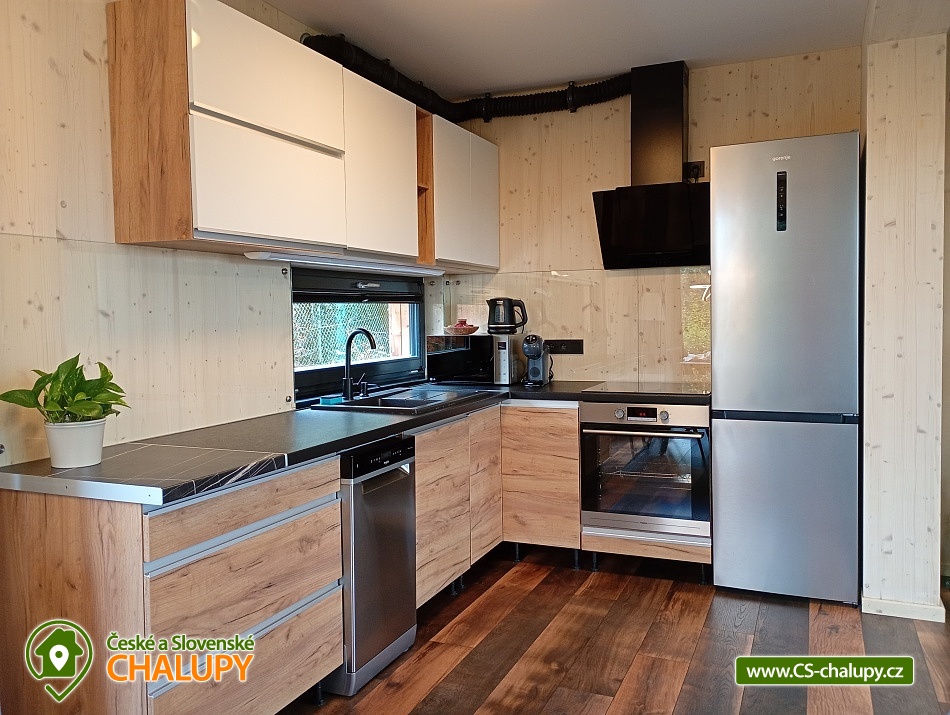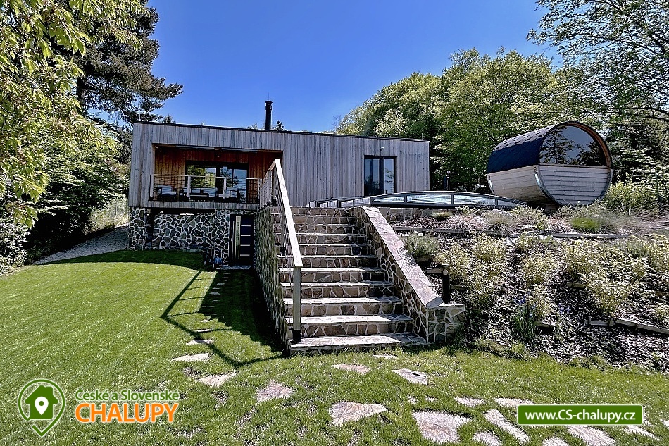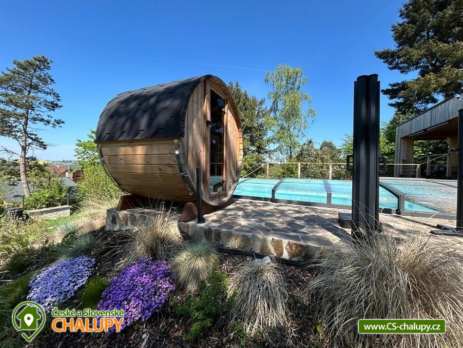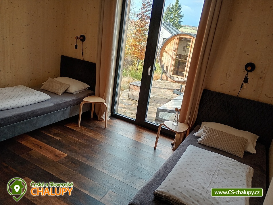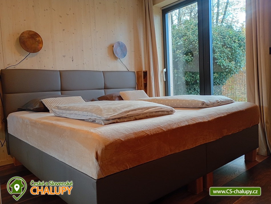 The comfortably furnished Chata Budka is located in the recreation area of Hradištko in picturesque countryside above the confluence of the Sázava and Vltava Rivers and not far from the Slapská Reservoir. This is a non-traditional housing built from 3 shipping containers. You can look forward to relaxing in the Finnish sauna with a panoramic window overlooking the countryside or swimming in the covered salt pool, which can also be used for hardening in winter. The cabin offers accommodation for 5 people, in total there are two double bedrooms and an extra bed with a sofa bed (120x190 cm) in the living room. The first bedroom has a double bed (200x200 cm) and the second has two single beds (90x200 cm). In most rooms there are panoramic windows with a view of nature and with access to the outside. Shared moments can be spent in the common room with access to the terrace, fireplace stove, sofa set, TV, dining table and fully equipped kitchen (dishwasher, refrigerator, electric oven, ceramic hob, freezer, coffee maker, microwave oven and kettle). The kitchen is also equipped with several capsules for the Dolce Gusto coffee machine, tea, sugar, salt and oil. Also dishwasher tablets, jar, sponge, cloth and washing powder. WIFI internet connection is available throughout the building, but there is no TV signal. For this reason, it is an advantage to have your own laptop with you, an HDMI cable for connection is available in the TV. A laptop can be borrowed by arrangement. The sanitary facilities include one full bathroom with a shower, double sink, toilet and bidet. Solid soap, liquid soap and shower gel are available in the bathroom. An outdoor solar shower is available in summer. Towels and bed linen are available for rent. Heating is provided by electric heating foils in the floor and a Schiedel fireplace stove with an output of 6.4 KWh. A limited amount of wood is available for free. The guests do the cleaning themselves, all cleaning equipment can be rented. A grassy garden stretches around the cottage. You can sit on the covered terrace by the pool and sauna. There is a grill and a fire pit. Wood for the grill is available in limited quantities. You can borrow sticks for frying burritos. There is a storage room for bikes and skis. You can park directly at the building. In the surroundings of the cottage, hiking, cycling, swimming, fishing, mushroom picking, cross-country skiing and skiing are possible. There are tennis courts and a golf course nearby. You can also rent boats or take a trip by steamboat in the nearby area. Swimming options include, for example: Slapská dam, Štěchovice reservoir, Žampach dam, Jílové u Prahy swimming pool, Vrané reservoir, Radotín biotope, Kunratický rybník Šeberák, Lhotka biotope, Barrandov aquapark, Praha - Aquapalace aquapark, etc. ski resort Chotouň. There are a number of educational trails nearby - Sekanka Educational Trail, Posázavská trail, Povltavská trail - Ztracenka and others, as well as Bikepark Hradištko, Lešany Castle, Mníšek pod Brdy Castle, Týnec nad Sázavou Castle or the center of Prague. We look forward to seeing you here.