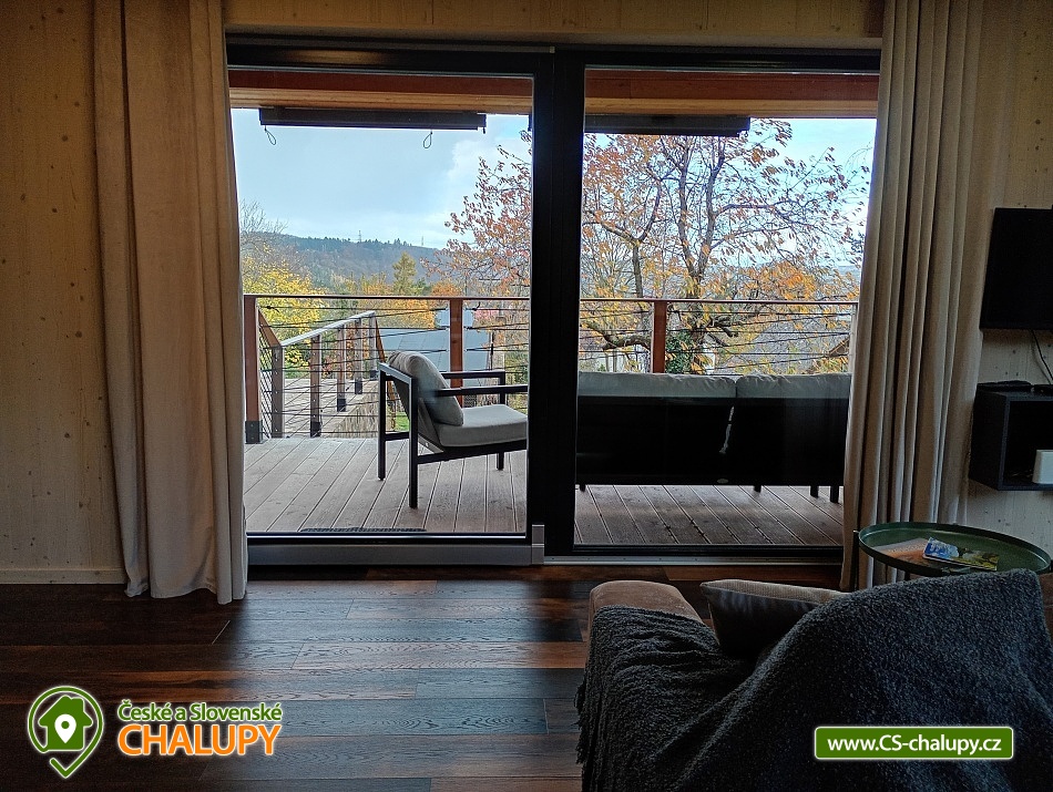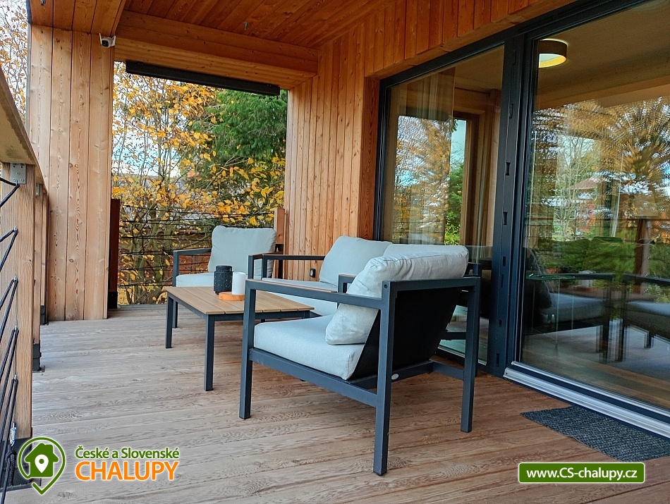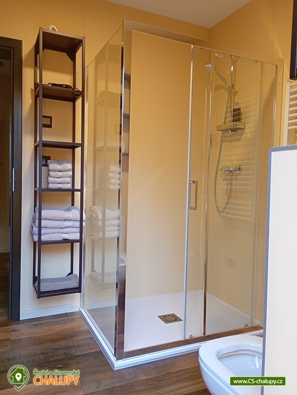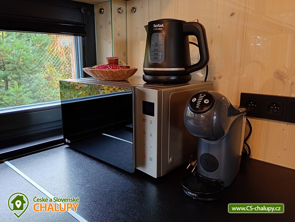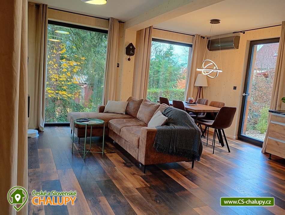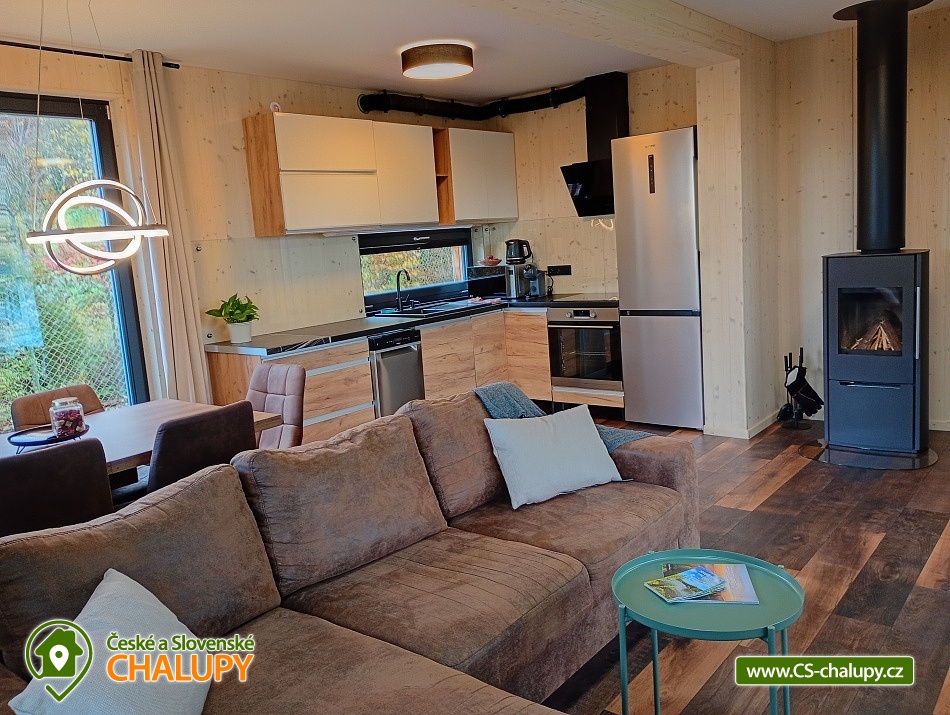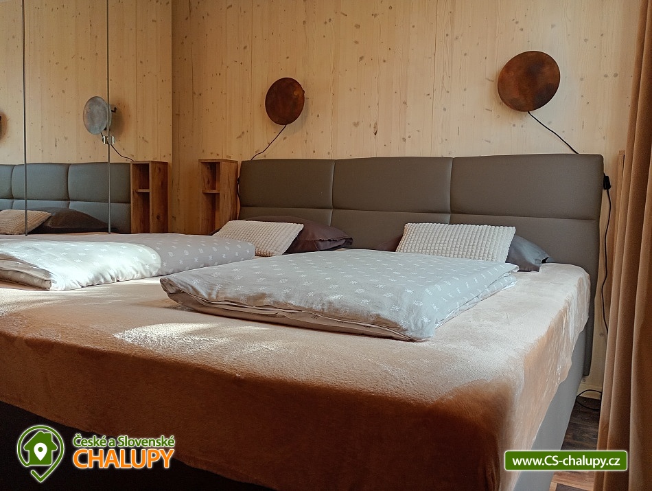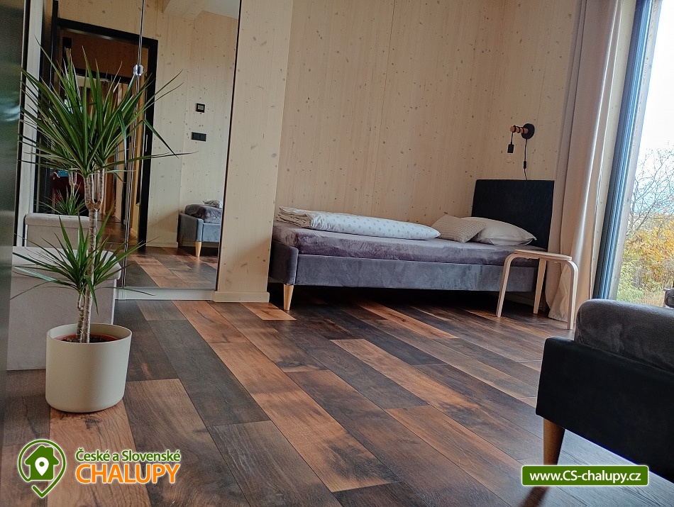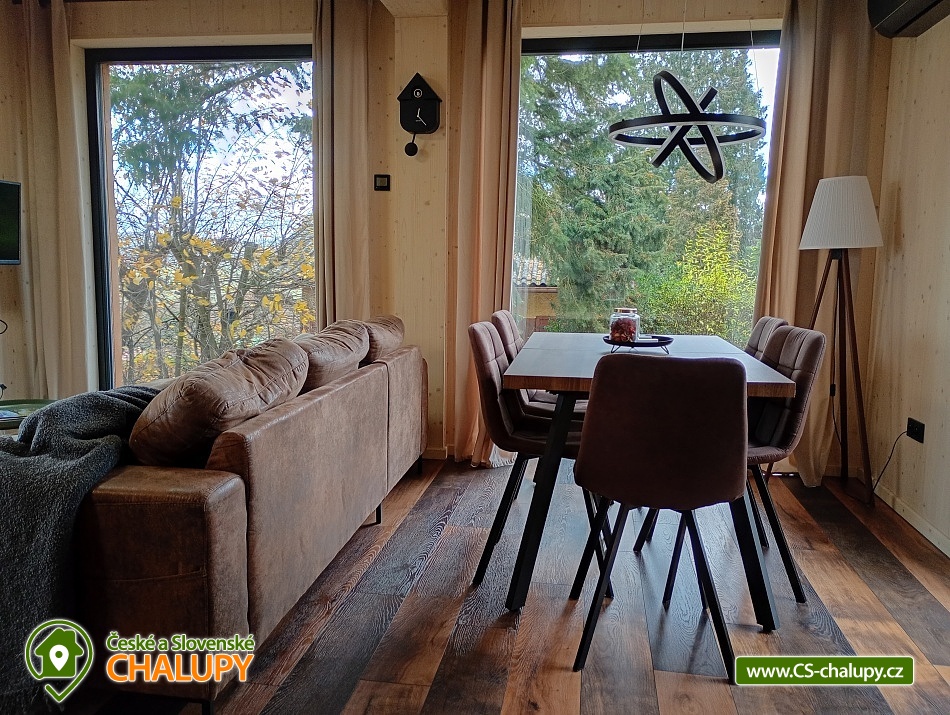 The comfortably furnished Chata Budka is located in the recreation area of Hradištko in picturesque countryside above the confluence of the Sázava and Vltava Rivers and not far from the Slapská Reservoir. This is a non-traditional housing built from 3 shipping containers. You can look forward to relaxing in the Finnish sauna with a panoramic window overlooking the countryside or swimming in the covered salt pool, which can also be used for hardening in winter. The cabin offers accommodation for 5 people, in total there are two double bedrooms and an extra bed with a sofa bed (120x190 cm) in the living room. The first bedroom has a double bed (200x200 cm) and the second has two single beds (90x200 cm). In most rooms there are panoramic windows with a view of nature and with access to the outside. Shared moments can be spent in the common room with access to the terrace, fireplace stove, sofa set, TV, dining table and fully equipped kitchen (dishwasher, refrigerator, electric oven, ceramic hob, freezer, coffee maker, microwave oven and kettle). The kitchen is also equipped with several capsules for the Dolce Gusto coffee machine, tea, sugar, salt and oil. Also dishwasher tablets, jar, sponge, cloth and washing powder. WIFI internet connection is available throughout the building, but there is no TV signal. For this reason, it is an advantage to have your own laptop with you, an HDMI cable for connection is available in the TV. A laptop can be borrowed by arrangement. The sanitary facilities include one full bathroom with a shower, double sink, toilet and bidet. Solid soap, liquid soap and shower gel are available in the bathroom. An outdoor solar shower is available in summer. Towels and bed linen are available for rent. Heating is provided by electric heating foils in the floor and a Schiedel fireplace stove with an output of 6.4 KWh. A limited amount of wood is available for free. The guests do the cleaning themselves, all cleaning equipment can be rented. A grassy garden stretches around the cottage. You can sit on the covered terrace by the pool and sauna. There is a grill and a fire pit. Wood for the grill is available in limited quantities. You can borrow sticks for frying burritos. There is a storage room for bikes and skis. You can park directly at the building. In the surroundings of the cottage, hiking, cycling, swimming, fishing, mushroom picking, cross-country skiing and skiing are possible. There are tennis courts and a golf course nearby. You can also rent boats or take a trip by steamboat in the nearby area. Swimming options include, for example: Slapská dam, Štěchovice reservoir, Žampach dam, Jílové u Prahy swimming pool, Vrané reservoir, Radotín biotope, Kunratický rybník Šeberák, Lhotka biotope, Barrandov aquapark, Praha - Aquapalace aquapark, etc. ski resort Chotouň. There are a number of educational trails nearby - Sekanka Educational Trail, Posázavská trail, Povltavská trail - Ztracenka and others, as well as Bikepark Hradištko, Lešany Castle, Mníšek pod Brdy Castle, Týnec nad Sázavou Castle or the center of Prague. We look forward to seeing you here.