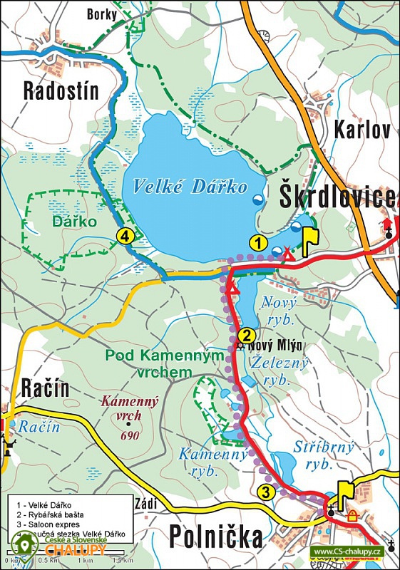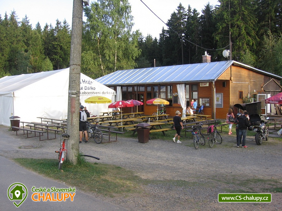 Chata Na hrázi - Velké Dářko - Žďárské vrchy. Chata se nachází v chatové osadě u Velkého Dářka (cca 300 m) v obci Polnička. Chata má kapacitu až 5 osob. V horní části je společná ložnice a v přízemí je vybavená kuchyňka (nádobí, hrnce, varná konvice, mikrovlnka , sklokeramický vařič) a jídelní kout. Společenská místnost s TV, dále je v chatě sociální zařízení (sprchový kout, umyvadlo a toaleta). Venku je posezeni s ohništěm. Pozemek je ohraničen živým plotem. Parkování je možné u chaty. Psi jsou povolení. Chata u rybníku Velké Dářko v krásném prostředí Žďárských vrchů, situovaná v chatové oblasti v blízkosti lesa a rybníka. Ideální místo pro odpočinek, turistiku, cykloturistiku, houbaření a rybaření. V útulné chatě jsou krbová kamna, která oceníte při večerním posezení. U chaty najdete posezení u ohniště. Jezero Velké Dářko je vzdáleno pouhých 300 m, můžete se zde vykoupat a provozovat různé vodní sporty. Další možnosti koupání a rybaření jsou na Pilské nádrži (8 km). Aquapark ve Žďáru nad Sázavou (10 km). Možnost vlastního vaření v plně vybavené kuchyni v chatě nebo stravování v restauraci přímo na pláži nebo v okolí (Škrdlovice, Polnička). Potraviny - dobře vybavený obchod ve Škrdlovicích (1,5 km). Nákupní centra - Žďár nad Sázavou (10 km). Rybník Velké Dářko - travnatá pláž, koupání, loďky, šlapadla, windsurfing, občerstvení na hrázi. Pěší turistika a cykloturistika zalesněnou krajinou CHKO Žďárské vrchy. Turistické cíle - Žákova hora, Devět skal, naučná stezka kolem Vel. Dářka. Žďár nad Sázavou - nové relaxační centrum vč. sauny, wellness, plaveckého bazénu a vodních atrakcí, zámek a muzeum - Kinských, Muzeum knihy, Zelená hora (kostel sv. J. Nepomuckého - památka UNESCO), Skanzen Veselý kopec, westernové městečko Šiklův mlýn, hrad Pernštejn, Jihlava - ZOO, aquapark Vodní ráj. Škrdlovice - areál Hroch - občerstvení, různé atrakce pro děti, tenisové kurty, minigolf, kuželky, country večery. Polnička - zábavný areál pro děti Vagon - vláček, čtyřkolky a další atrakce, občerstvení, Možnost rybaření - Pilská nádrž, nádrž Strž, Bránský rybník, řeka Sázava, Sykovec. Turistický resort Čertovina u Hlinska v Čechách který nabízí prohlídku pekla s čerty pro malé i velké zlobily se stylovou čertovskou restaurací.