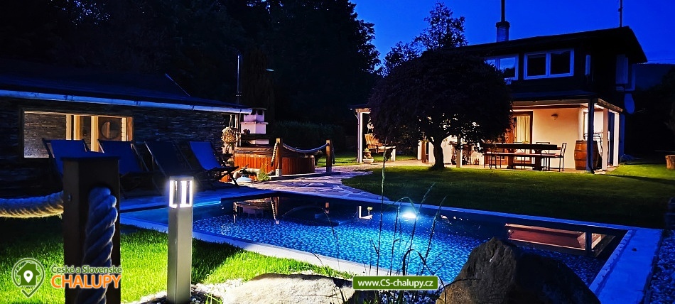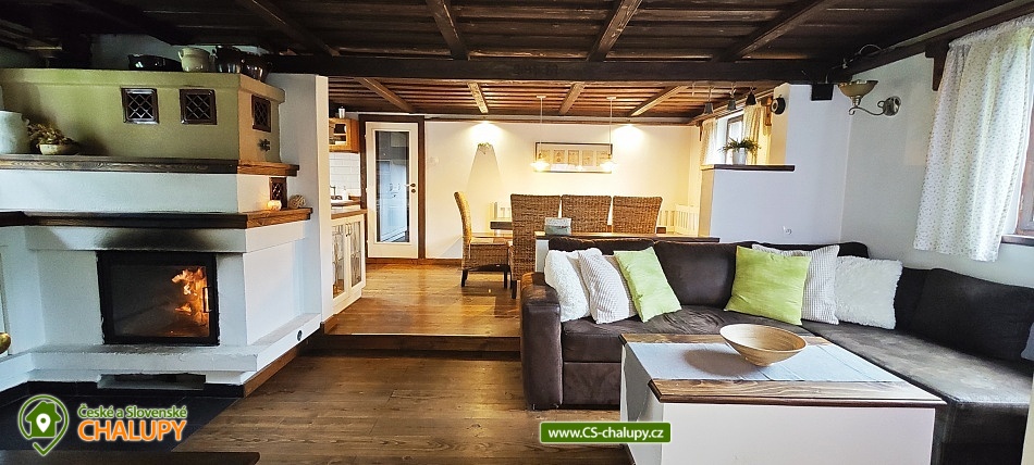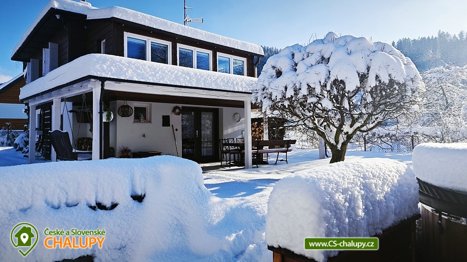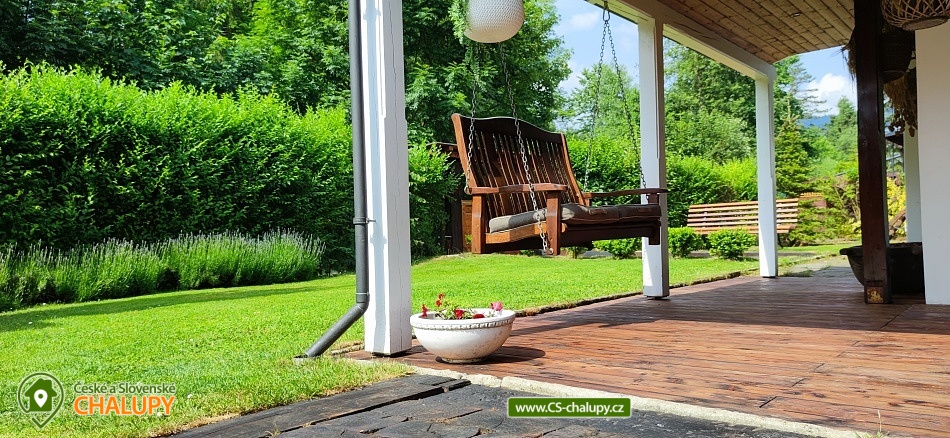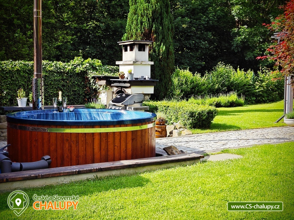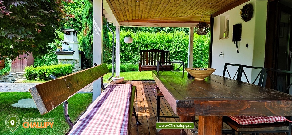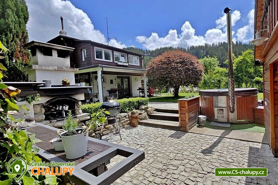 Cottage West Spazio - Prostřední Bečva. Rent cottage Bečva. Cottage West Spazio is situated in a pleasant environment of the village Prostřední Bečva in the district of Vsetín and is equipped with the highest emphasis on the quality of used materials. Cottage has 2 floors. In the open ground floor of the cottage there is equipped kitchen corner (electric ceramic hob and oven, microwave, kettle, coffee maker, fridge), fireplace, dining table, sofa, TV + SAT, DVD player and 1 bed, winter Garden and separate toilet. On the upper floor of the cottage there is 3x 2-bedded bedroom with double beds and bathroom: bathroom with shower and toilet. Wi-Fi internet is available. Heating of the building is provided by a wood fireplace with automatic regulation and heat distribution to the radiators. The cottage is fenced with a roofed terrace, garden furniture, outdoor fireplace, gas grill and children's corner. From the summer season 2017, there will additionally be a wellness in a garden house with a whirlpool for 3-4 people and a beer bar. The cottage is a great choice for people who want to unwind, but also for sports-oriented individuals who like hiking, cycling and skiing.