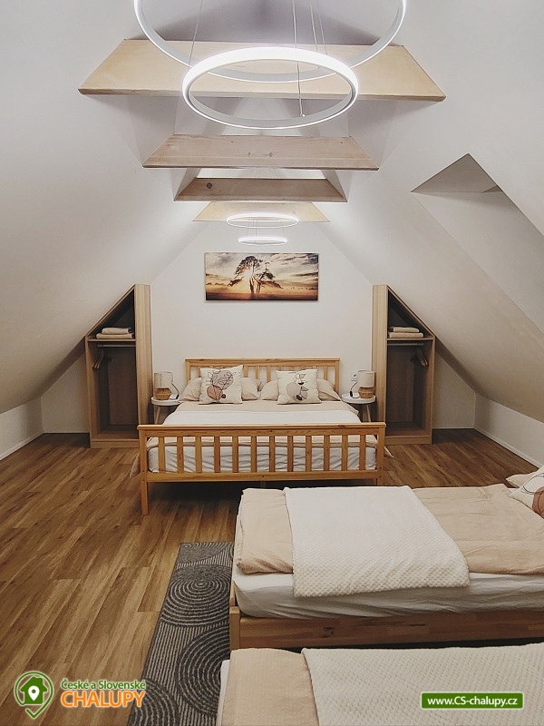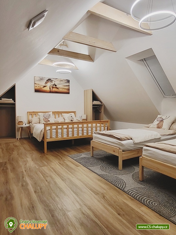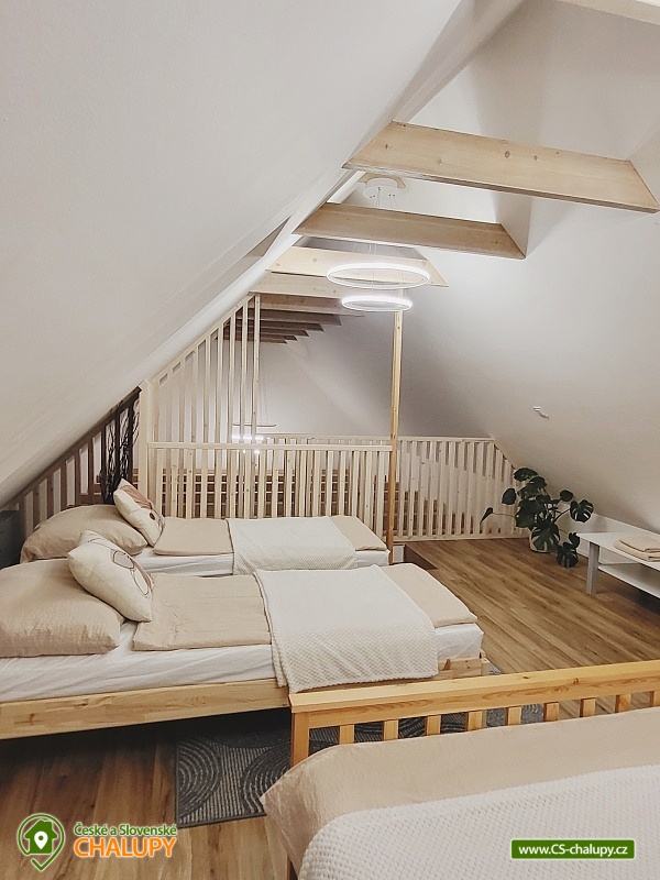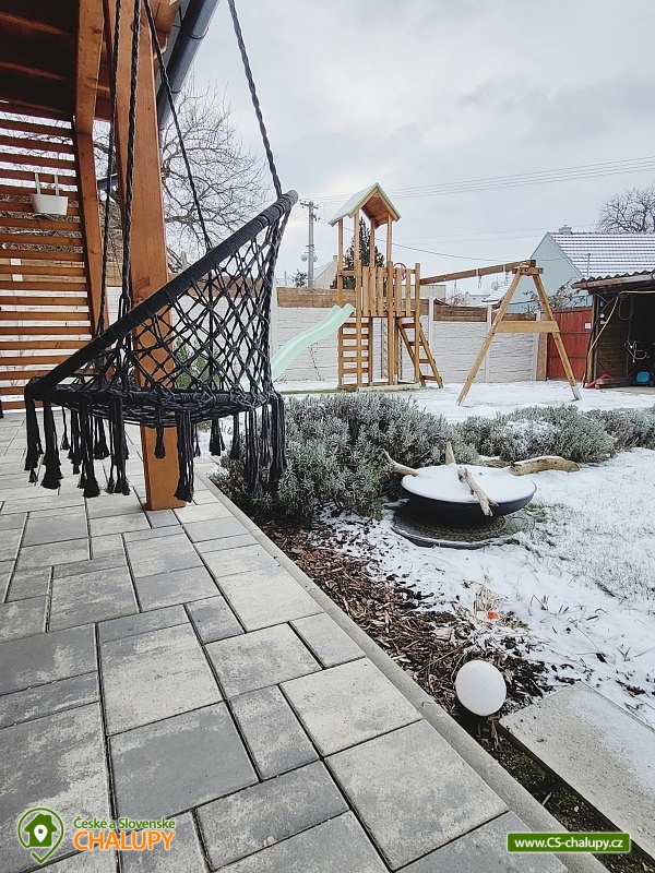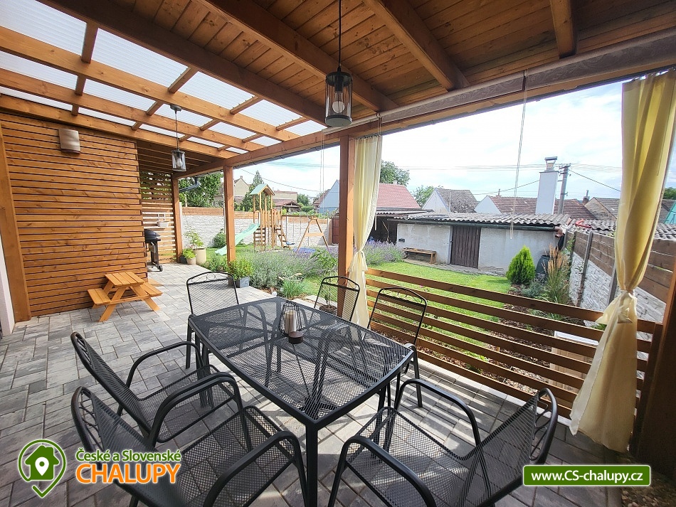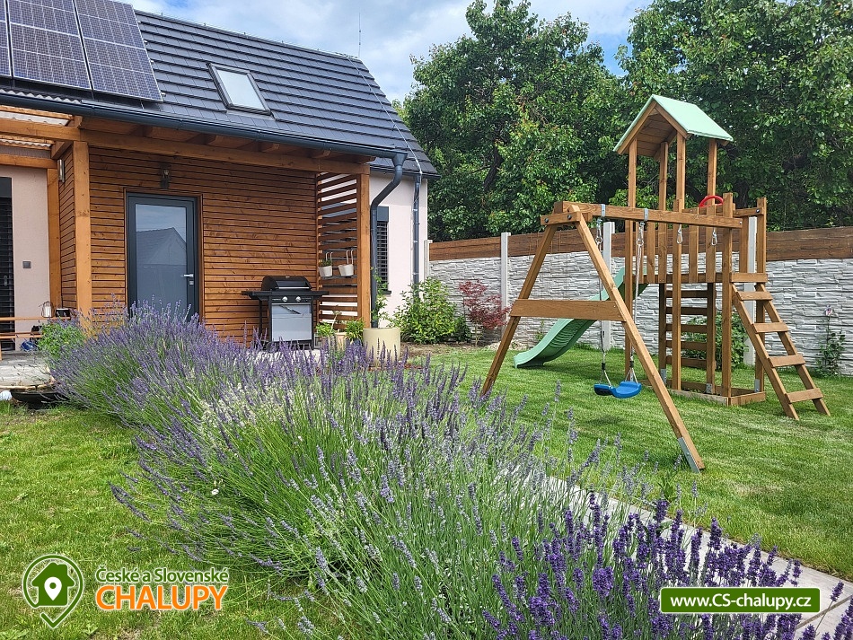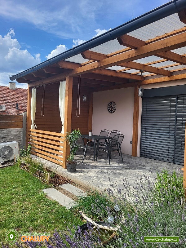 Cottage Hustopeče - Uheřice - Pasohlávky - Pálava is located in the beautiful surroundings of South Moravia in the village of Uherčice near the town of Hustopeče. It is a family house located in a private courtyard designated only for this one accommodation. Popular tourist destinations in the vicinity attract trips - Aqualand Moravia near Pasohlávek, the Nové Mlýny reservoir or the Lednice-Valtice area, a UNESCO World Heritage Site. Cottage offers accommodation for 6 people in two triple bedrooms (1x double bed + 1x extra bed in the form of a sofa bed). The first bedroom is located on the ground floor and has one double bed (140 cm), 1x extra bed (90 cm) and a wardrobe. You can enjoy a view of the garden from the bedroom. The second bedroom is located in the attic and has a double bed (160 cm) and an extra bed (160 cm). This bedroom is open through the space under the ridge to above the living room. Two cots are available for rent. Bedding and towels are provided. For social moments, there is a living room on the ground floor with a sofa, a 66" TV with home cinema, a dining table and a fully equipped kitchen (Siemens induction hob, Siemens electric hot air oven, fridge with freezer, Siemens dishwasher, blender, toaster, sandwich maker, rice cooker, automatic bean coffee maker, French press, electric kettle and standard kitchen equipment for dining and cooking). The living room does not have a closed ceiling and is open to the roof ridge. The sanitary facilities include one bathroom with toilet. The bathroom includes a walk-in shower with a large overhead shower head and hand shower. A children's chair, potty, toilet seat and bathtub are available for rent for children. The toilet is ecologically flushed from a large tank with rainwater. The boiler is heated by photovoltaics on sunny days. There is a 2-in-1 washing machine with dryer and a hairdryer. Heating is provided by air conditioning for heating and cooling and underfloor heating. The interior is shaded by external electrically controlled blinds and there is an internal roller blind on the roof window. WIFI internet connection is available throughout the property. From the living room you can enter an outdoor covered terrace with seating for adults and children and a gas grill with flat burners allowing independent grilling on only half or on the entire grill area divided into a grate and a tray. Children can look forward to toys inside and outside the cottage and a children's playground with two swings, a slide, climbing frames and a table sandbox. By prior arrangement, it is possible to arrange a tasting with an explanation in the wine cellar with authentic seating in the presshaus (press house). Parking is possible directly at the property. There is one parking space in the closed yard and another directly in front of the gate to the yard. Bicycles can be stored under a shelter. The exterior is guarded by a camera system, thanks to which cars and stored bicycles are under constant surveillance. Hiking is possible in the vicinity of the property, cycling, swimming, mushroom picking and fishing. Nearby is a riding school, tennis courts and wellness. Swimming options include: Pasohlávky Aqualand Moravia aquapark, Hustopeče swimming pool, Hustopeče swimming pool, Žabčice swimming pool, Nové Mlýny water reservoir, Židlochovice swimming pool, Horní Bojanovice swimming pool, Blučina swimming pool, etc. Other trips in the area include Hustopeče - Almond Trail and Almond Mill, Židlochovice - Acacia Tower Výhon Lookout Tower and Chateau Park with a game reserve, Bošovice - Parrot Zoo, Pavlov - Archeopark and Ruins of Děvičky Castle, Pálava Protected Landscape Area, Mikulov or Znojmo. We look forward to seeing you there.