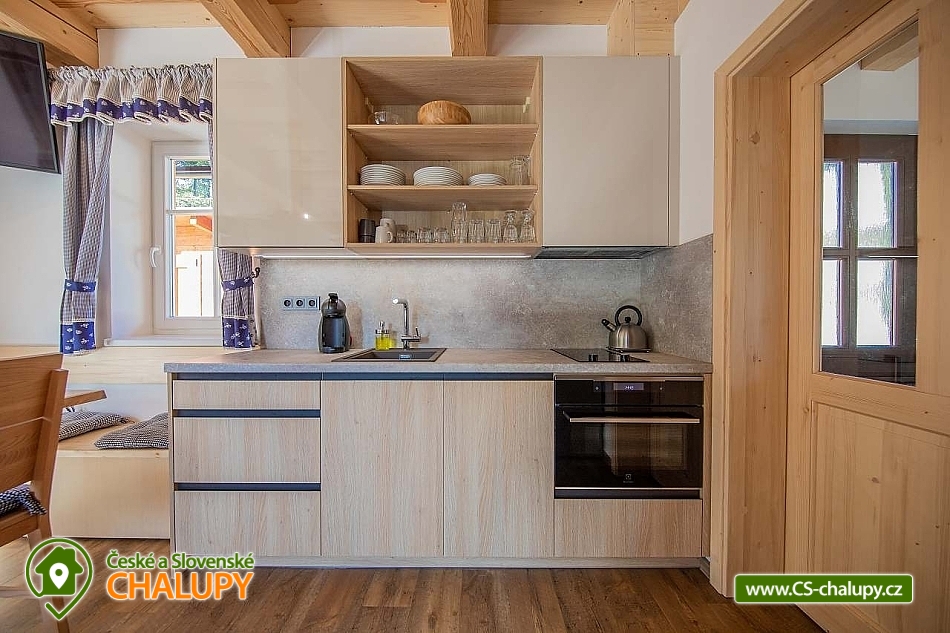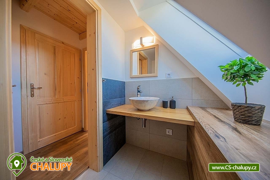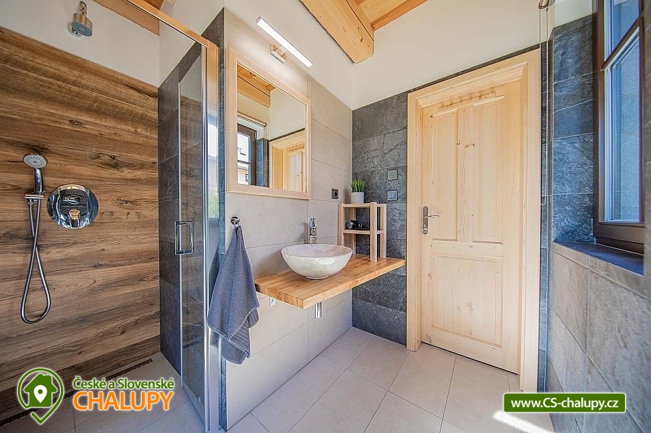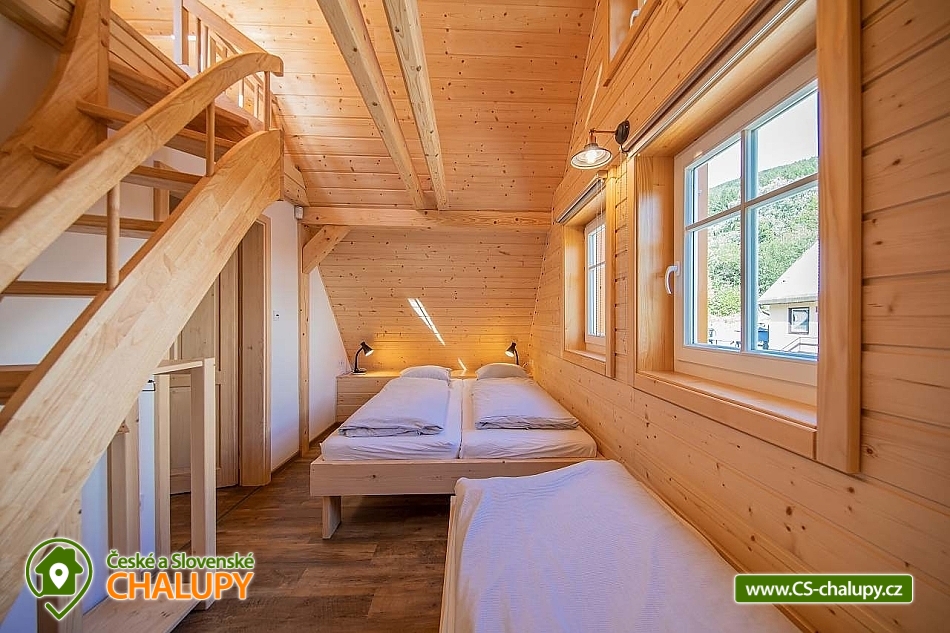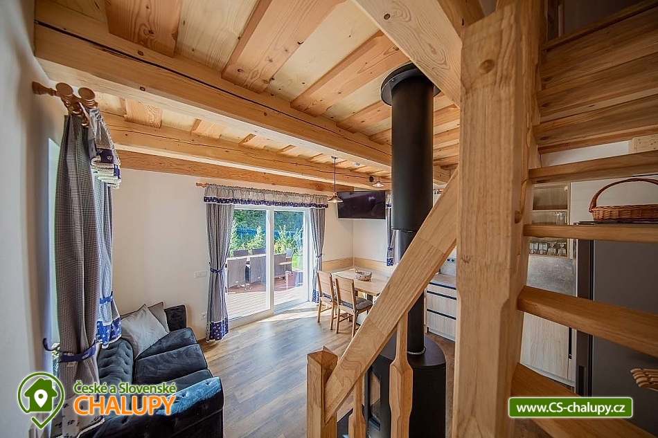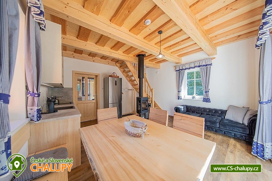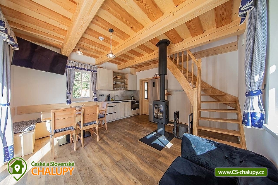 Chata s koupacím sudem - Kouty nad Desnou nabízí ubytování s výhledem na řeku, poloha 10km od lázeňského města Velké Losiny, kde se nachází nově vybudované termální koupaliště. Na zahradě koupací sud se vzduchovou masáží a LED osvětlením - topení dřevem. Chata v srdci Jeseníků na klidném místě 500 m od celoročně provozovaného areálu Kouty nad Desnou. Chata k pronajmutí poskytuje ubytování pro až 8 osob ve 3 ložnicích. V přízemí objektu se nachází obývací pokoj s TV a satelitním příjmem, dále plně vybavená kuchyně, krbová kamna, koupelna se sprchovým koutem a samostatné WC. V kuchyni je veškeré běžné vybavení (pečící a mikrovlnná trouba, velká lednice s mrazákem, myčka nádobí, indukční varná deska, kávovar na kapsle Dolce Gusto, dále běžně používané nádobí a kuchyňské vybavení). V patře chaty jsou dva oddělené pokoje a WC s umyvadlem. První pokoj pro 3 osoby (s manželskou postelí a jedna samostatná postel). Druhý pokoj pro 3 osoby (manželská postel a jedna samostatná postel), dále z tohoto pokoje vedou schody do mezonetu, kde se nachází další manželská postel (upozorňujeme na nízkou výšku stropu v mezonetu). Sociální zařízení: V chatě se nachází 2x samostatné WC a 1x koupelna. Vytápění: V celé chatě je nainstalované podlahové vytápění, popř. lze vytápět krbovými kamny. Venku na terase posezení pro 8 lidí, gril na dřevěné uhlí. Možnost uskladnění kol, lyží a dalších věcí v uzamykatelné šopě. Příjezd přímo k objektu po udržované cestě, u objektu je možnost zaparkovat cca 3 osobní auta. Přímo v obci je letní lyžování a speciální dráha na horských minikárách. Výlety: jeskyně Na Pomezí, ve Velkých Losinách zámek s žerotínskou obrazárnou a muzeum ruční výroby papíru, dřevěný kostelík v Maršíkově, sedačková lanovka v Koutech nad Desnou - je v provozu i v létě, v Přemyslově, v Ramzové, přečerpávací vodní nádrž Dlouhé Stráně, Veterán muzeum a ZOO park v Rapotíně. V zimě k dispozici v obci 3 SKI areály, nejbližší je 500 m od chalupy (noční lyžování, umělé zasněžování, nový SKI areál K3: šesti sedačková lanovka), 7 vleků na Červenohorském sedle, kde je rovněž sedačková lanovka. Z Koutů vede kyvadlová autobusová doprava. Dále 7 km Thermal park: velikost vodních ploch 1 495 m². Ve vnitřní části návštěvníci najdou tři bazény (jeden s průplavem ven), dětské brouzdaliště, tobogán a whirlpool. Těšíme se na Vás u nás.