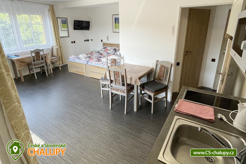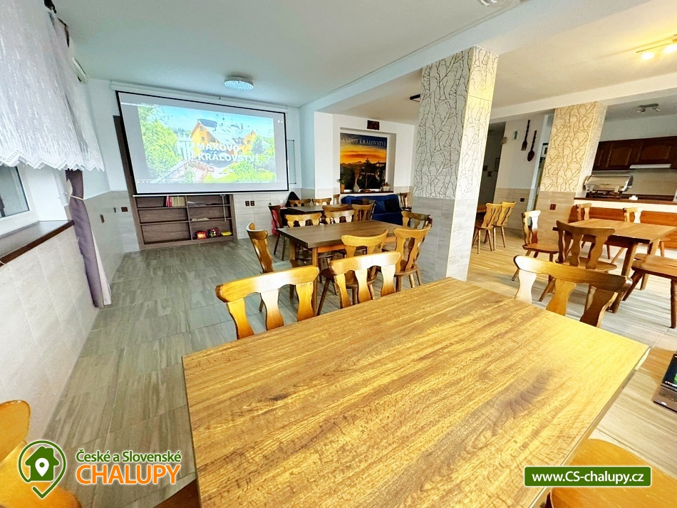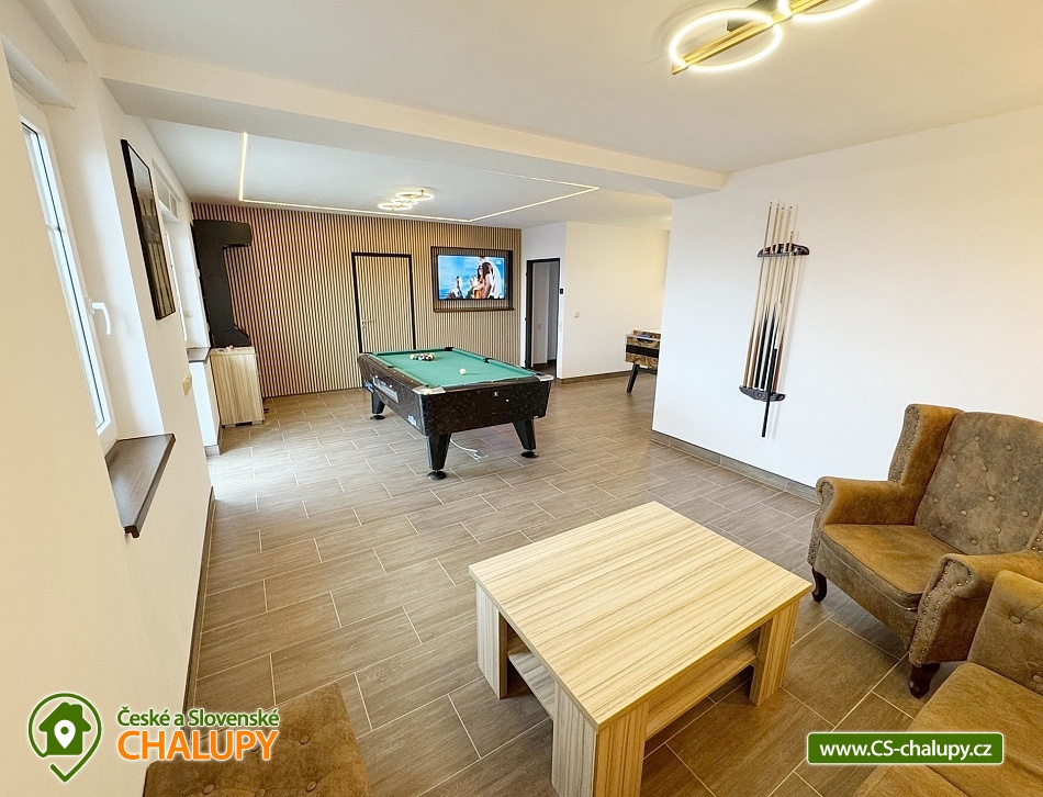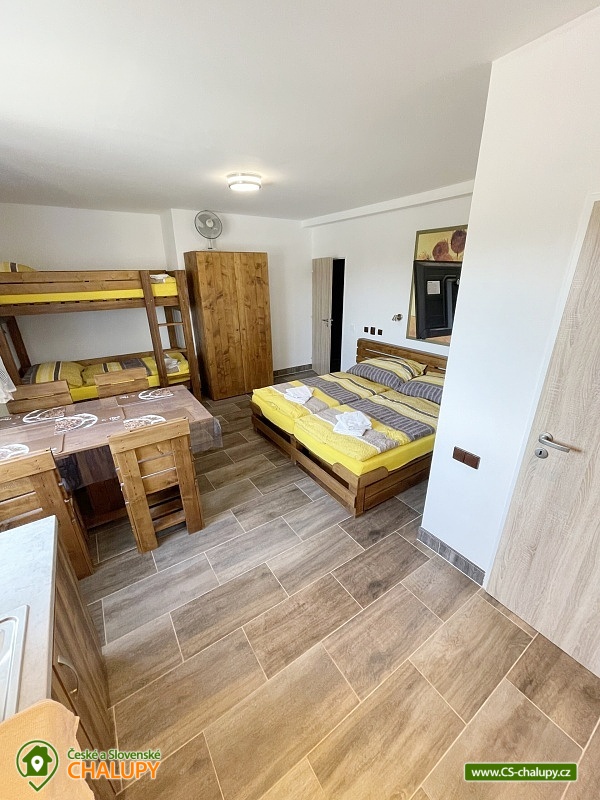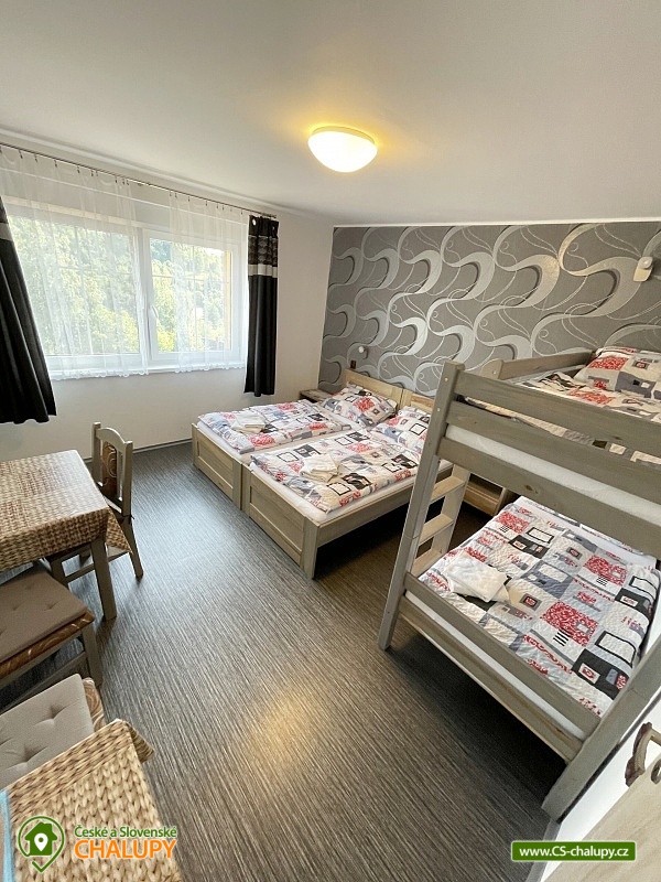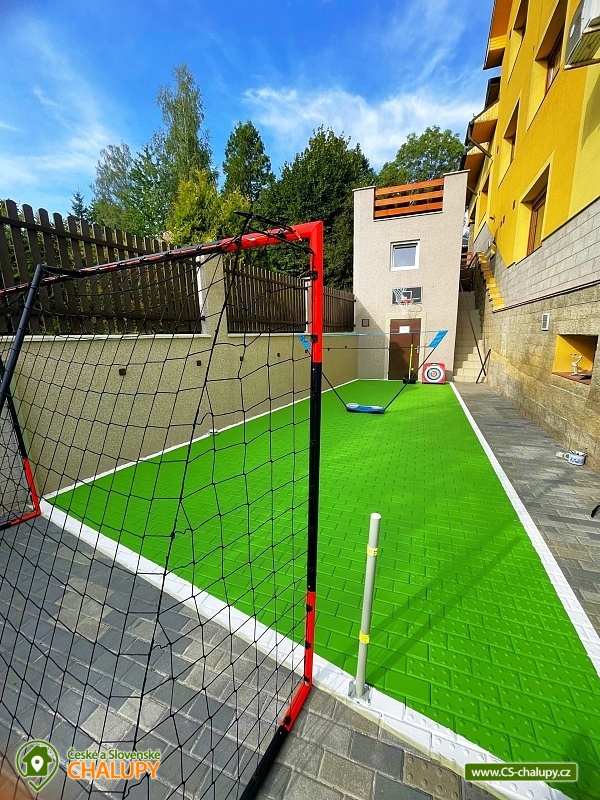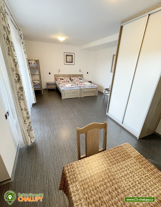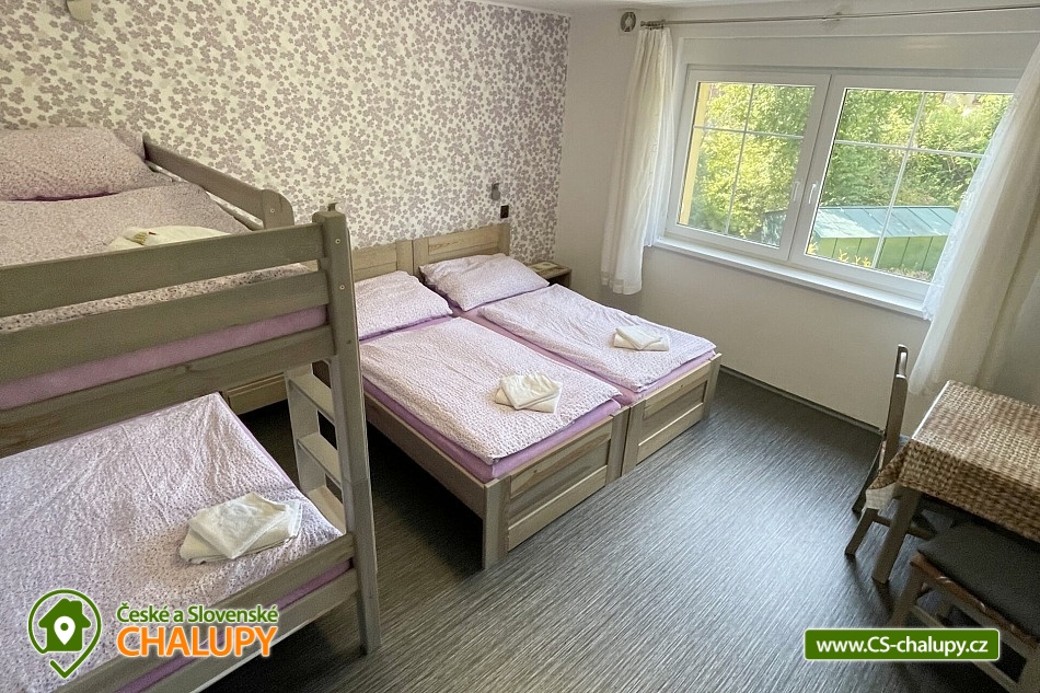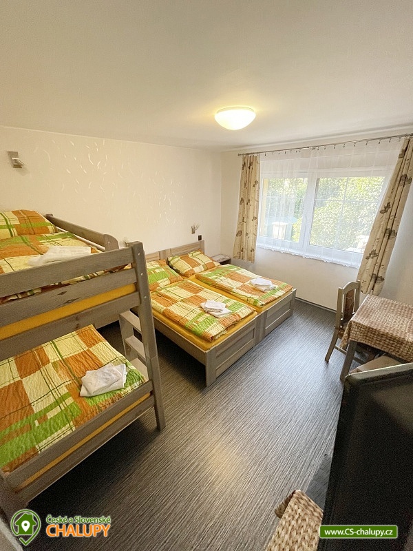 The Maxovo království apartment cottage is located on the outskirts of the town of Rovensko pod Troskami, in the very heart of the Bohemian Paradise. Its location makes it a great starting point for trips to popular tourist destinations such as Trosky Castle, Hruboskalsko, Malá Skála or the fairy-tale town of Jičín. Suitable for families with children, a group of friends, cyclists or corporate teambuildings. You can look forward to an outdoor and indoor swimming pool, sauna, terrace with seating or a games room equipped with billiards, table football or darts. The property offers accommodation for 36 people, in 10 separately rentable apartments. Each apartment has a fully equipped kitchen (ceramic hob, electric kettle, fridge, microwave and dishes), a dining area and a bathroom with a bathtub/shower, sink and toilet. The apartments are 2-bed or 4-bed (in the bedrooms where there are 2 single beds, they can be combined into a double bed) and are located on the ground floor and on the 1st floor. Possibility to rent a cot. APARTMENT No. 1 (1st floor, max. 2 people): 1x double bedroom (2x single beds), TV, kitchen, bathroom with shower and separate toilet, view of the town of Rovensko pod Troskami. APARTMENT No. 2 (1st floor, max. 4 people): 1x four-bed bedroom (2x single beds, 1x bunk bed), TV, kitchen, bathroom with shower and separate toilet, view of the town of Rovensko pod Troskami. APARTMENT No. 3 with balcony (1st floor, max. 5 people): 1x four-bed bedroom (2x single beds, 1x bunk bed + possibility of an extra bed for one person - fold-out bed), TV, kitchen, bathroom with shower and toilet, view of the town of Rovensko pod Troskami. APARTMENT no. 4 with balcony (1st floor, max. 3 people): 1x double bedroom (2x single beds + possibility of an extra bed for one person - fold-out bed), TV, kitchen, bathroom with bath and separate toilet, view of the town of Rovensko pod Troskami and Trosky Castle. APARTMENT no. 5 with balcony (1st floor, max. 3 people): 1x double bedroom (2x single beds + possibility of an extra bed for one person - fold-out bed), TV, kitchen, bathroom with shower and toilet, view of the Trosky Castle. APARTMENT no. 6 with balcony (1st floor, max. 5 persons): 1x four-bed bedroom (2x single beds, 1x bunk bed + possibility of an extra bed for one person - a fold-out bed), TV, kitchen, bathroom with shower and separate toilet, view of Trosky Castle and the garden. APARTMENT no. 7 (1st floor, max. 4 persons): 1x four-bed bedroom (2x single beds, 1x bunk bed), TV, kitchen, bathroom with shower and separate toilet, view of the garden. APARTMENT no. 8 (1st floor, max. 2 persons): 1x double bedroom (2x single beds), TV, kitchen, bathroom with shower and separate toilet, view of the garden. APARTMENT no. 9 (1st floor, max. 4 people): 1x four-bed bedroom (2x single beds, 1x bunk bed), TV, kitchen, bathroom with shower and separate toilet, garden view. APARTMENT No. 10 DELUX (ground floor, max. 4 people): 1x four-bed bedroom (1x large double bed, 1x bunk bed), TV, kitchen, bathroom with shower and toilet, view of the town of Rovensko pod Troskami and outdoor pool. There are 3 more toilets in the accommodation (2x in the common room, 1x by the indoor pool). There is a common room with seating for up to 36 people, equipped with a TV, projector, screen and bulletin board. Here you can organize a family celebration, a meeting of friends or a company teambuilding. Possibility of providing breakfast, catering, wine tasting, homemade cheeses and sausages or the possibility of inviting a grillmaster. There is also karaoke, beer pong, a shared kitchen (complete with a large refrigerator, a convection oven, a dishwasher, a Dallmayer coffee maker and a portable tap). For relaxation, there is an indoor pool (6x3m, depth 150 cm) and a Finnish sauna (preheated to 100 °C) with a relaxation zone. There is also a games room equipped with billiards, table football, a darts machine, a large-screen TV, stylish seating and two arcade machines. The building is heated by underfloor heating, and there are also electric heating ladders in the bathrooms. The cottage is surrounded by a fenced garden with a grassy area. There is a roofed terrace with benches, tables and a large grill. On this terrace you will also find a fireplace with seating. There is free Wi-Fi internet access throughout the building and on the terrace. In the immediate vicinity of the accommodation there is an outdoor swimming pool (6x3m, depth 150 cm), a garden swing and a seating area with a fireplace and a smokehouse. The little ones will appreciate the fenced children's playground with a sunken trampoline, slide and swings. Parking directly at the property (max. 10 cars) on a fenced, camera-guarded plot. It is also possible to use a second, 50 m away, parking lot (max. 5 cars). In the vicinity of the property there is the possibility of hiking, cycling, swimming, rafting, mushroom picking, fishing and winter sports. In the town you can use the nearby football field, children's playground with refreshments, outdoor ice rink or tennis courts. Swimming options include: outdoor pool Železný Brod, aquapark Liberec, aquapark Turnov, Jinolické ponds, Sedmihorky with a sandy beach, Vidlák pond, Malá Skála - Žlutá plovárna or Bělá u Turnova swimming pool. Nearby ski resorts are: Kozákov, Turnov - Struhy, Nad Nádražím - Semily or Koberovy - Hamštejn. The surrounding area is attractive for trips: Hrubá Skála, Malá Skála, Vranov Castle - Pantheon, Kopicův statek - sandstone sculptures carved into the rocks, Sedmihorky spa, Kozákov lookout tower, Hamštejn lookout tower, inverted bells on the bell tower in Rovensko pod Troskami, Prachovské Rocks, Kost Castle, Valdštejn Castle, doll museum in Troskovice, Trosky Castle, Jinolické ponds, "Šťastná země" amusement park - Radvánovice, Humprecht Chateau, Bozkovske dolomite caves, Jizera Valley, Jičín - a city of fairy tales, Borecké Rocks with a view of the fallow 