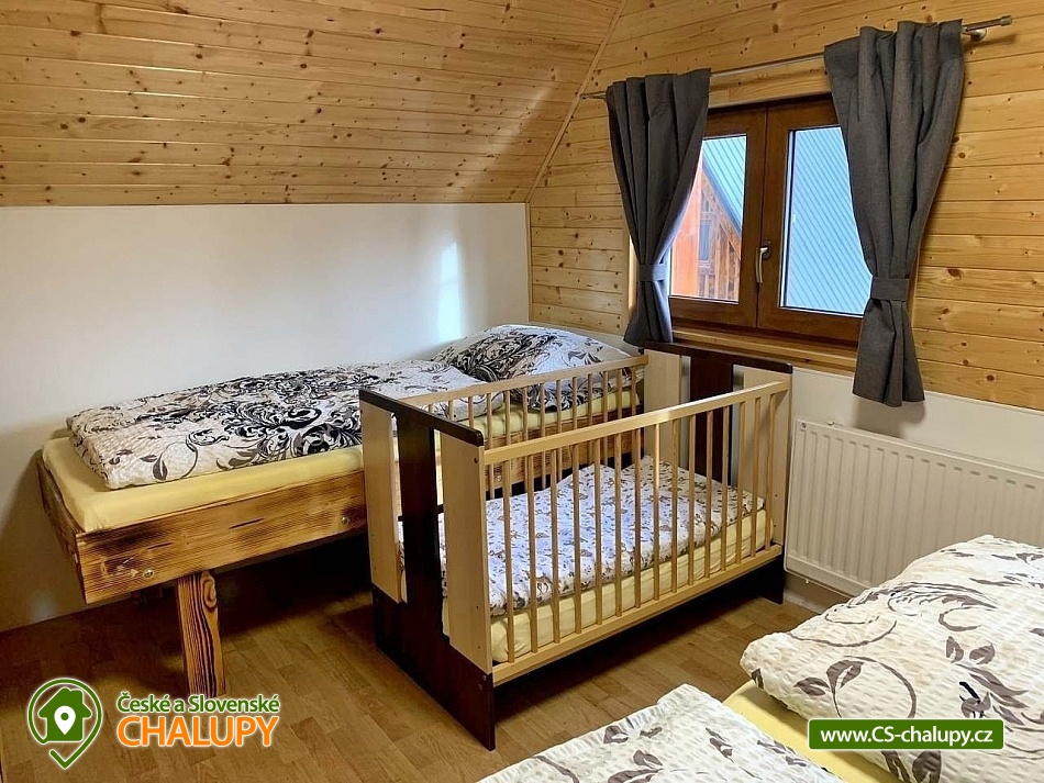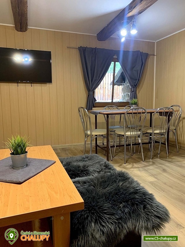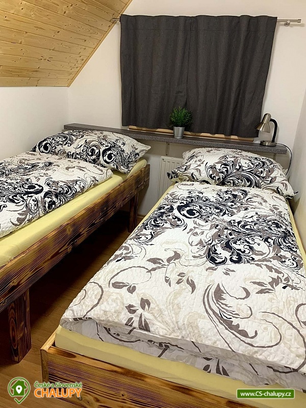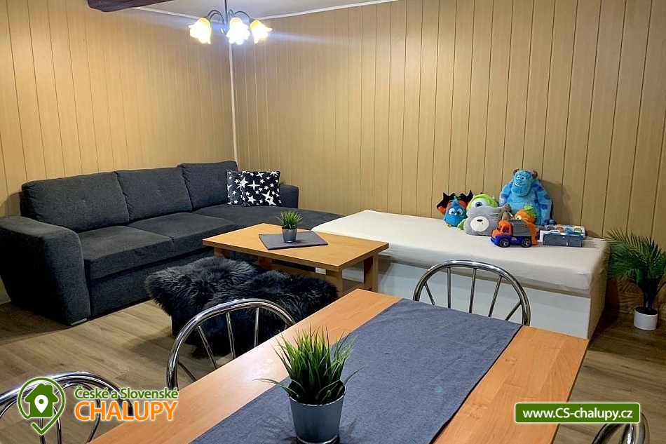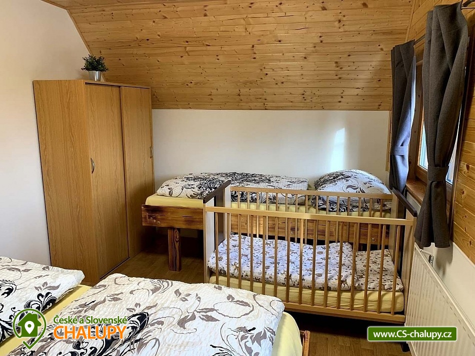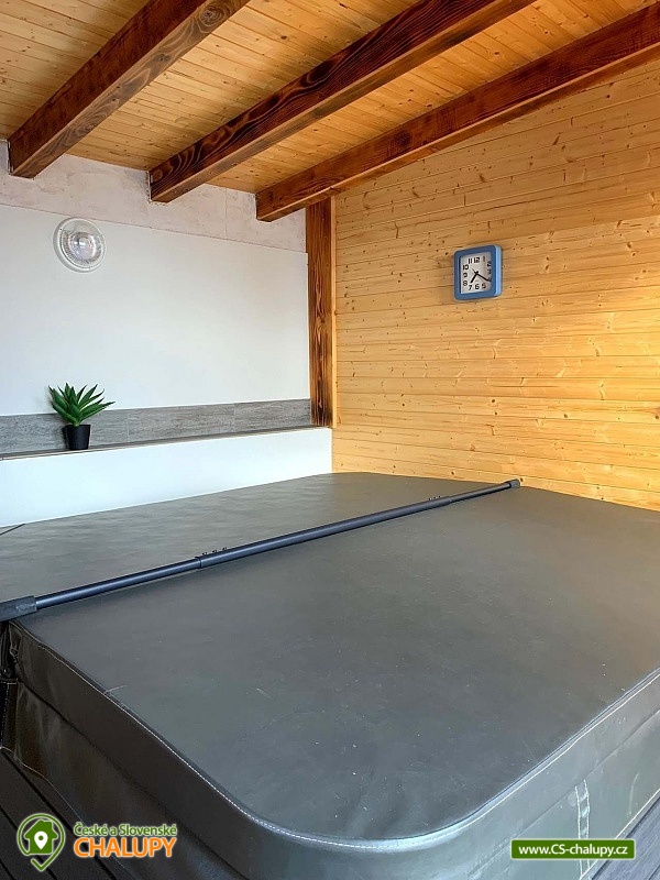 The cottage with wellness is located in the beautiful forested countryside of the Beskydy Protected Area near the village of Horní Bečva, under the Pustevny mountain pass. You can look forward to peace, privacy, relaxation in the jacuzzi and beautiful views of the surrounding mountain landscape. The cottage offers accommodation for 12 people in 5 bedrooms. Upstairs there are 3 bedrooms - 1x triple (double bed, single bed and cot) and 2x double bedrooms (two single beds). In the lowered attic (140 cm) there is a bedroom with 4 extra beds (single mattresses) and as another bedroom you can use the winter garden with a single bed on the ground floor. An extra bed on a sofa bed can be arranged by arrangement only. Upstairs in the large bedroom there is a wardrobe and bedside table, a lamp and in each of the two smaller bedrooms there is a chest of drawers and a lamp. On the ground floor of the cottage there is a vestibule, winter garden, hall, kitchen, living room, two bathrooms and a toilet. The living room includes a fireplace, a 43" TV, a sofa set extended by a bed, a coffee table, 2 stools and a dining table with 6 chairs. The room is connected to a fully equipped kitchen (four-burner electric stove with oven, electric kettle, microwave and washing machine). There are 2 kitchen towels, a sponge, a jar for dishes and a toro cleaner, a waste bin with a bag and basic kitchen equipment for 12 people (plates, glasses, mugs, wine glasses, beer glasses, shot glasses, cutlery, a frying pan, pots, bowls, trays, cutting boards, knives, openers, wooden spoons, scrapers, ladles, a colander, etc.). There is also a winter garden with a sofa bed with a table, a single bed, a table with 3 chairs and a smaller TV. There is a children's corner in the cottage for children. with toys. In the hallway there is a clothes rack, a shoe rack for sitting, a second shoe rack, 2 clothes hangers and a large fridge with freezer. 2x bucket, broom with a shovel, a mop for wiping, a large broom, a mop rag, a classic rag, a grill brush, an axe and a wood saw are available for rent. The sanitary facilities include 3x showers, 3x toilets and 3x washbasins. The cottage has 1x bathroom with a shower and a toilet with a washbasin, 1x bathroom with a shower with a washbasin cabinet and 1x separate toilet with a washbasin. Furthermore, the wellness room with a jacuzzi has another bathroom - a bathroom with a shower and a toilet with a washbasin. Each bathroom has a hand towel, liquid hand soap, a cup for toothbrushes and a mat in front of the shower. There is 1 toilet roll in the toilet. The separate toilet includes a hand towel, liquid hand soap, a basket with a bag, a children's potty, a children's toilet seat and a children's high chair. You must bring your own body towels and other bathroom necessities. Heating is provided by a fireplace and electric underfloor heating. For the comfort of guests, the cottage windows are equipped with insect screens. WIFI internet access is available throughout the property. The cottage has a fully fenced outdoor terrace with a grill and a 15-liter goulash basin. There is also a children's playground (sandbox and chalk board). Next to the cottage, there is a wellness room with a whirlpool with an ozonator for 4 people, a seating area and a bathroom with a toilet and sink. A tennis court can be used under the cottage (150m) by arrangement and for an additional fee. Parking is available directly at the property. There are 4 parking spaces available. A well-maintained asphalt road leads to the cottage, which is easily accessible even in winter. In the vicinity of the cottage there are opportunities for hiking, cycling, swimming, mushroom picking, fishing, in-line skating, ice skating, skiing, snowboarding and cross-country skiing. Nearby there are tennis courts, bowling, a golf course, minigolf and a riding school. Swimming options include: swimming biotope - Prostřední Bečva, dam - Horní Bečva, swimming pool Hutisko - Solanec, swimming pool Vigantice, swimming pool Rožnov pod Radhoštěm, swimming pool Velké Karlovice, swimming pool Frenštát pod Radhoštěm, swimming pool Velké Karlovice, indoor swimming pool Rožnov pod Radhoštěm, aquapark Frenštát pod Radhoštěm, swimming pool Balaton, etc. There are nearby ski resorts: U Sachovy studánky - Horní Bečva, Rališka - Horní Bečva, Bílá, Kociánka, Solisko, Pod Soláněm and others. Pustevny, Radhošť, Radegast Statue, Kněhyně Nature Reserve are alluring for trips in the area. - Devil's Mill, Children's Entertainment Center - Gibon Park, Wallachian Open Air Museum - Rožnov pod Radhoštěm, Jurkovič Lookout Tower or Tatra Automobile Museum - Kopřivnice. We look forward to seeing you.